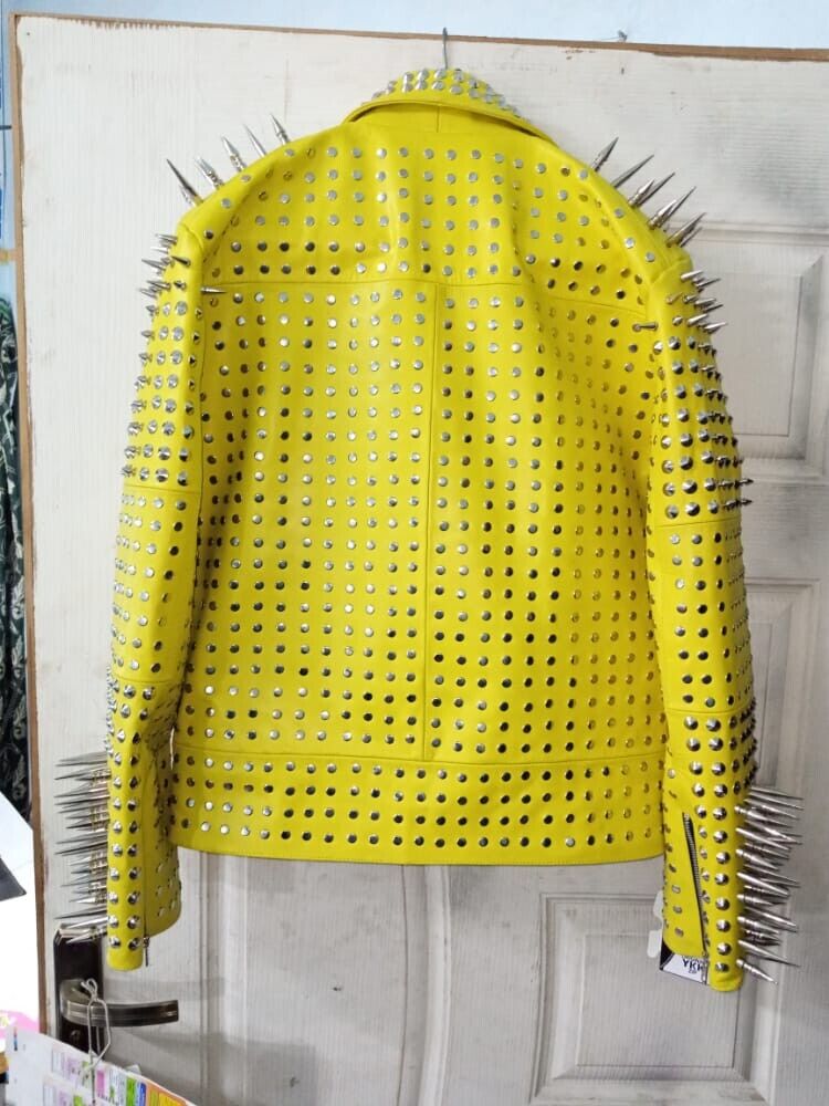 Men Brando Jacket Full yellow Punk Silver Long Spiked Studded Leather jacket