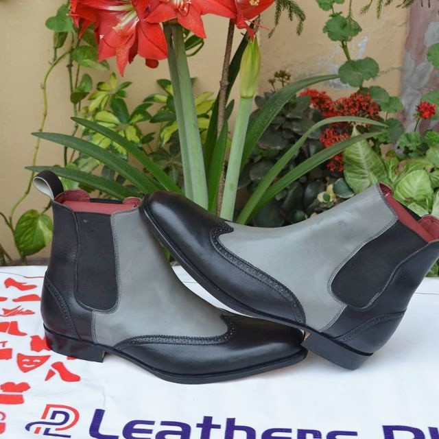 Unique Handmade Men Black Gray Wingtip Style Chelsea Boot