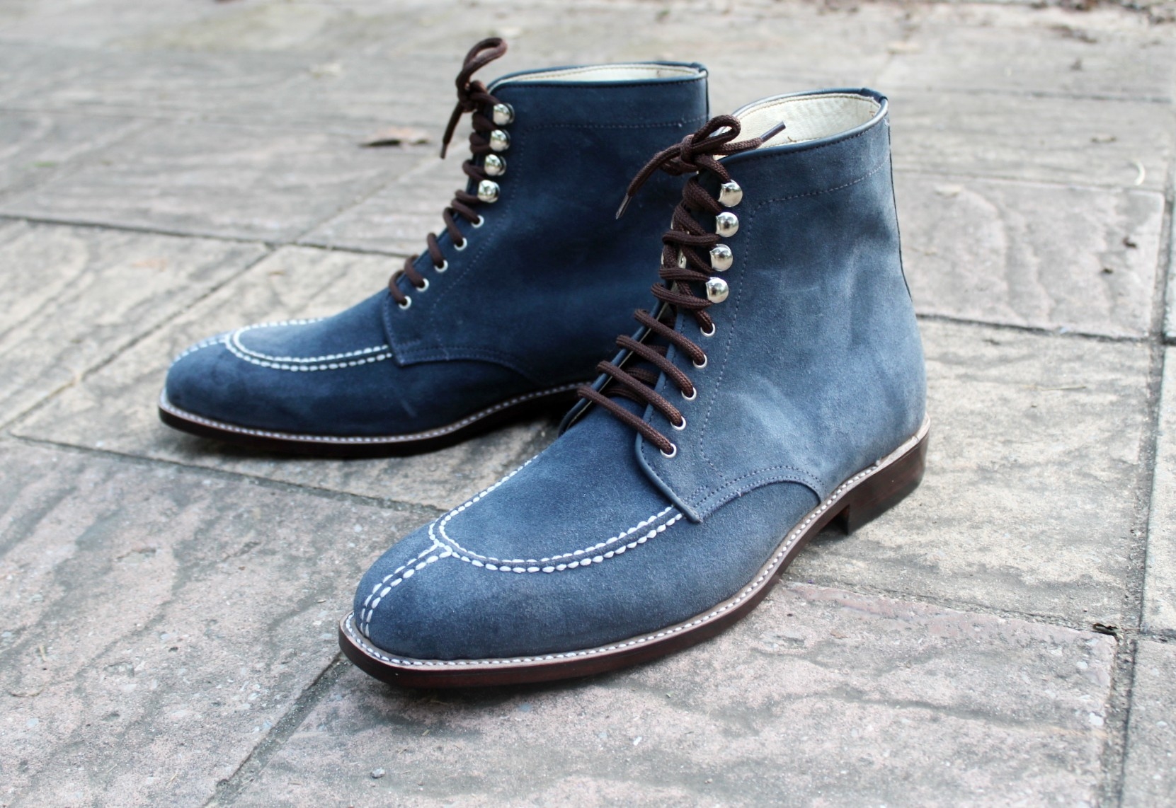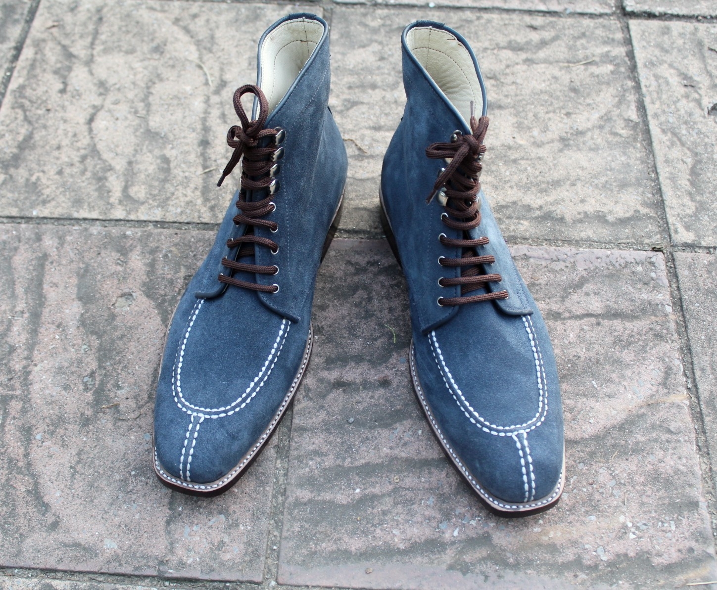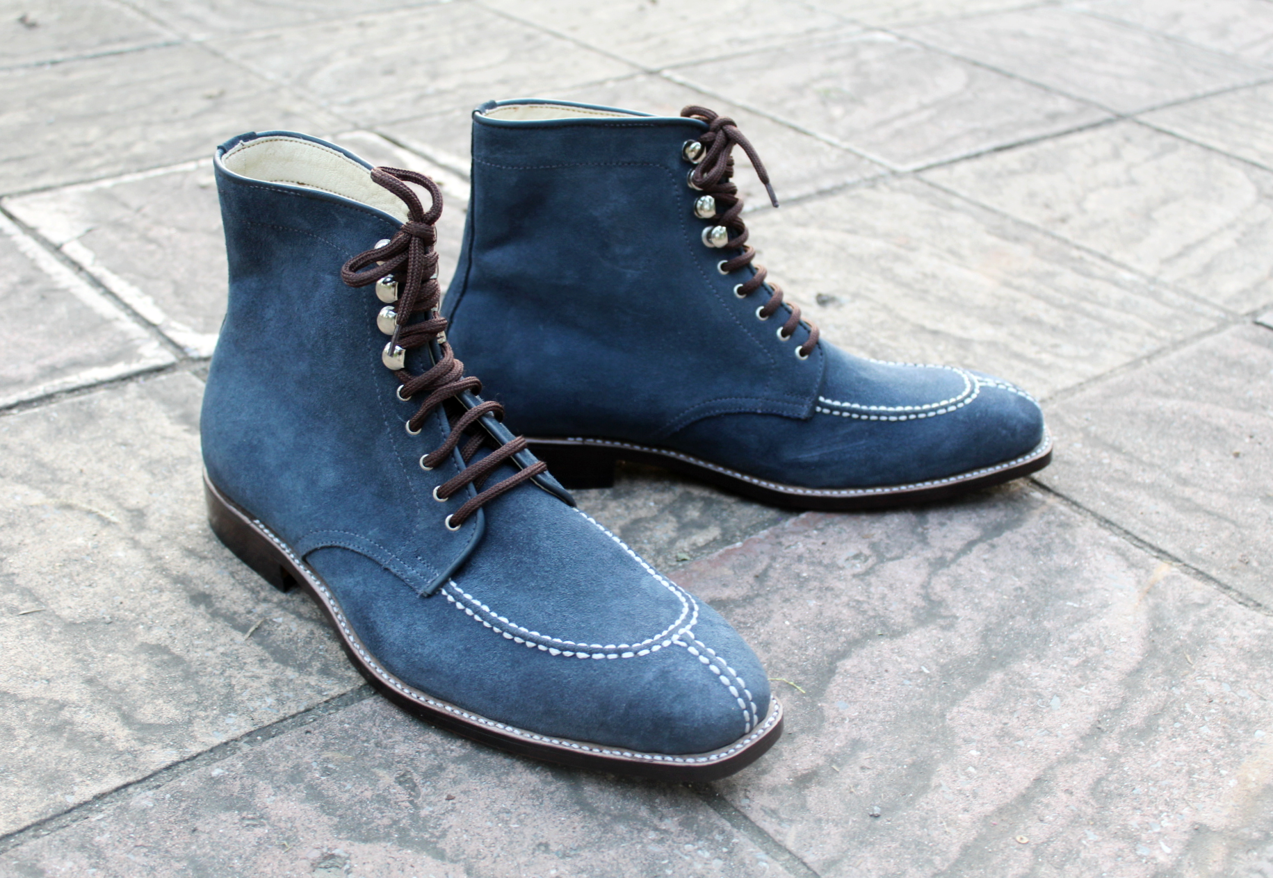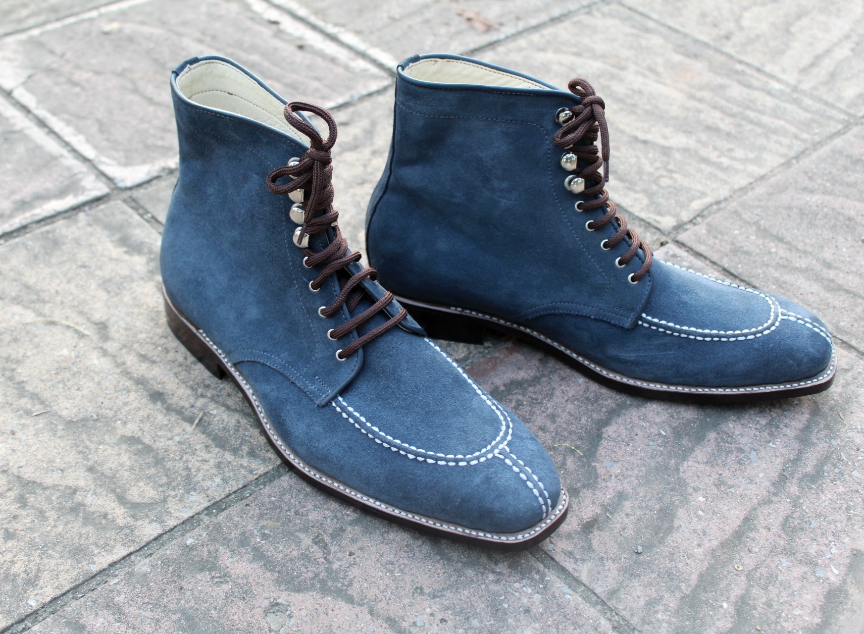 Crafted Leather Classic Handmade Blue Suede Split Toe Ankle High Lace up Boot