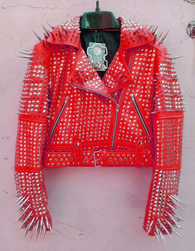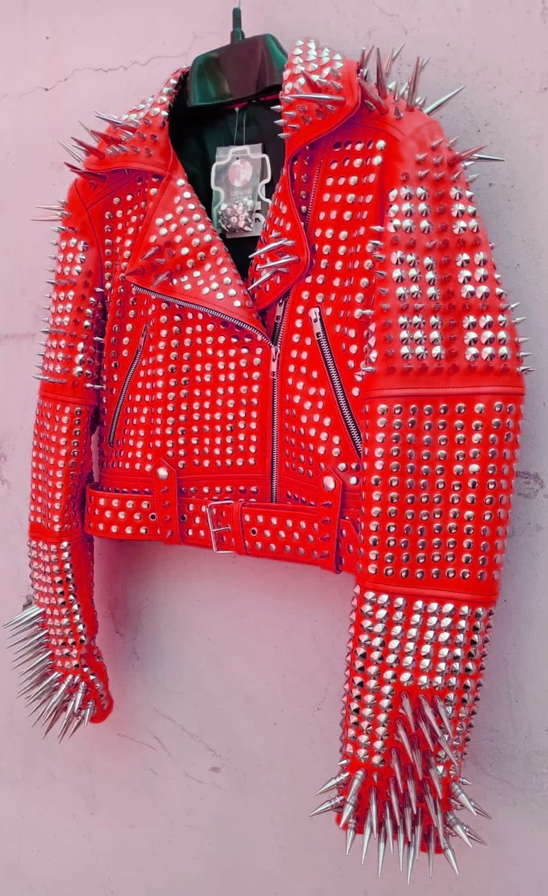 Red Awesome Women's Punk Rock Full Long Spiked Studded Brando Rusty Leather Jacket