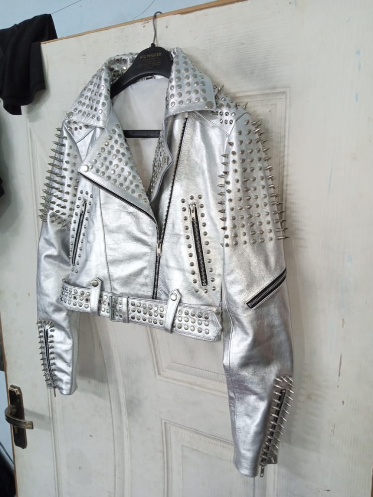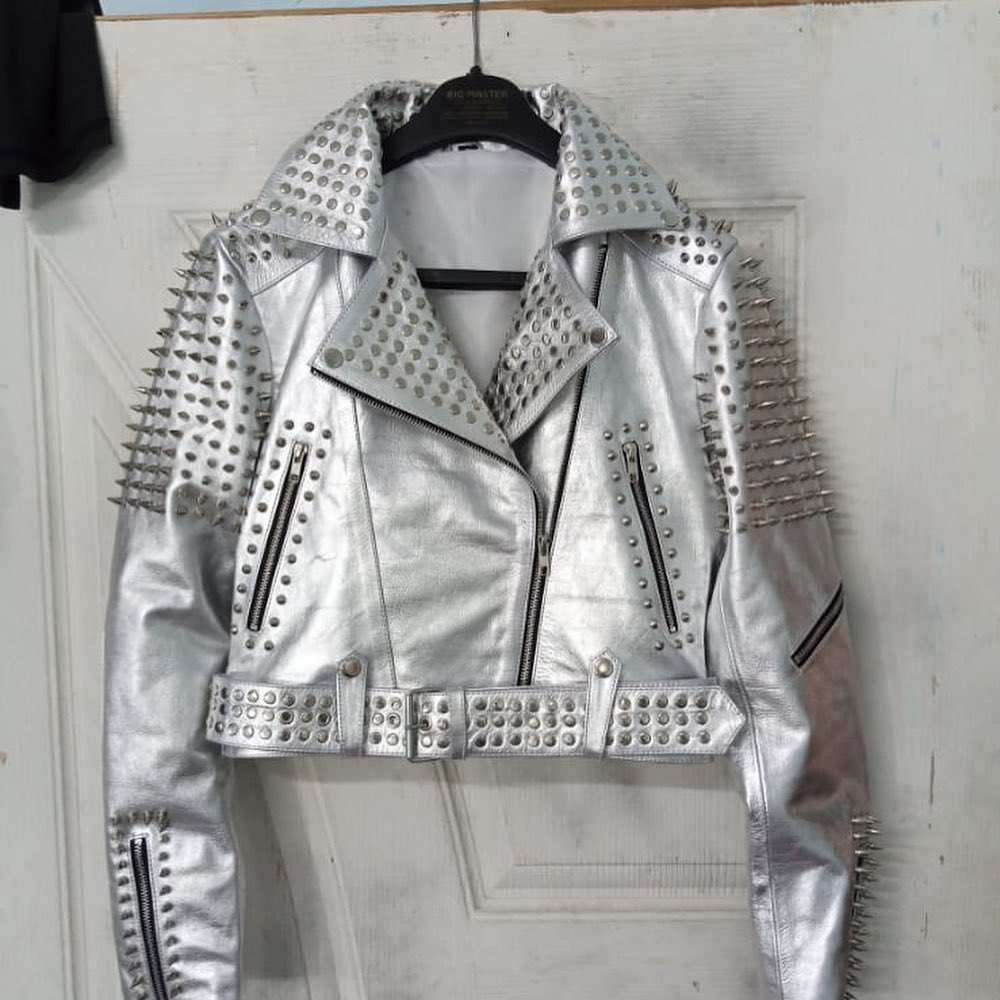 Women Silver Brando Punk Silver Spiked Studded Cowhide Leather Jacket