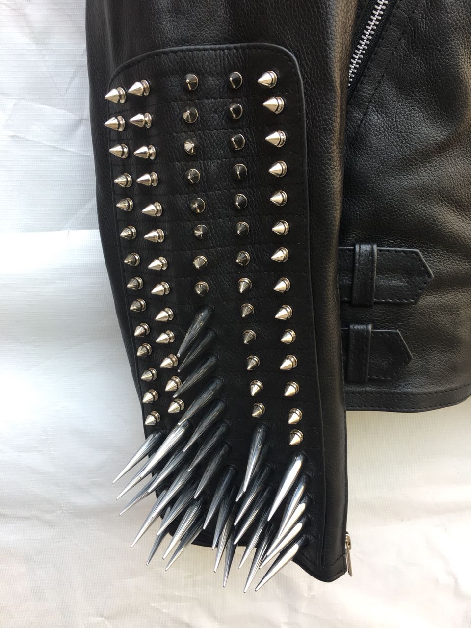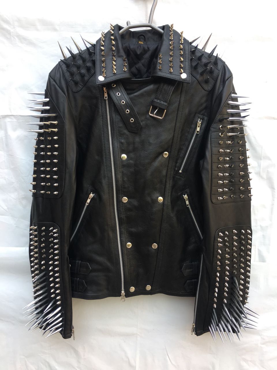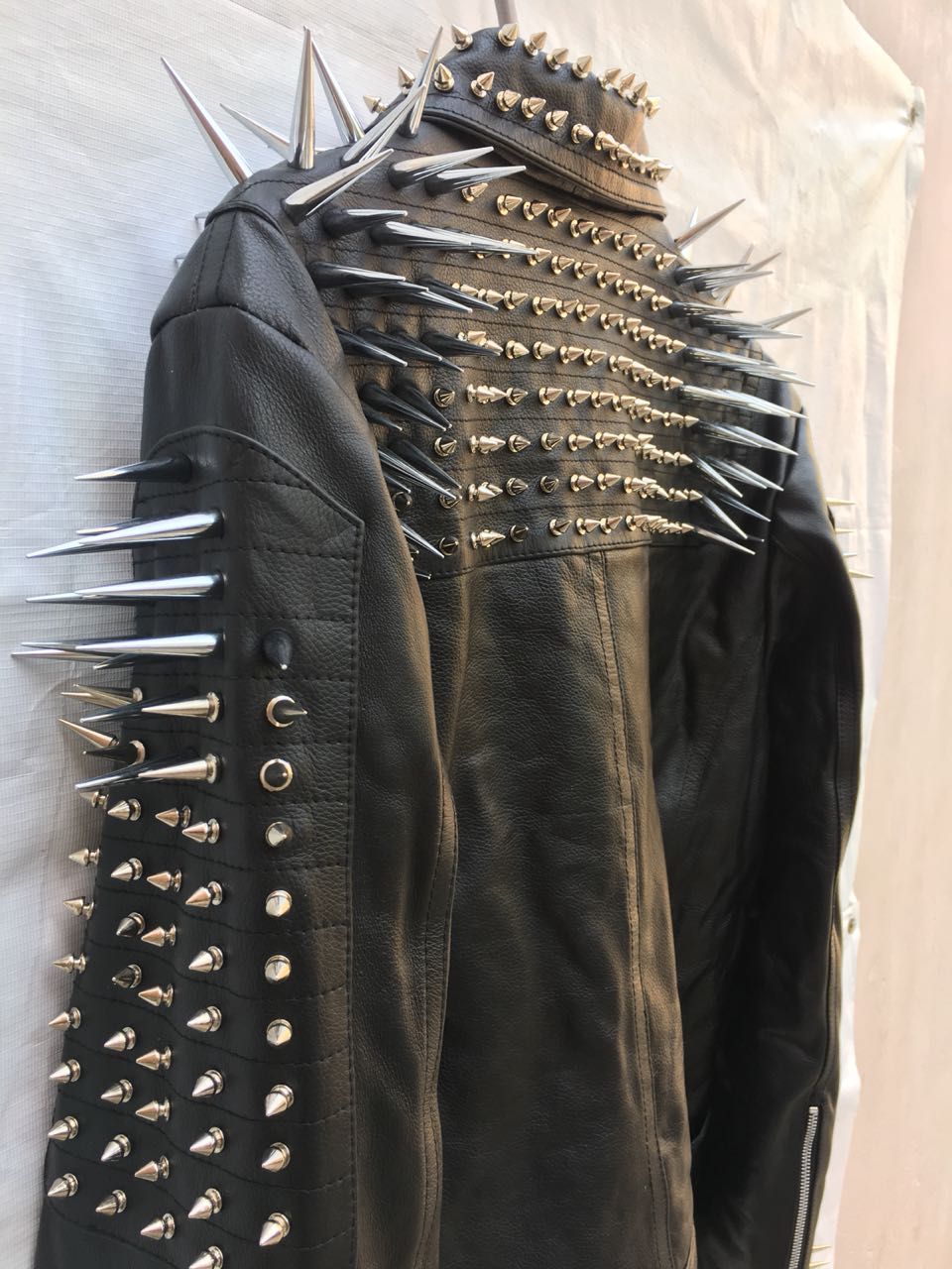 Men's Handmade Black Silver Long Spiked Studded Cowhide Leather Jacket