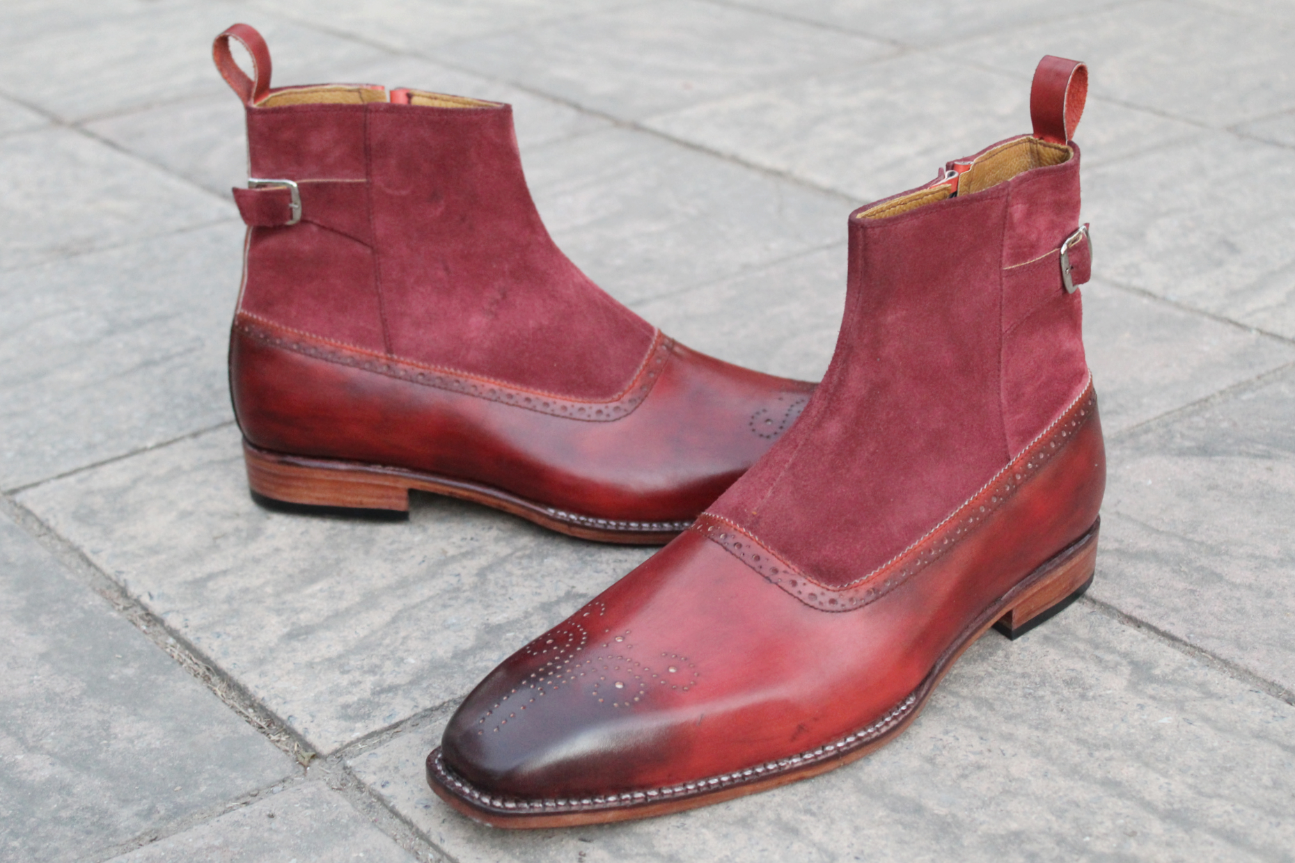 Crafted Leather Classic Men Genuine Leather and Suede Side Zipper Ankle High Buckle Strap Dress Boot