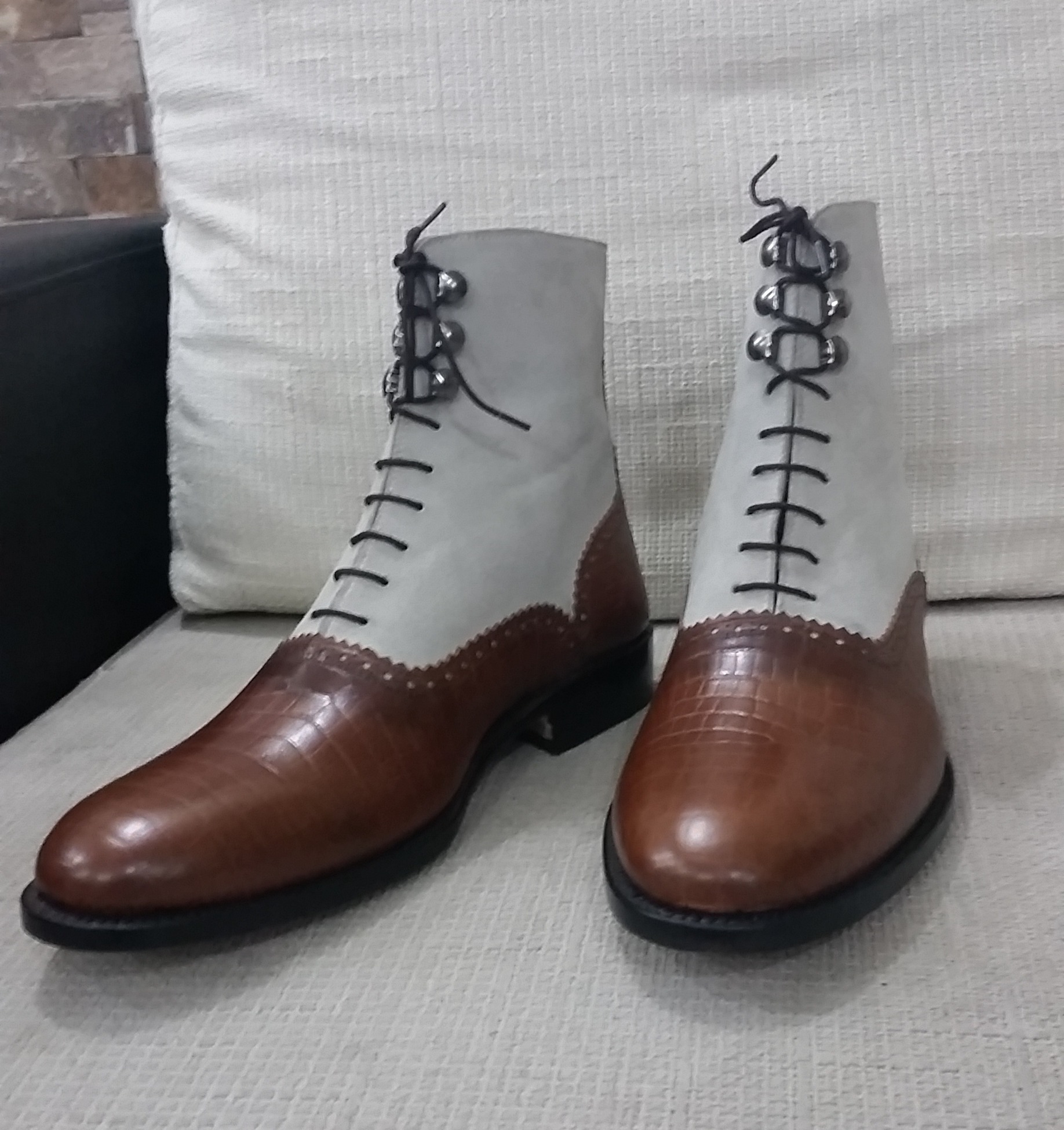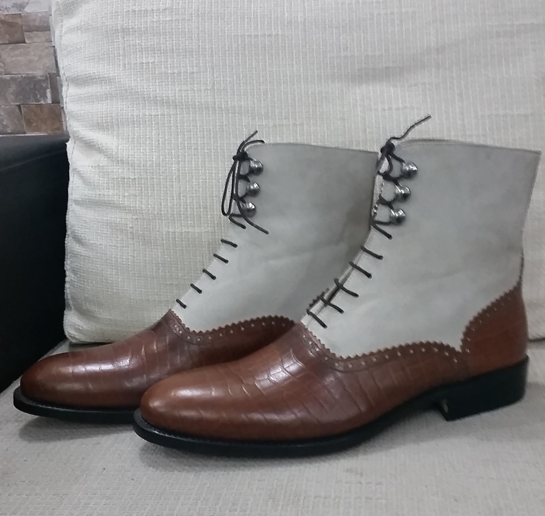 Inner: Soft Leather Sole: Leather Gender : Male Heel: Leather Color: Brown / Gray Style: Ankle High Lining Soft Calf Leather Lining Totally Hand stitched Manufacturing time 7-10 business days If you can’t find your Size/Colorjust send us message we will make for you.