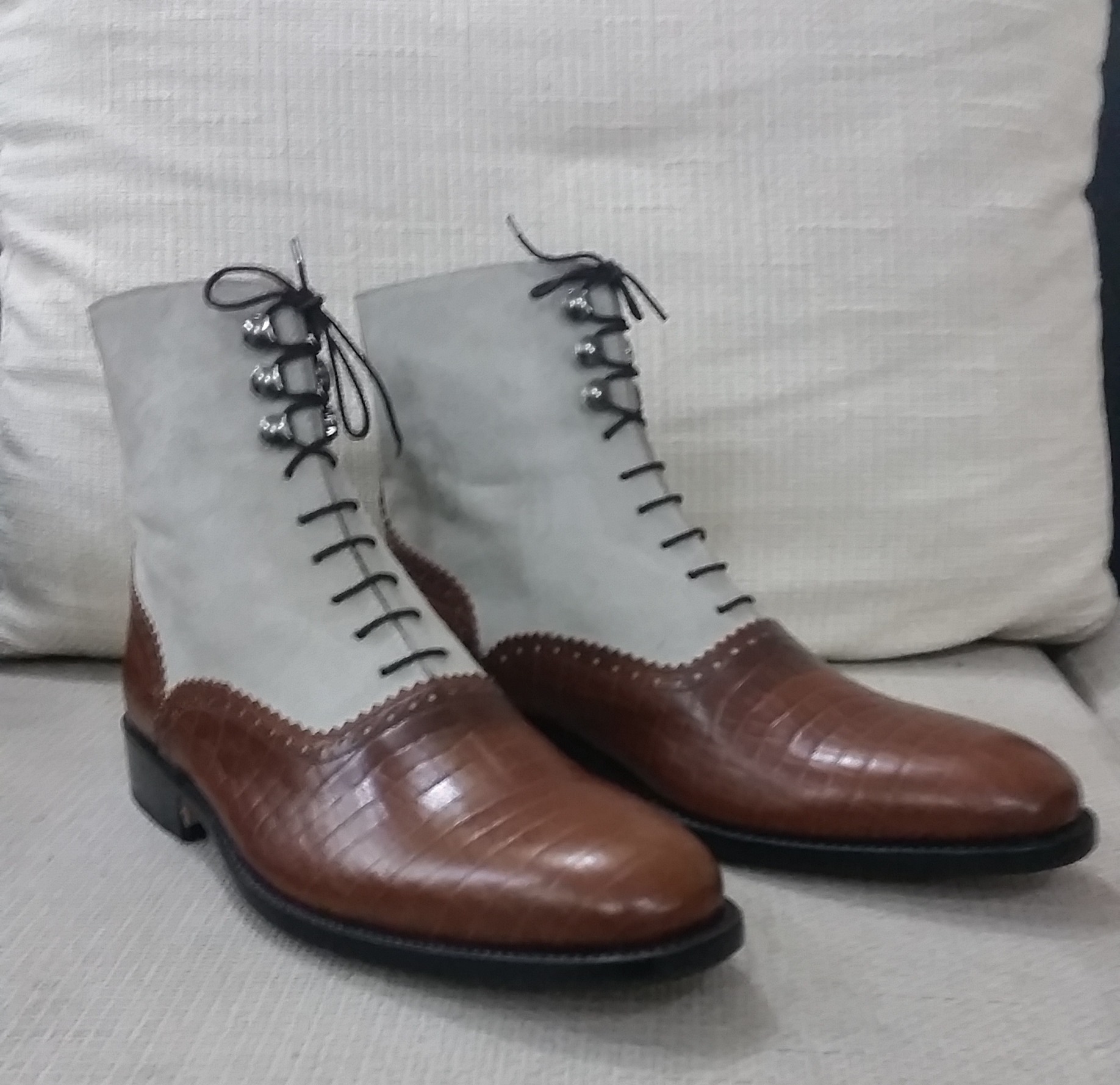 Brown Crocodile and Gray Suede Leather Ankle High Men Lace up Dress Boot