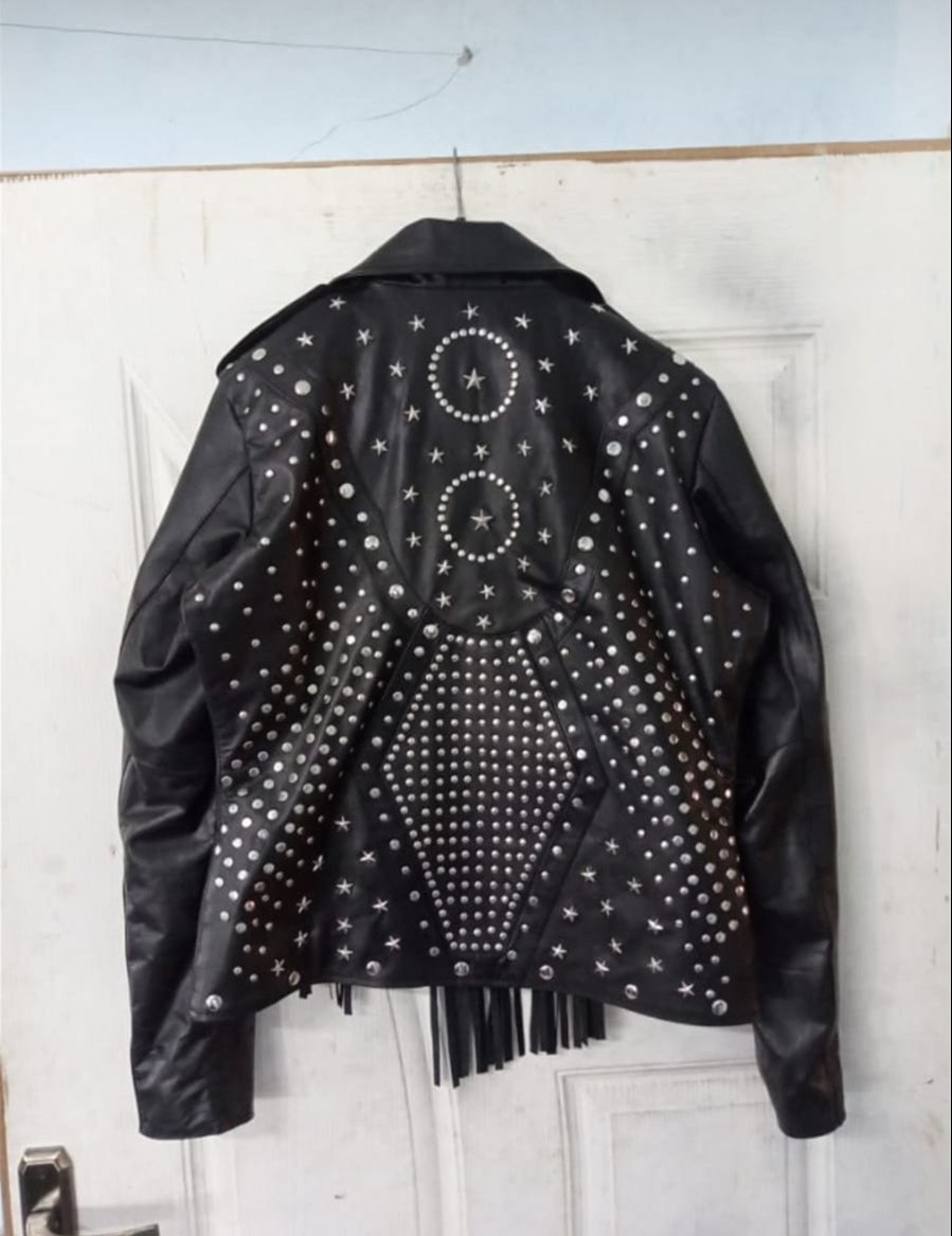 New Women Black Punk Rock Full Silver Star Studded Unique Fringes Leather Jacket