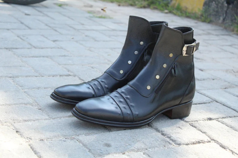 Inner: Soft Leather Sole: Leather Gender : Male Heel: Leather Color: Black Style: Italian Ankle High Boots Soft Calf Leather Lining Totally Hand stitched Manufacturing time 7-10 business days If you can’t find your Size/Color just send us message we will make for you.