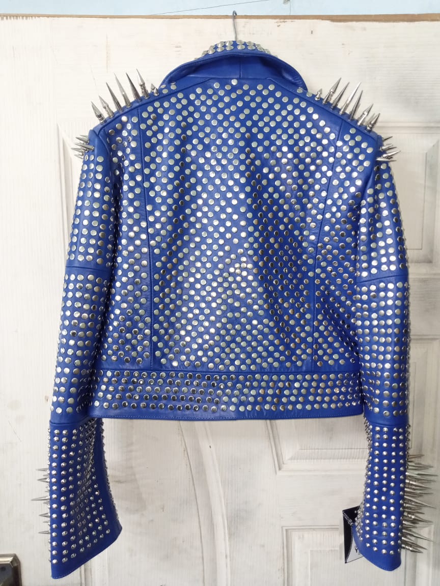 Handmade Men's Awesome Blue Punk Silver Spiked Studded Leather Brando Style Jacket