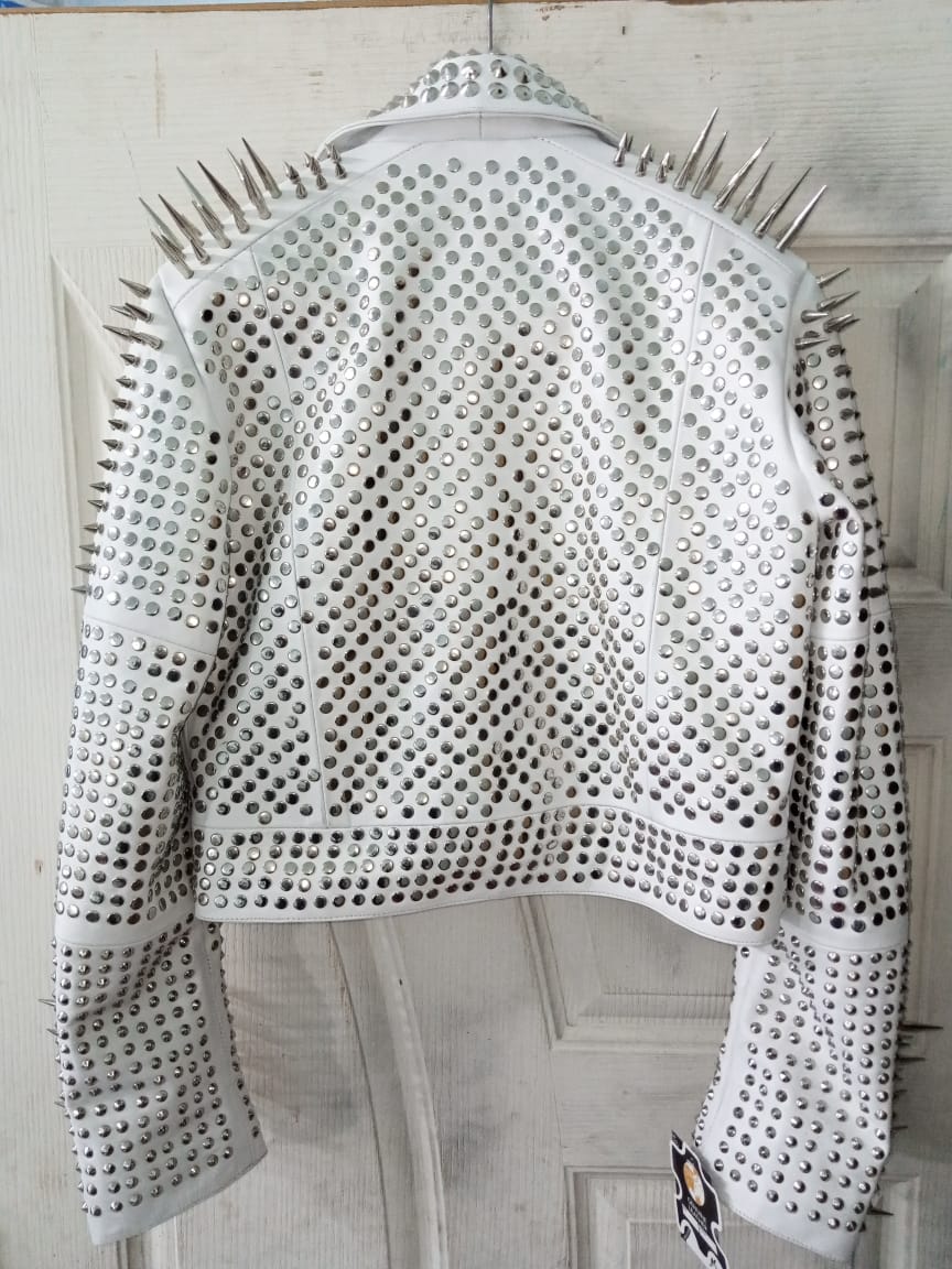 Crafted Leather New Women Full White Punk Silver Long Spiked Studded Leather Brando Biker Jacket