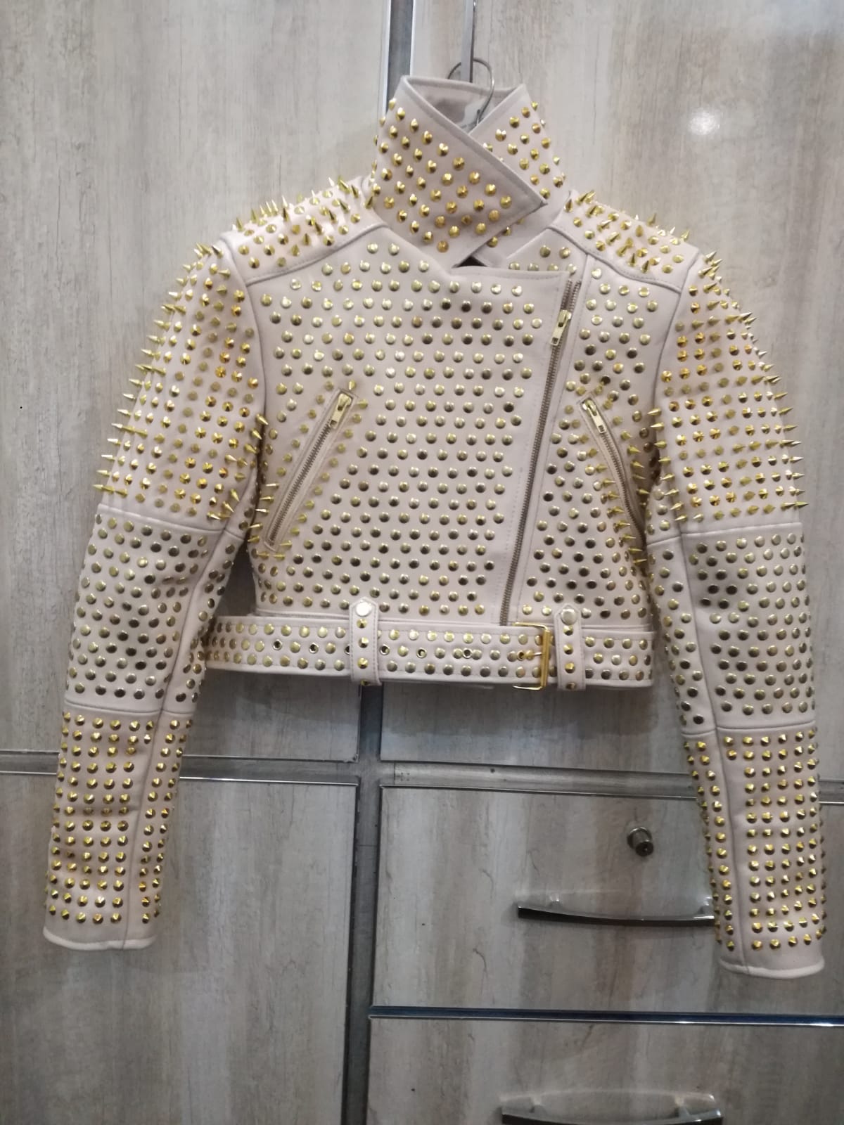 White Color Golden Spiked Studded Punk Style Women Genuine Elegant Leather Jacket