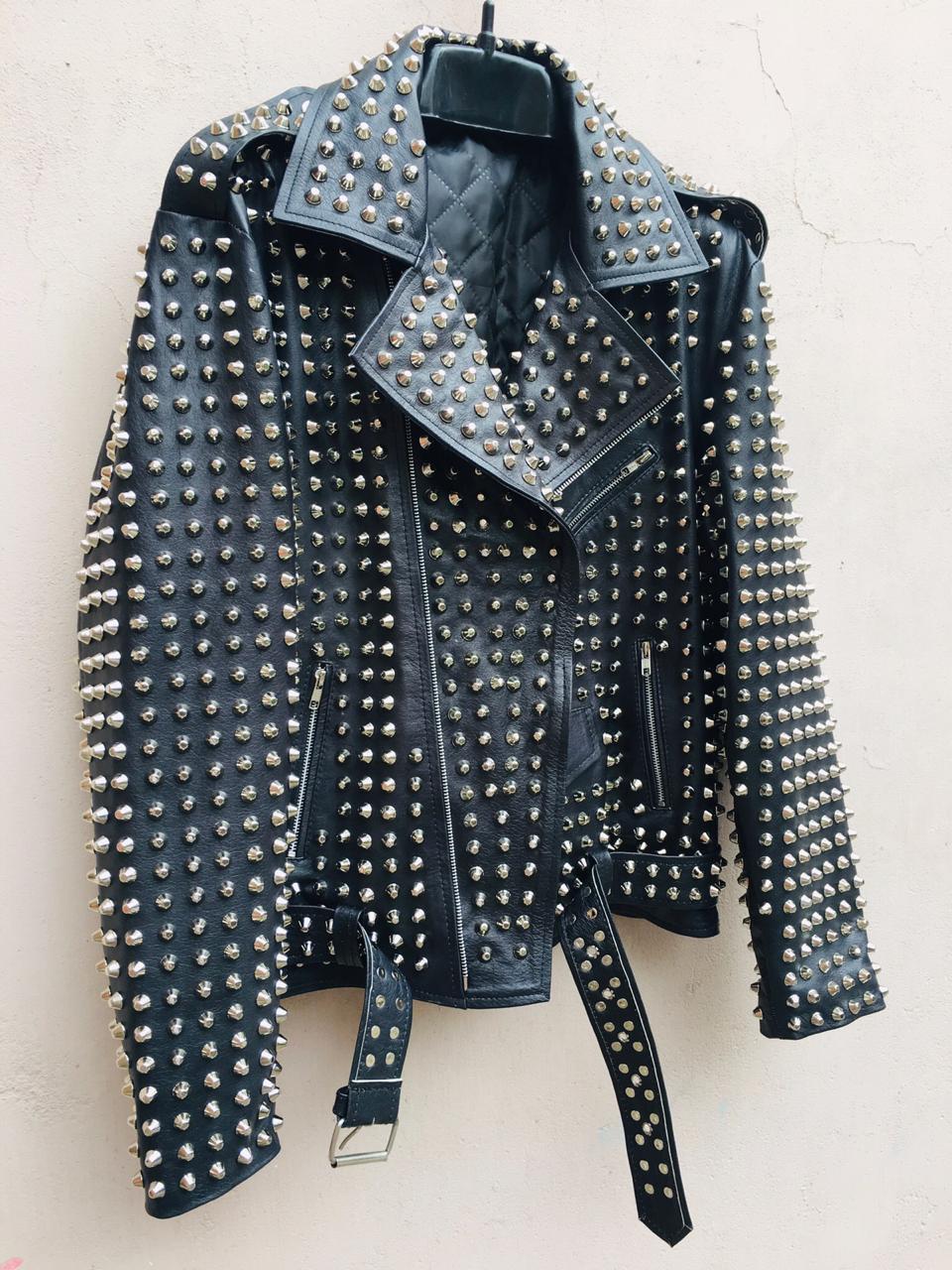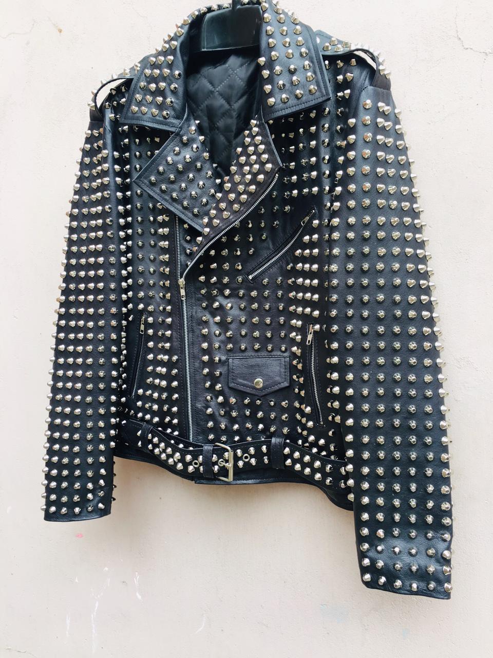 Handmade Men Full Silver Studded Punk Rock Black Leather Jacket Made By Crafted Leather