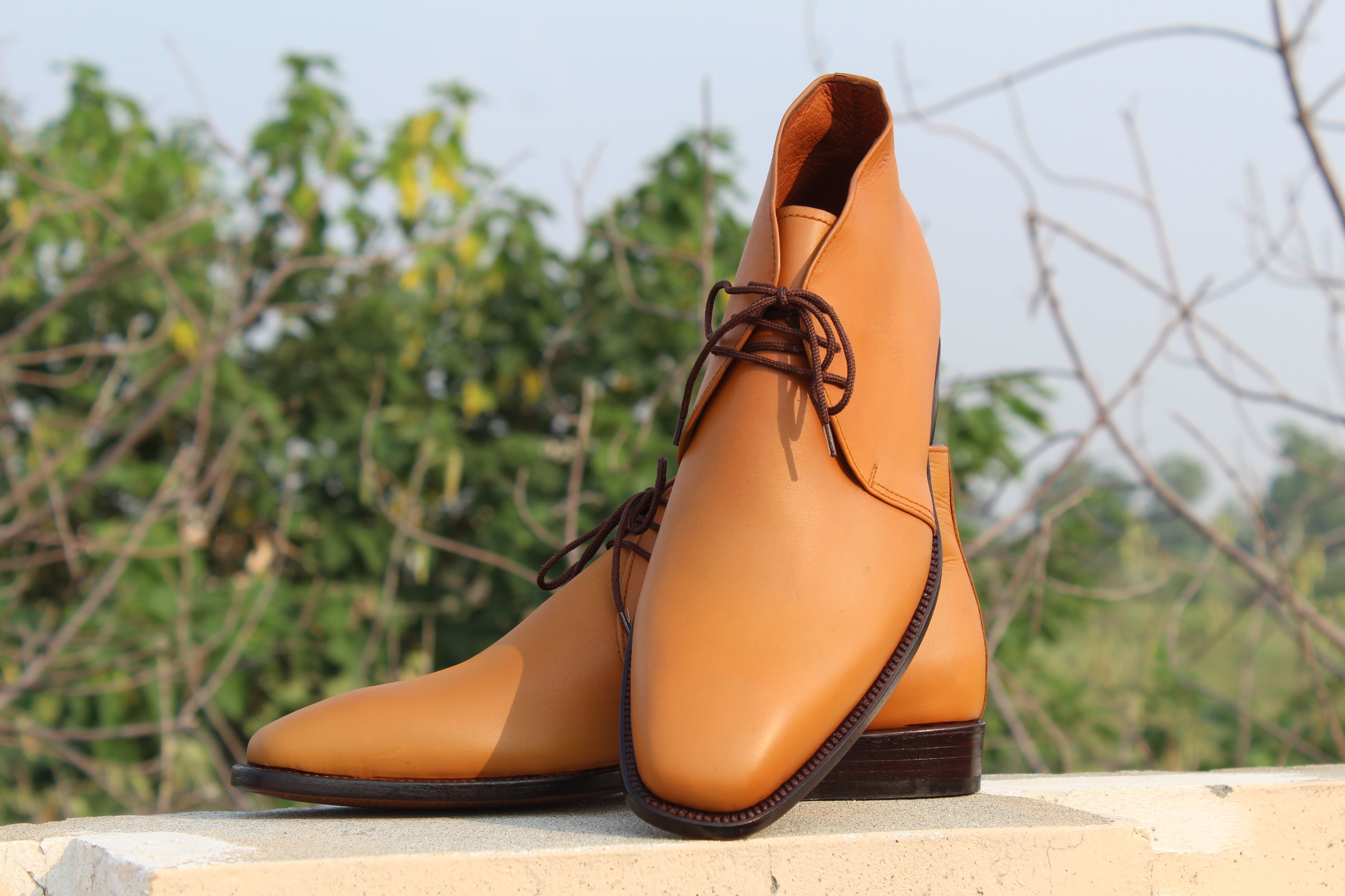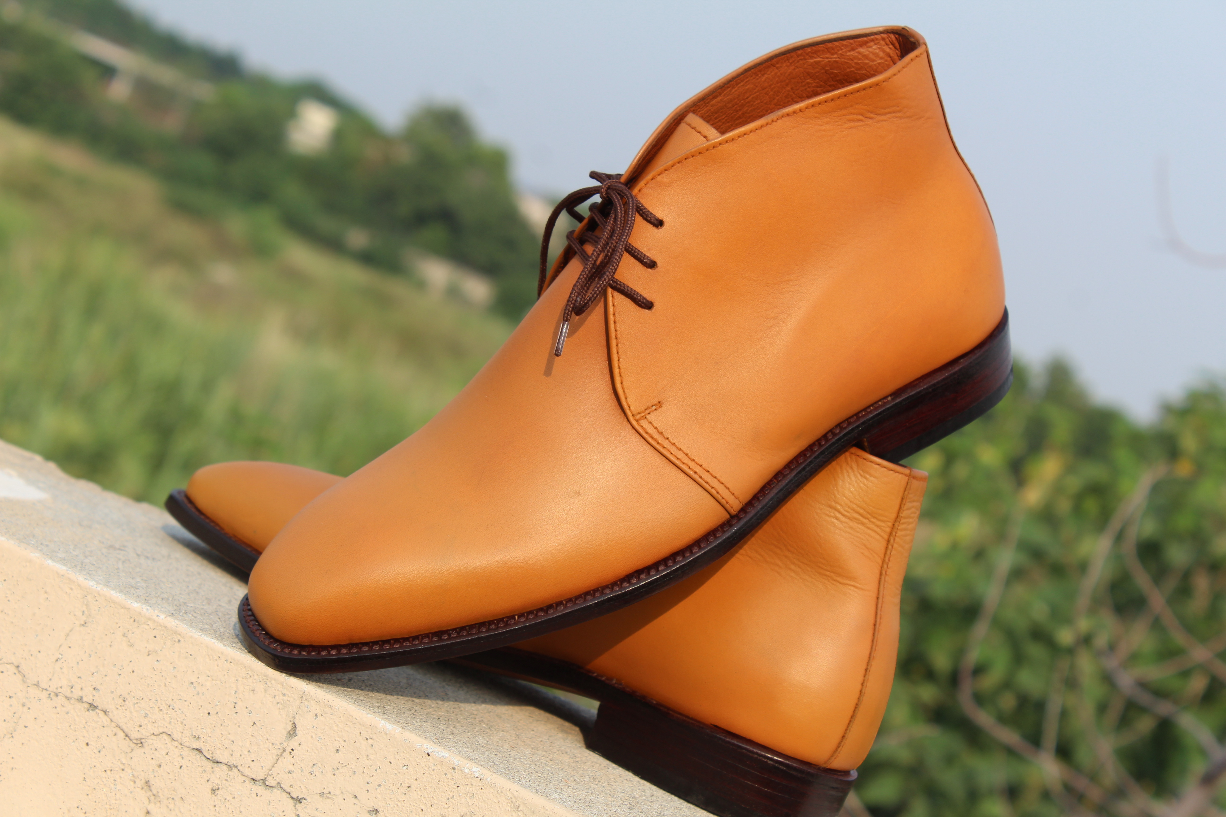 Inner: Soft Leather Sole: Leather Gender : Male Heel: Leather Color: Tan Brown Style: Chukka Boots Totally Hand stitched Manufacturing time 7-10 business days If you can’t find your Size/Color just send us message we will make for you.