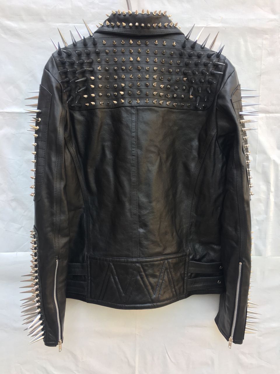 Men's Handmade Black Silver Long Spiked Studded Cowhide Leather Jacket