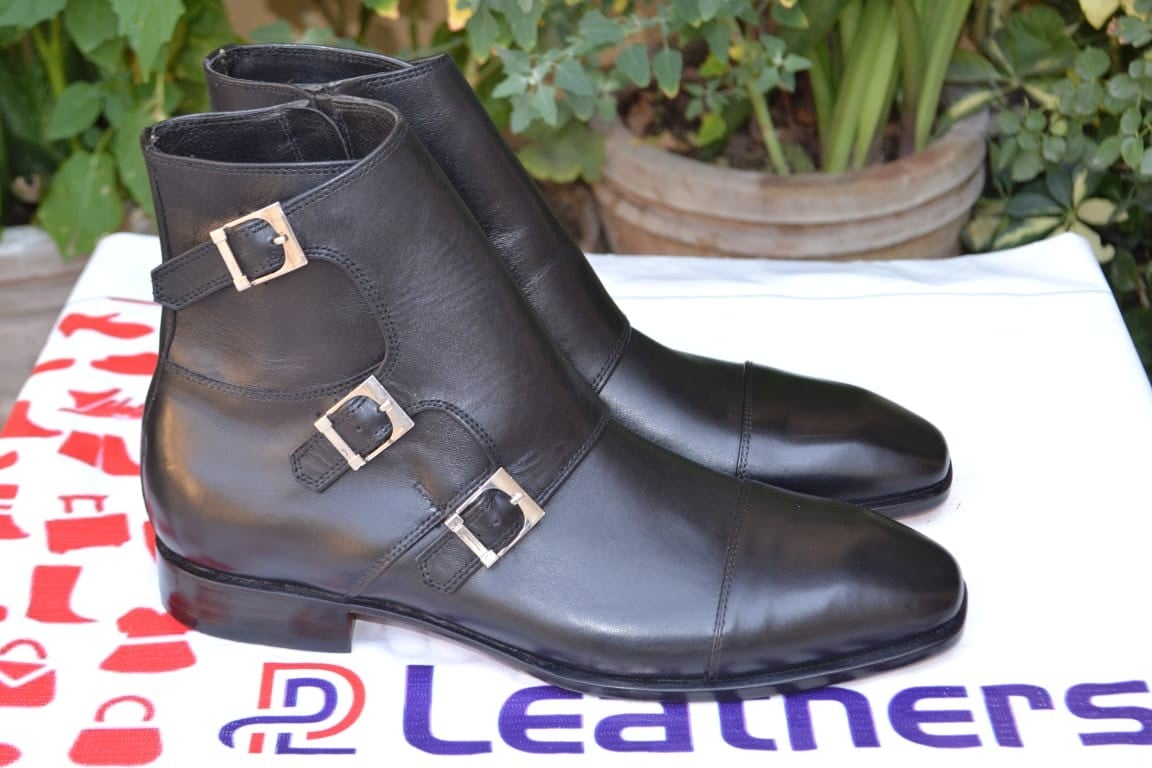 Inner: Soft Leather Sole: Leather Gender : Male Heel: Leather Color: Black Style: Triple Monk Boot Fully leather lined insoles Totally Hand stitched Manufacturing time 7-10 business days If you can’t find your Size/Colorjust send us message we will make for you.