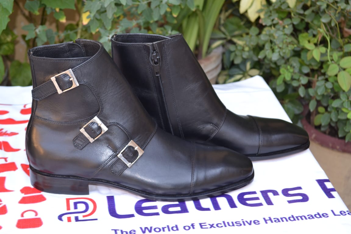 Crafted Leather Designer Triple Monk Strap Ankle High Black Leather Chukka Dress Boot