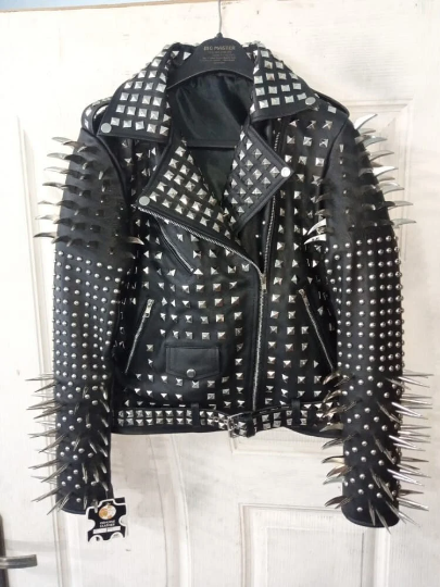 Crafted Leather New Handmade Women's Punk Full Long Spiked Studded Brando Black Adorable Leather Jacket