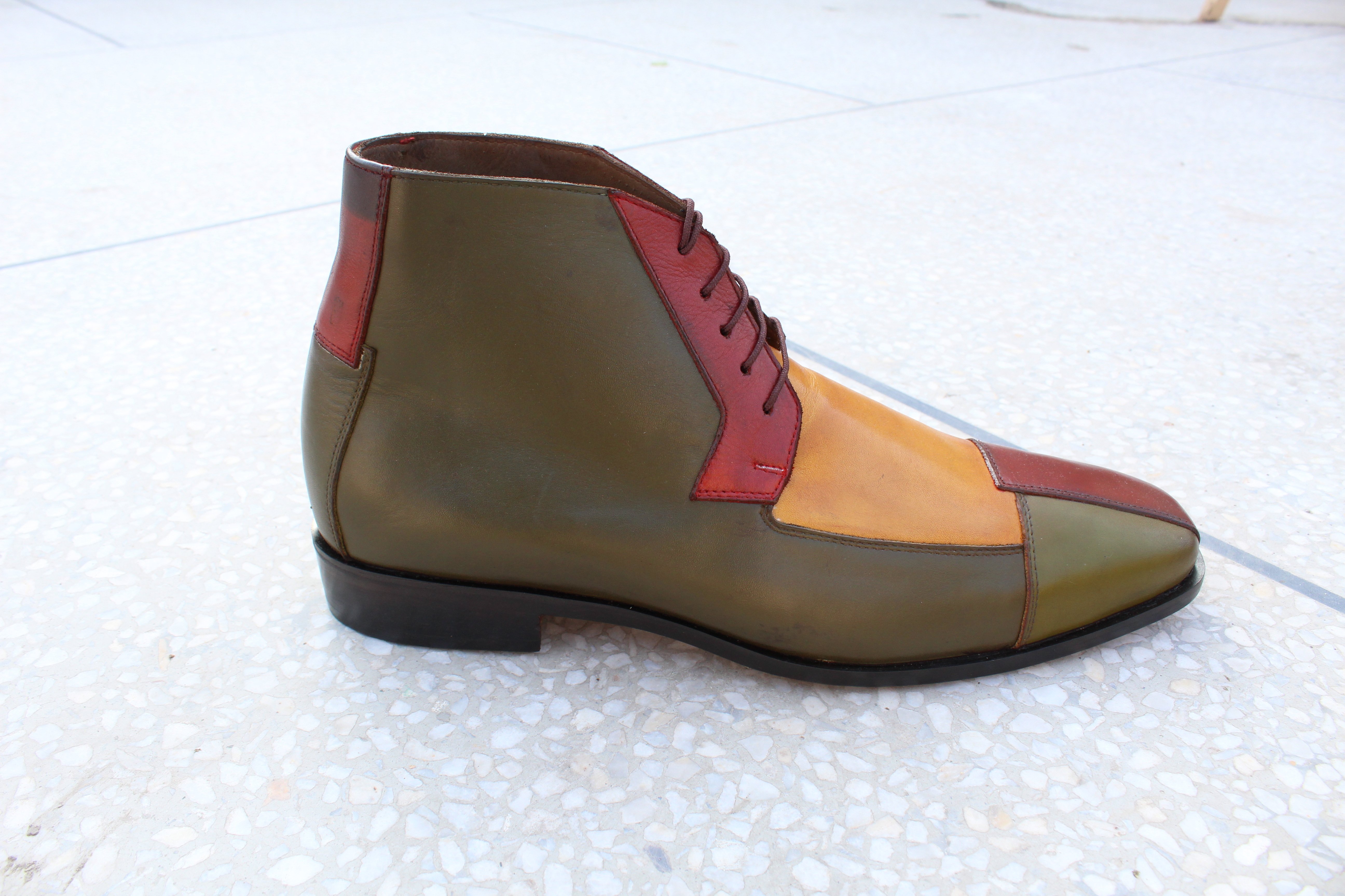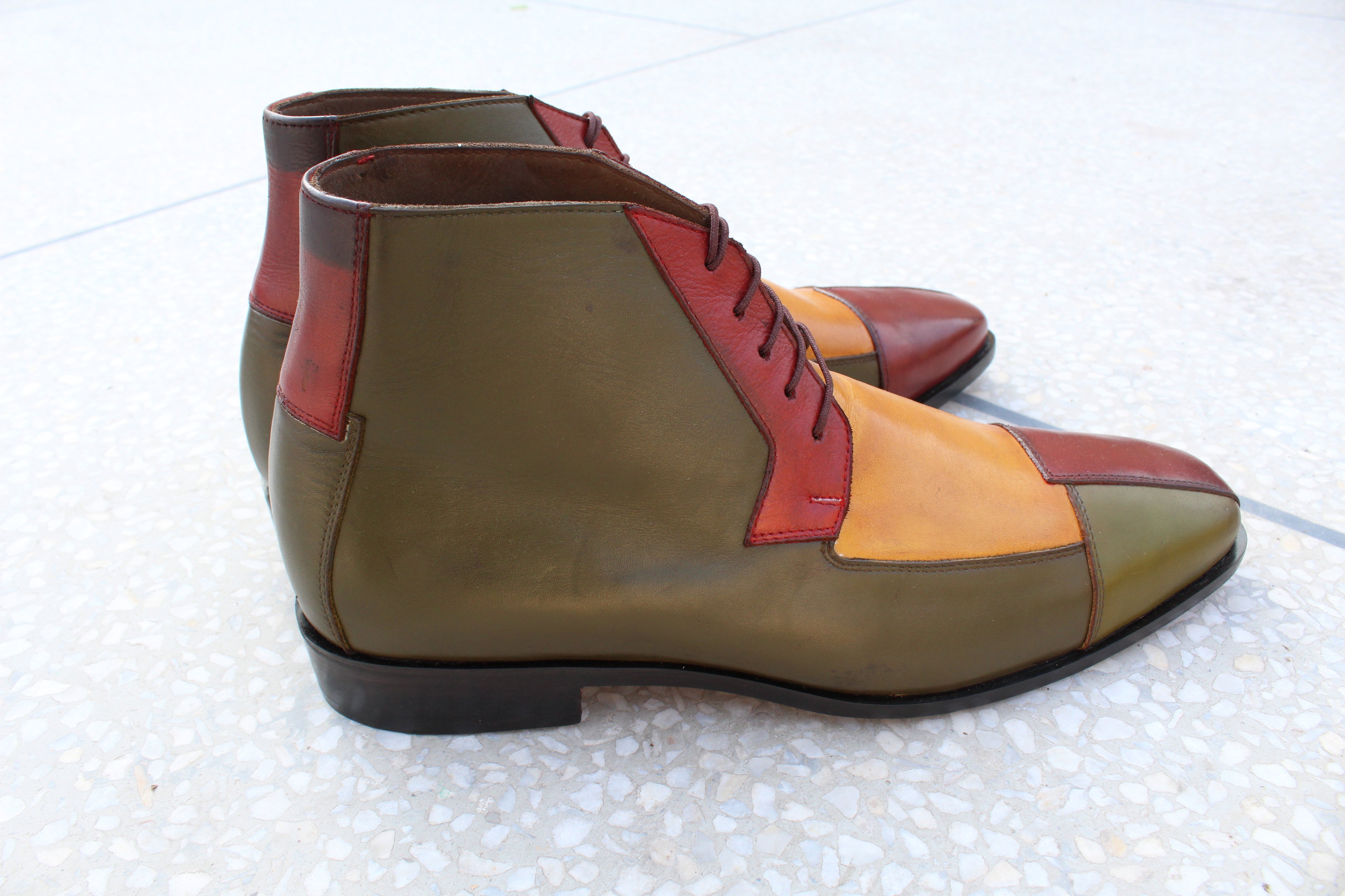 Inner: Soft Leather Sole: Leather Gender : Male Heel: Leather Color: Green Tri-Tone Style: Chukka Boots Lining Soft Calf Leather Lining Totally Hand stitched Manufacturing time 7-10 business days If you can’t find your Size/Colorjust send us message we will make for you.