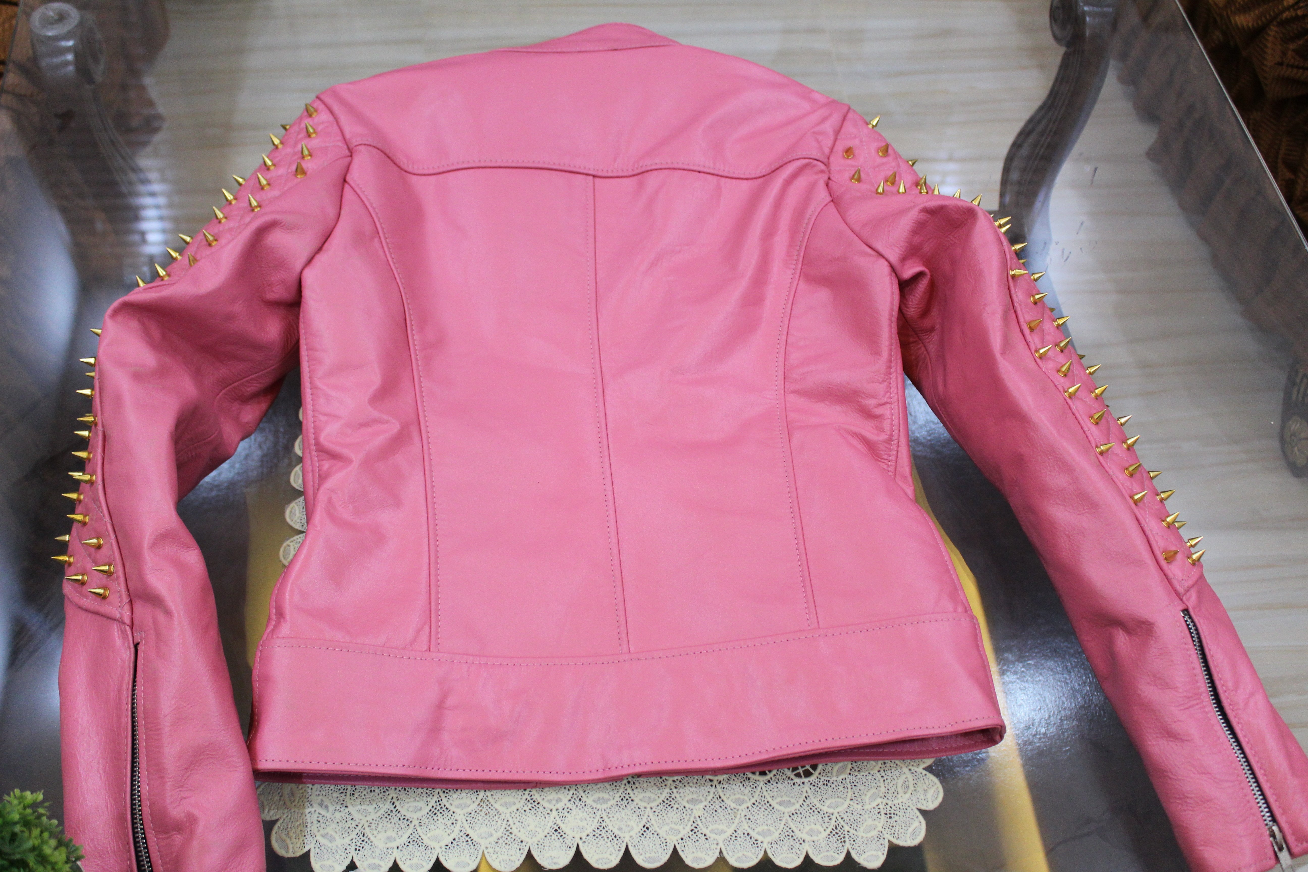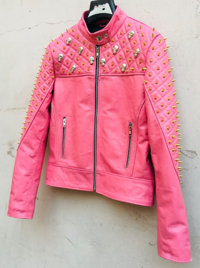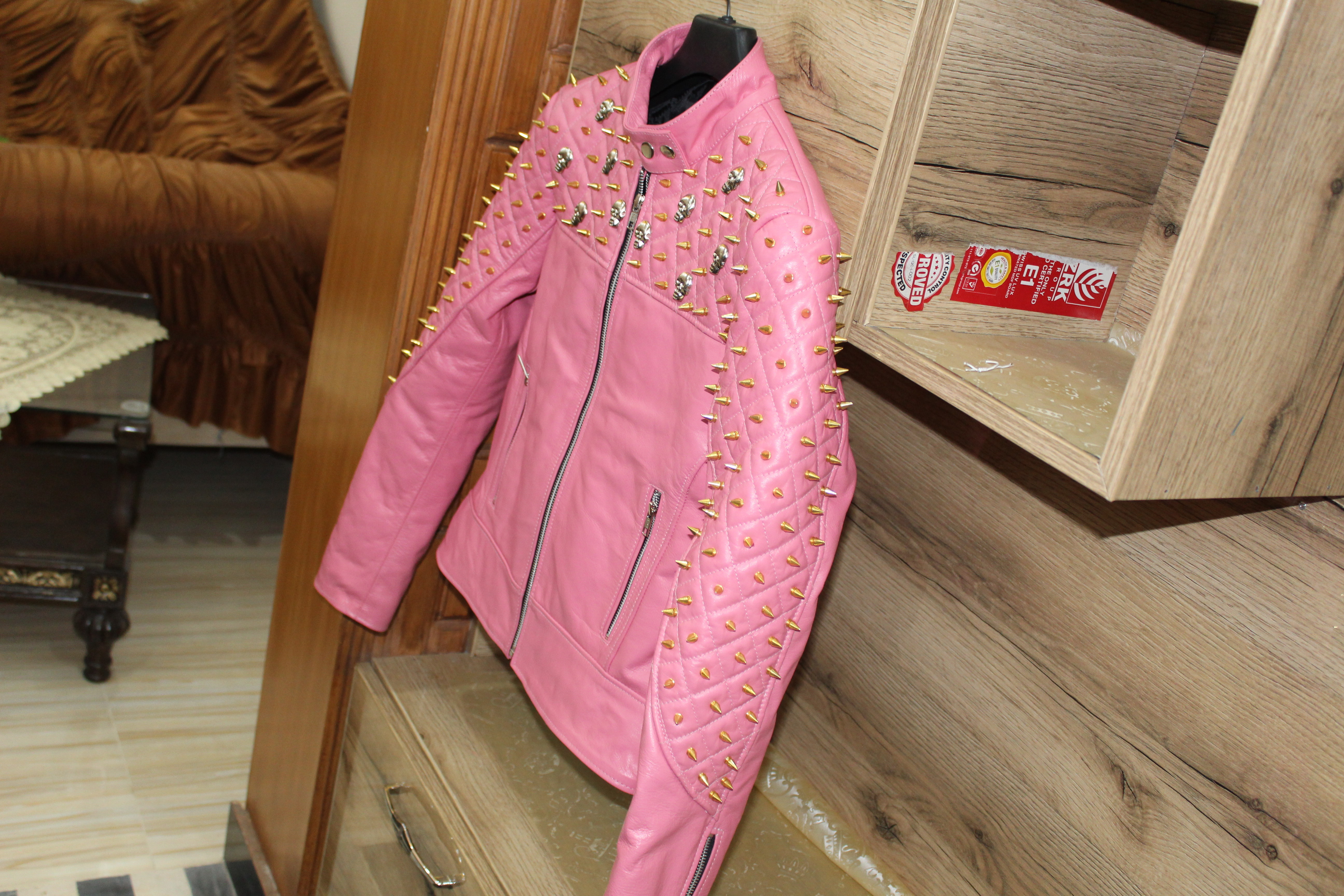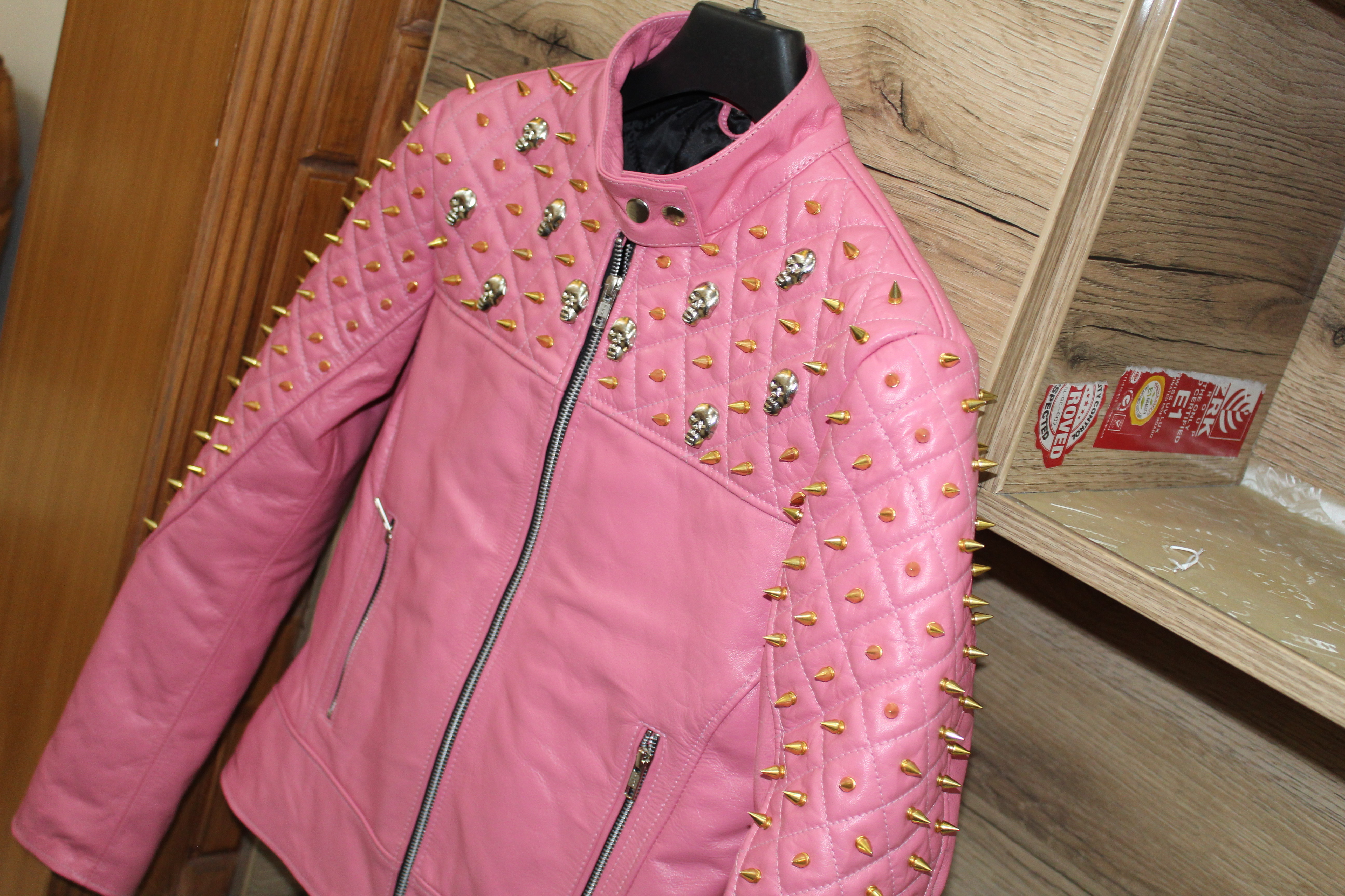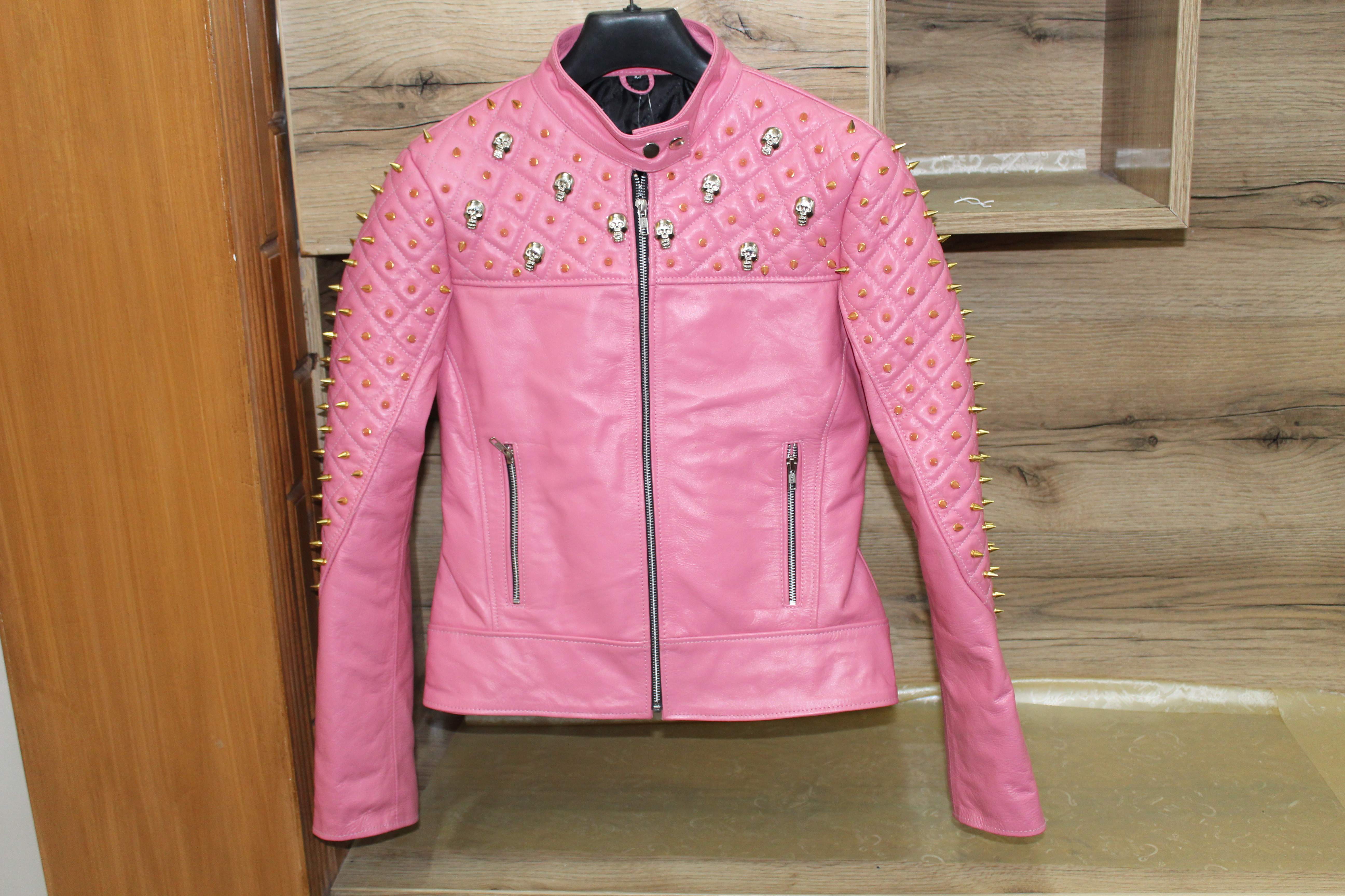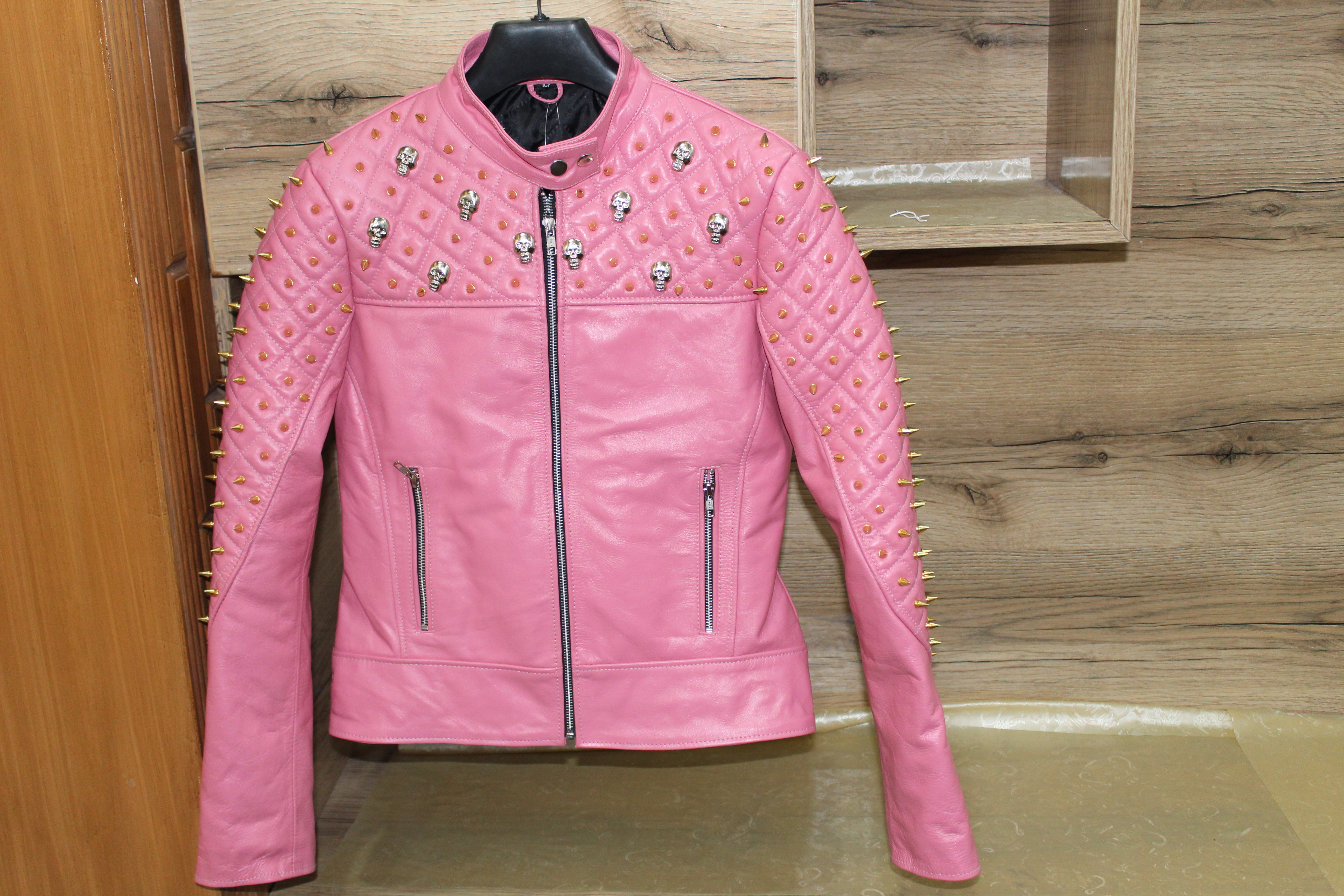 Crafted Leather Women Pink Quilted Gold Studded Skeletons Genuine Leather Jacket