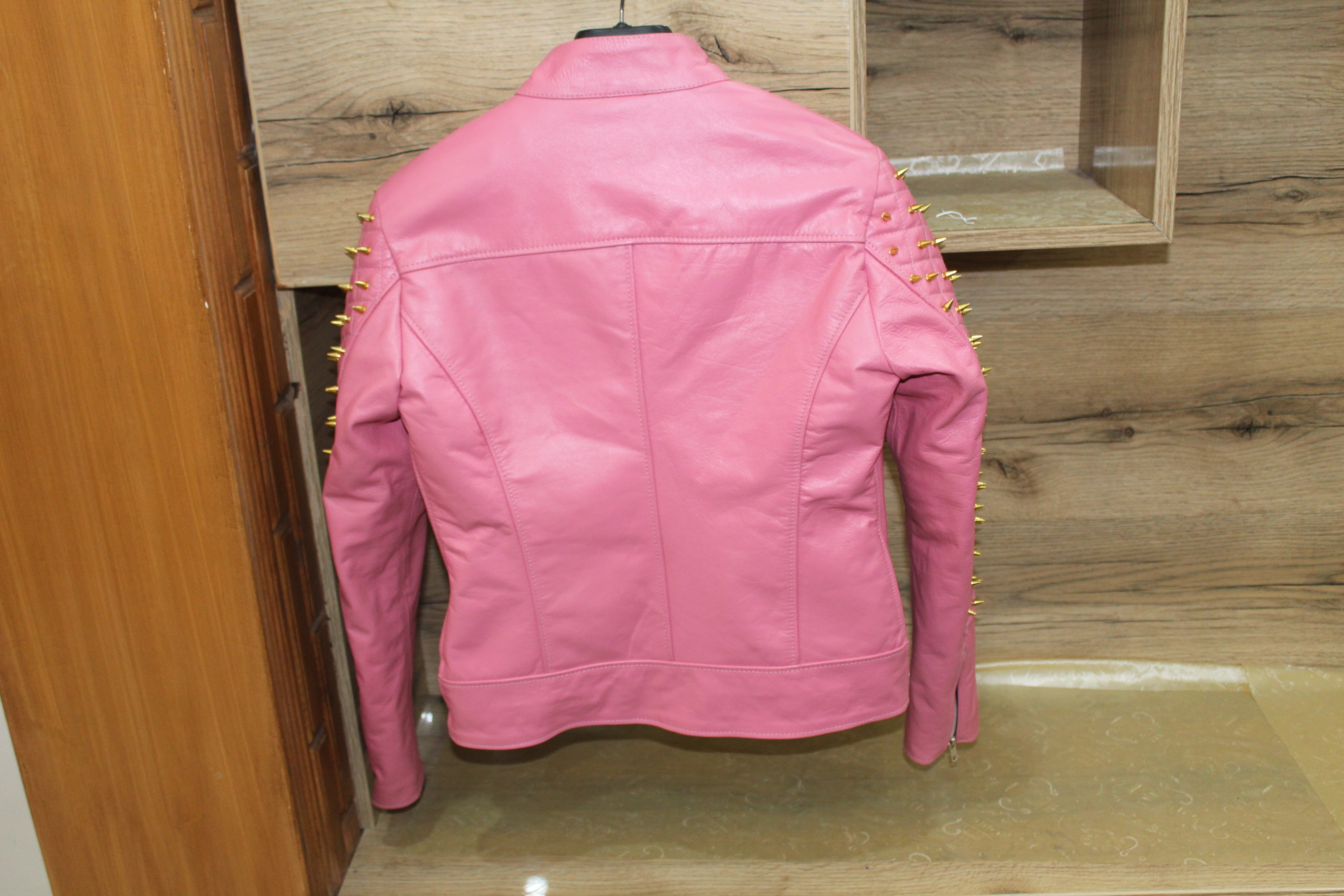 Crafted Leather Women Pink Quilted Gold Studded Skeletons Genuine Leather Jacket
