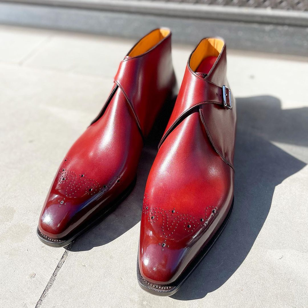 Handmade Men Vintage Cherry Monk Strap Chukka Boot