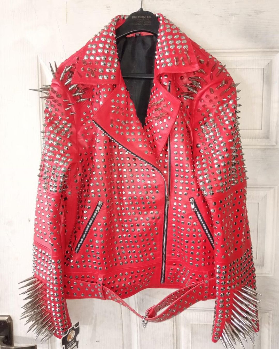 Crafted Leather Classy Red Gothic Studded Jacket with Silver Studs and Spikes