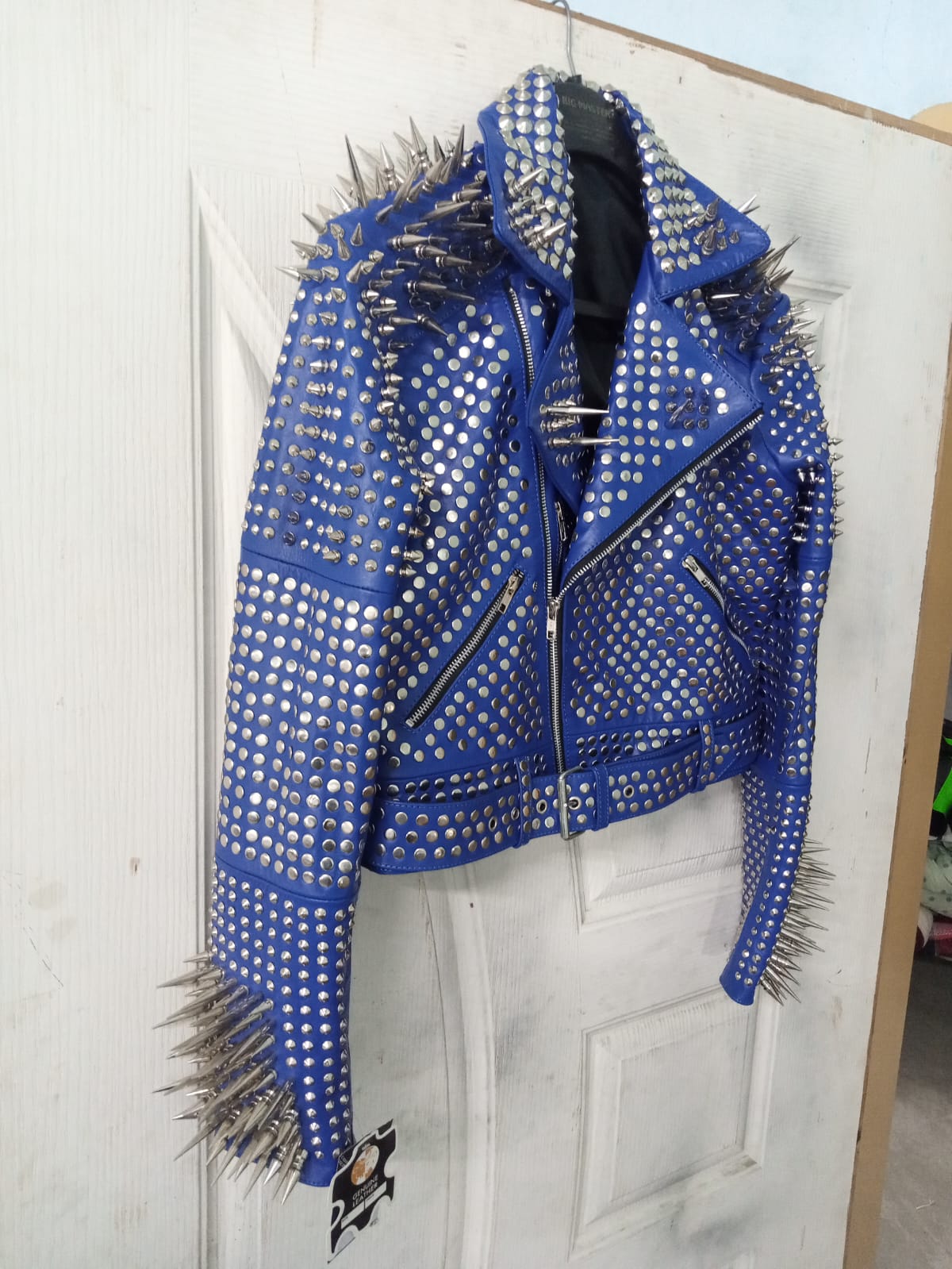 Crafted Leather Handmade Men's Awesome Blue Punk Silver Spiked Studded Leather Brando Style Jacket