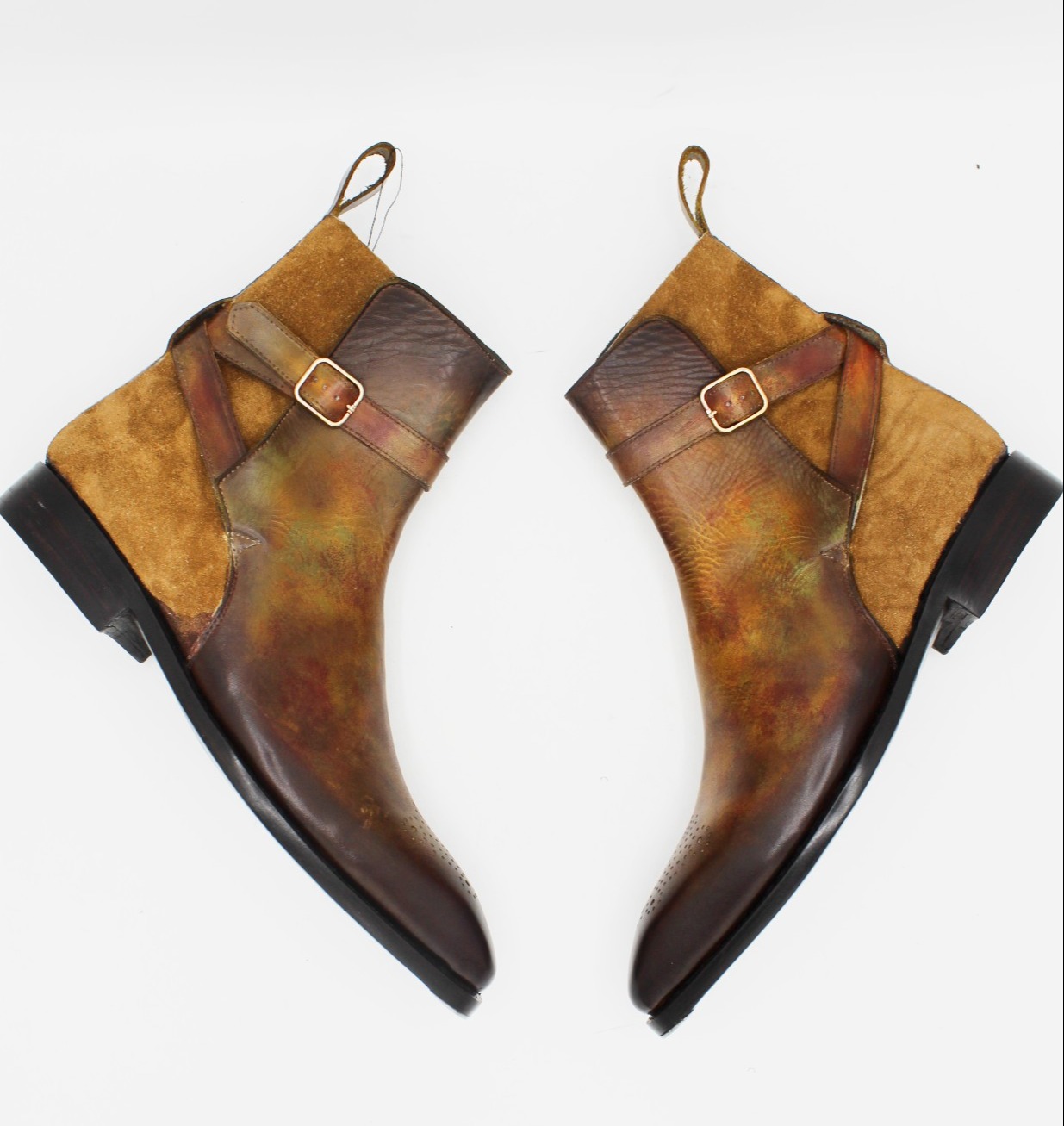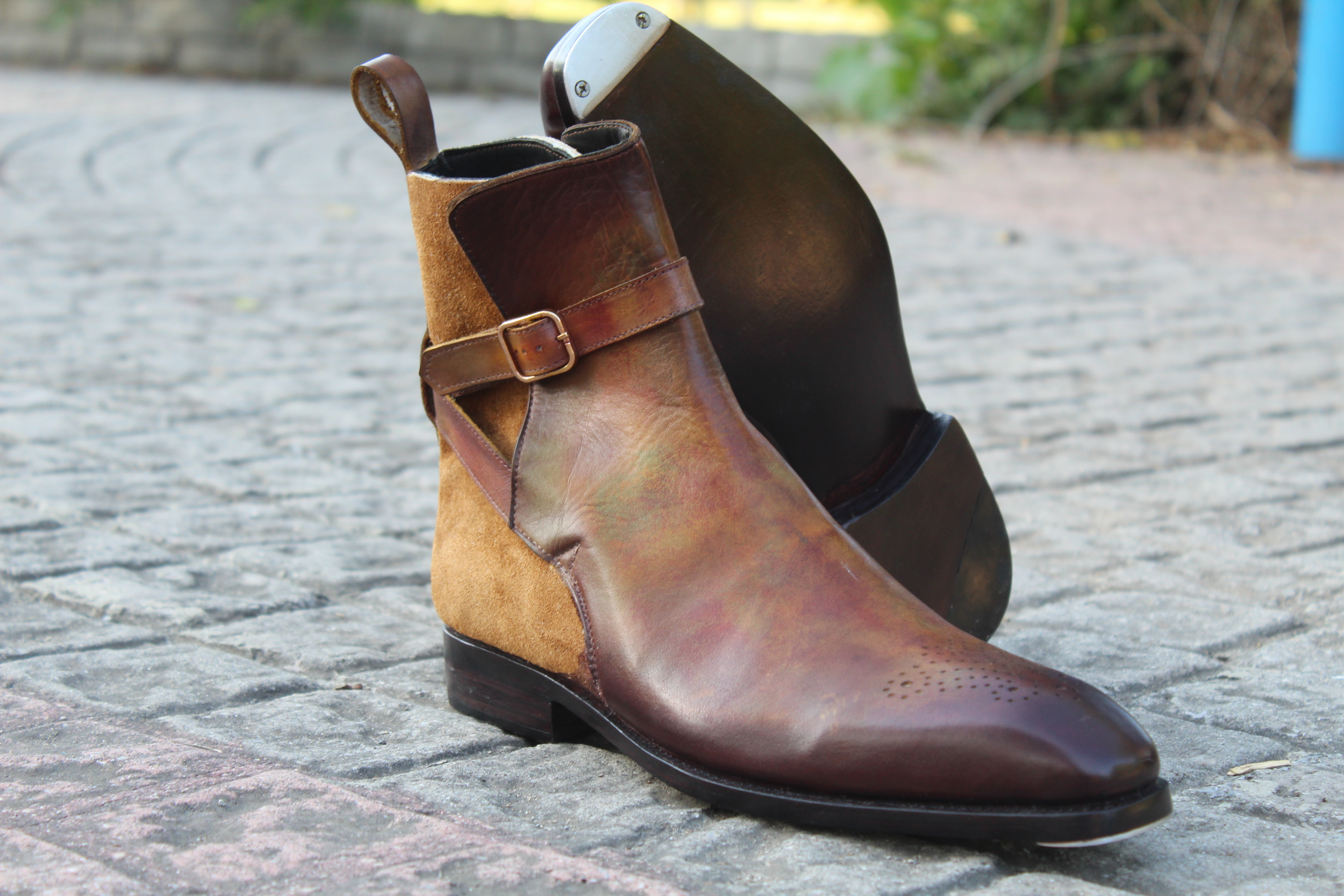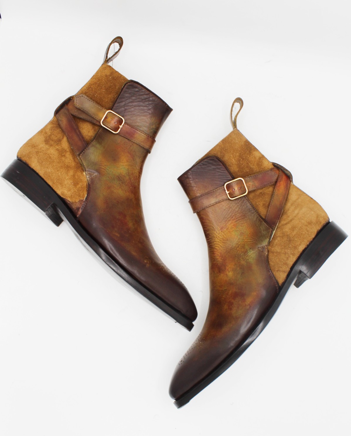 Crafted Leather Handmade Men Custom Made Denim Brown Suede Patina Leather Jodhpur Ankle High Monk Boots