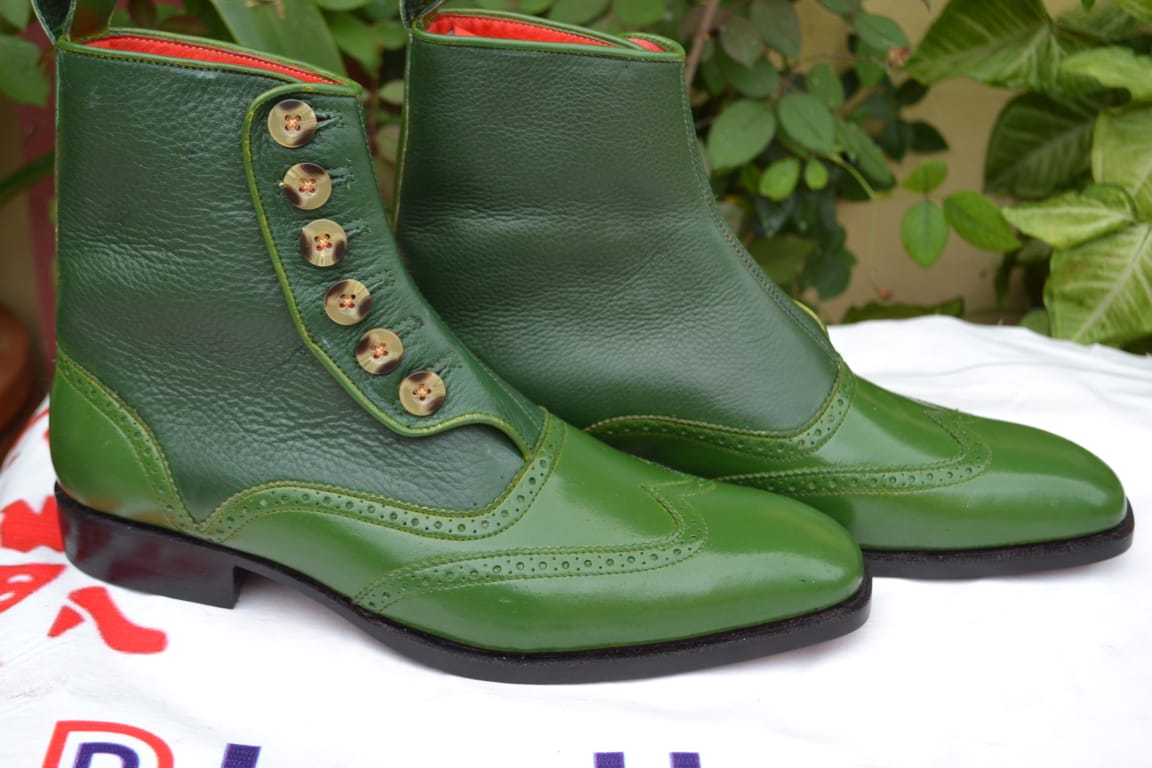 Inner: Soft Leather Sole: Leather Gender : Male Heel: Leather Color: Green Style: Ankle Button Boot Lining Soft Calf Leather Lining Totally Hand stitched Manufacturing time 7-10 business days If you can’t find your Size/Color just send us message we will make for you.