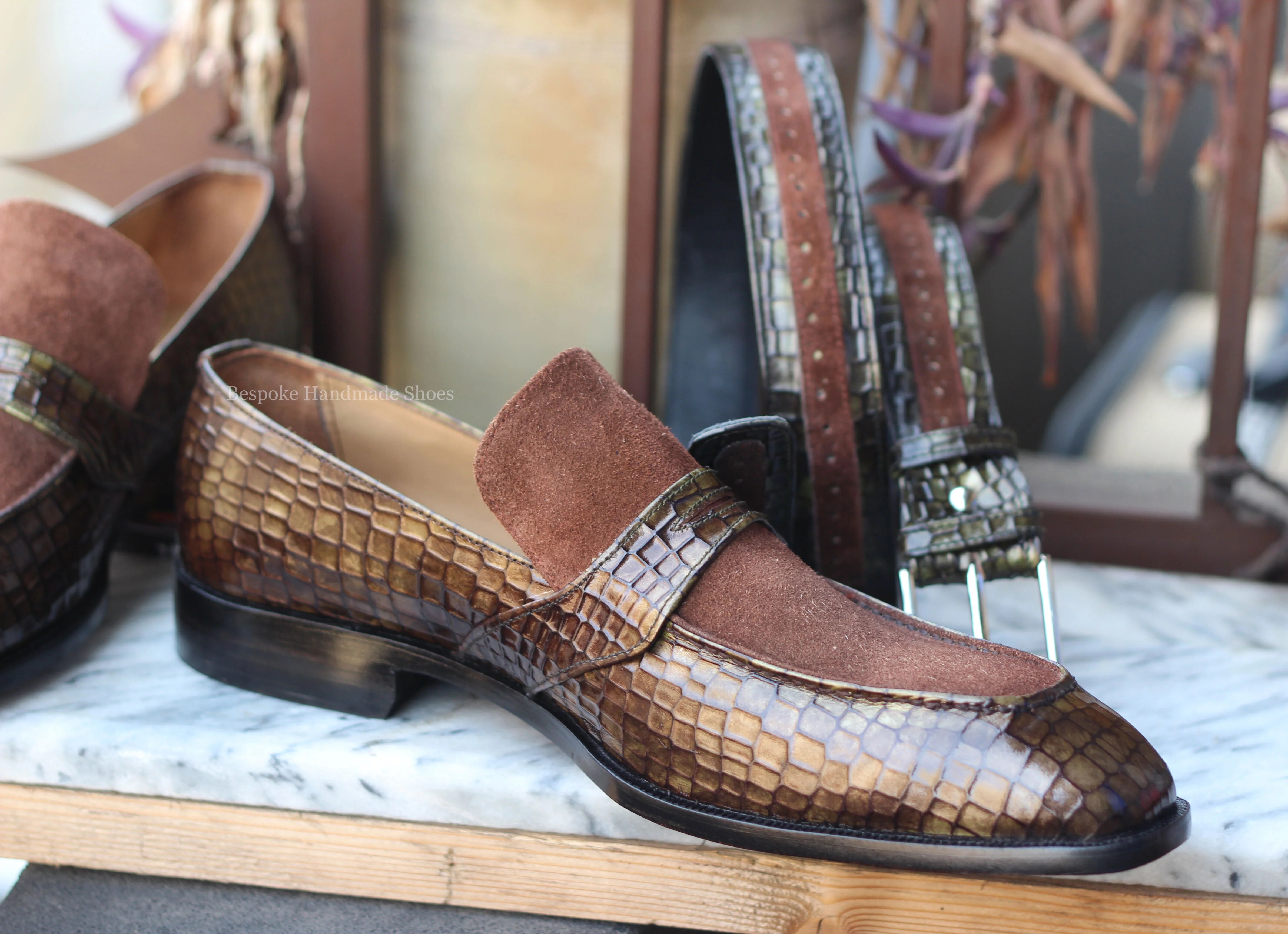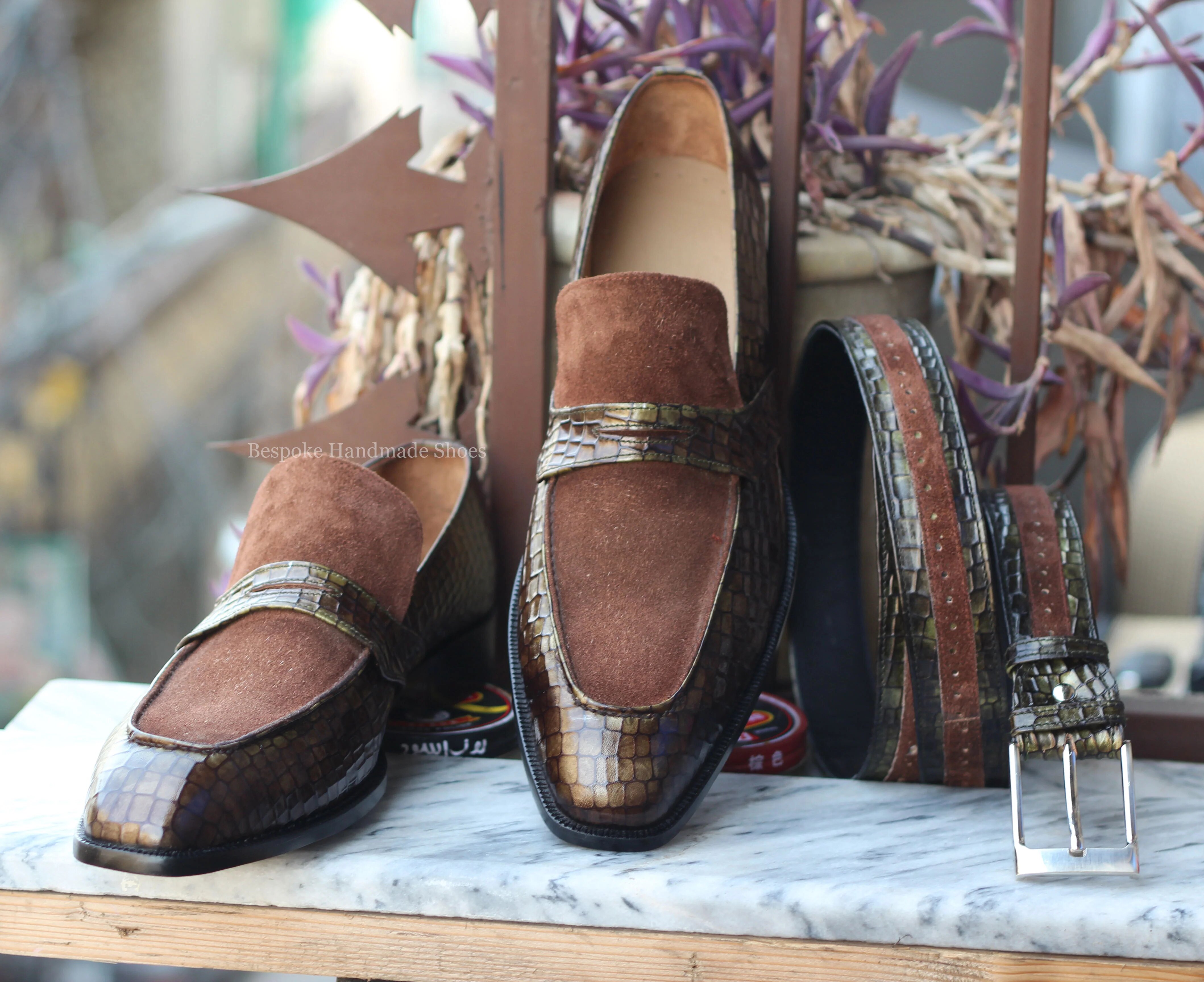 Crafted Leather Handmade Men Genuine Brown Suede Crocodile Leather Dress Shoes