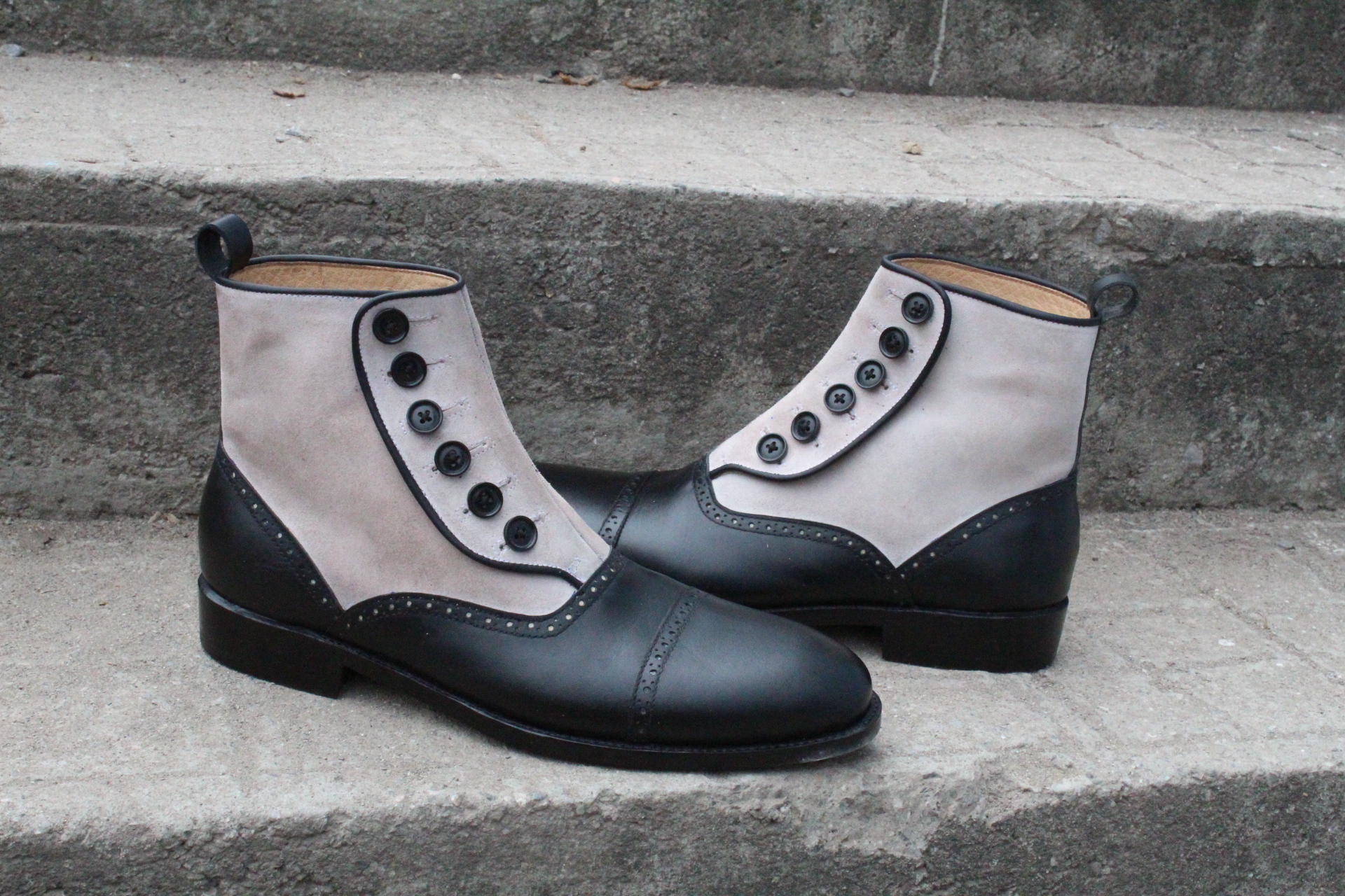 Crafted Leather Men Black Leather and White Suede Button Ankle Dress Boot