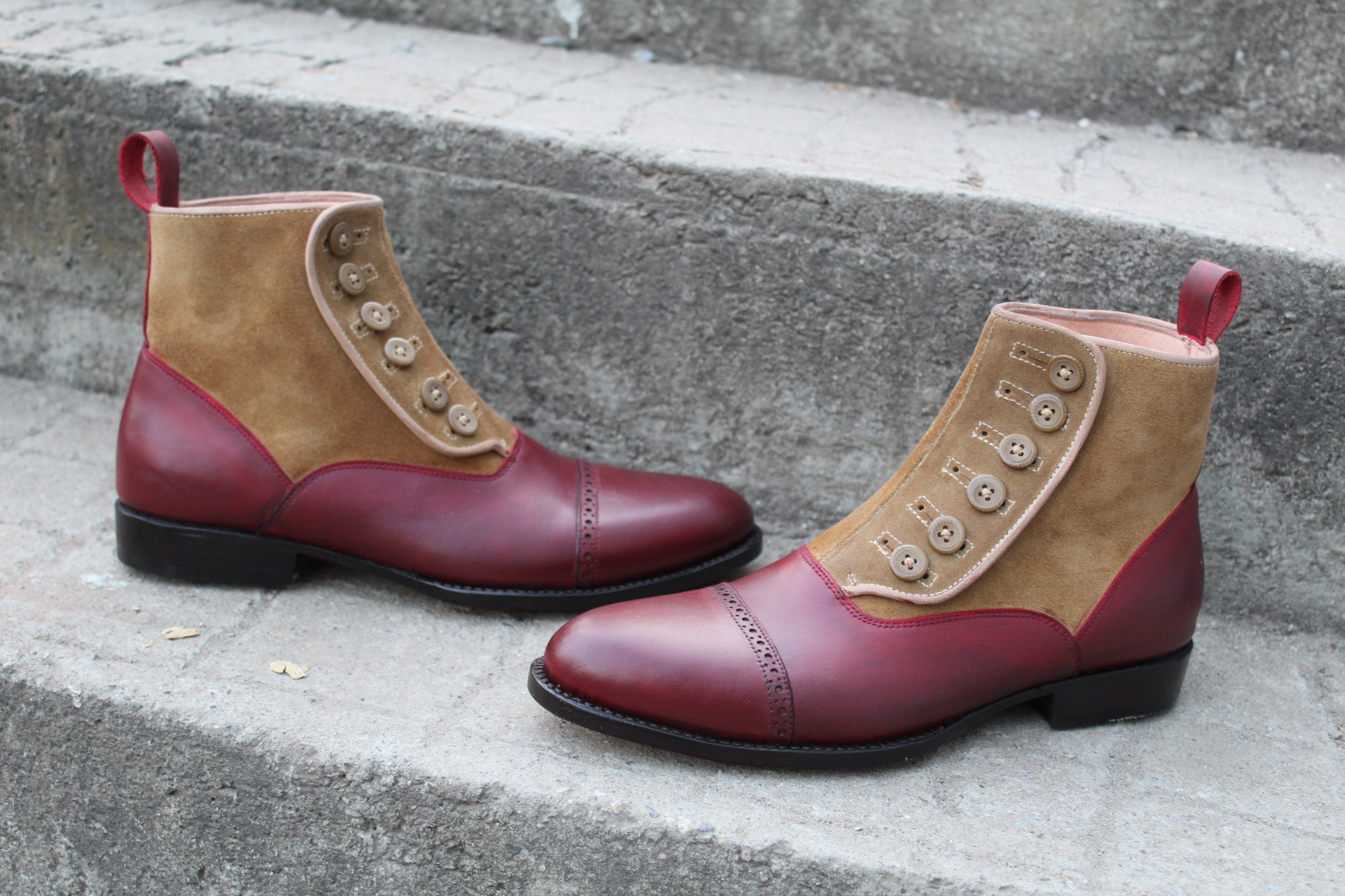 Inner: Soft Leather Sole: Leather Gender : Male Heel: Leather Color: Brown / Red Style: Button Boot Totally Hand stitched Manufacturing time 7-10 business days If you can’t find your Size/Color just send us message we will make for you.
