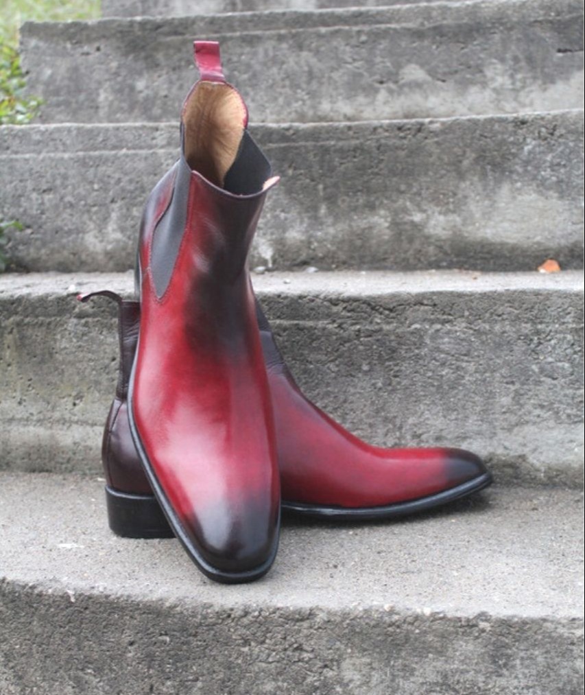 Crafted Leather Handmade Red Black Shaded Leather Fashion Men Chelsea Dress Boot