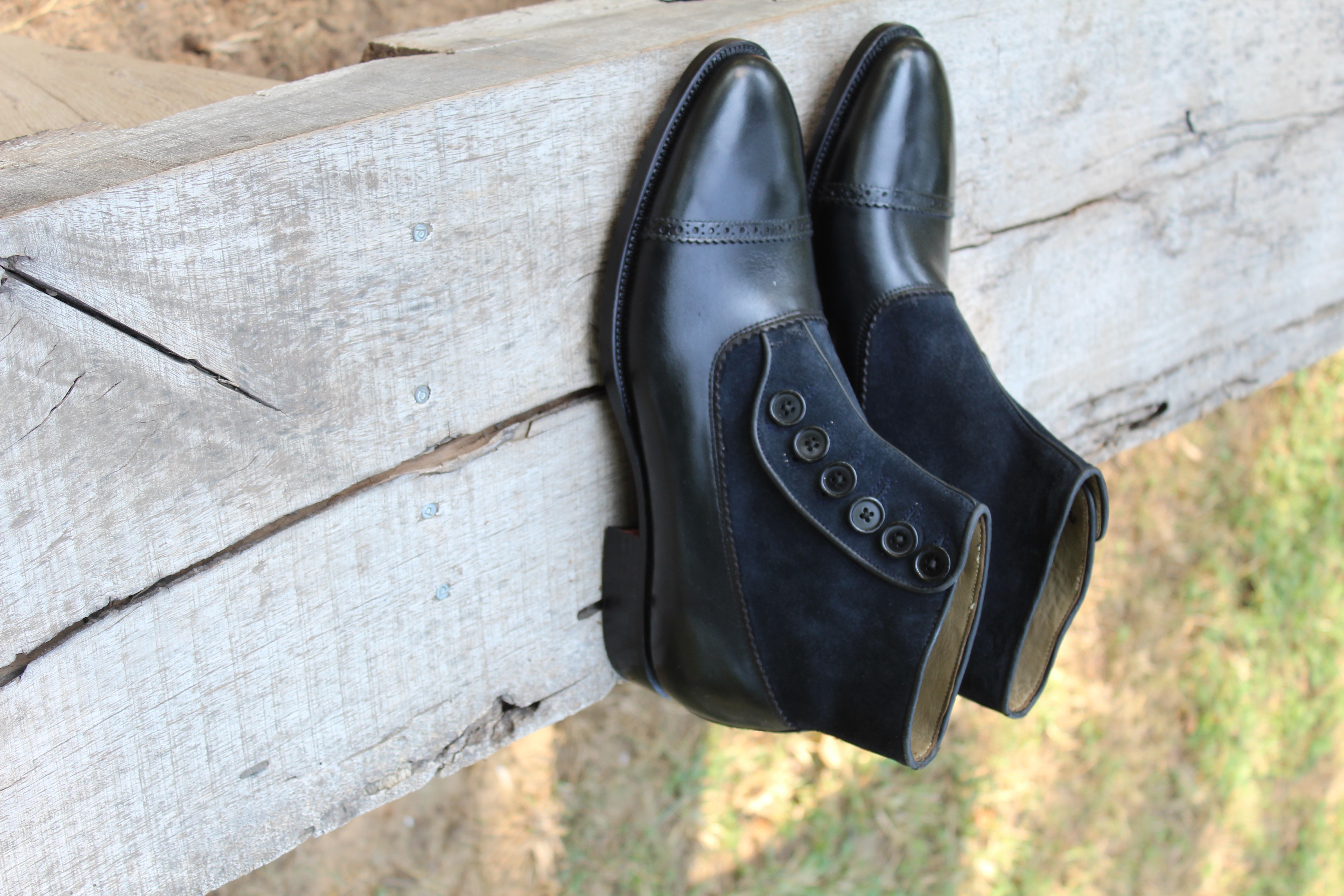 Crafted Leather Black Calf and Dark Blue Suede Leather Men Button Ankle High Dress Boot