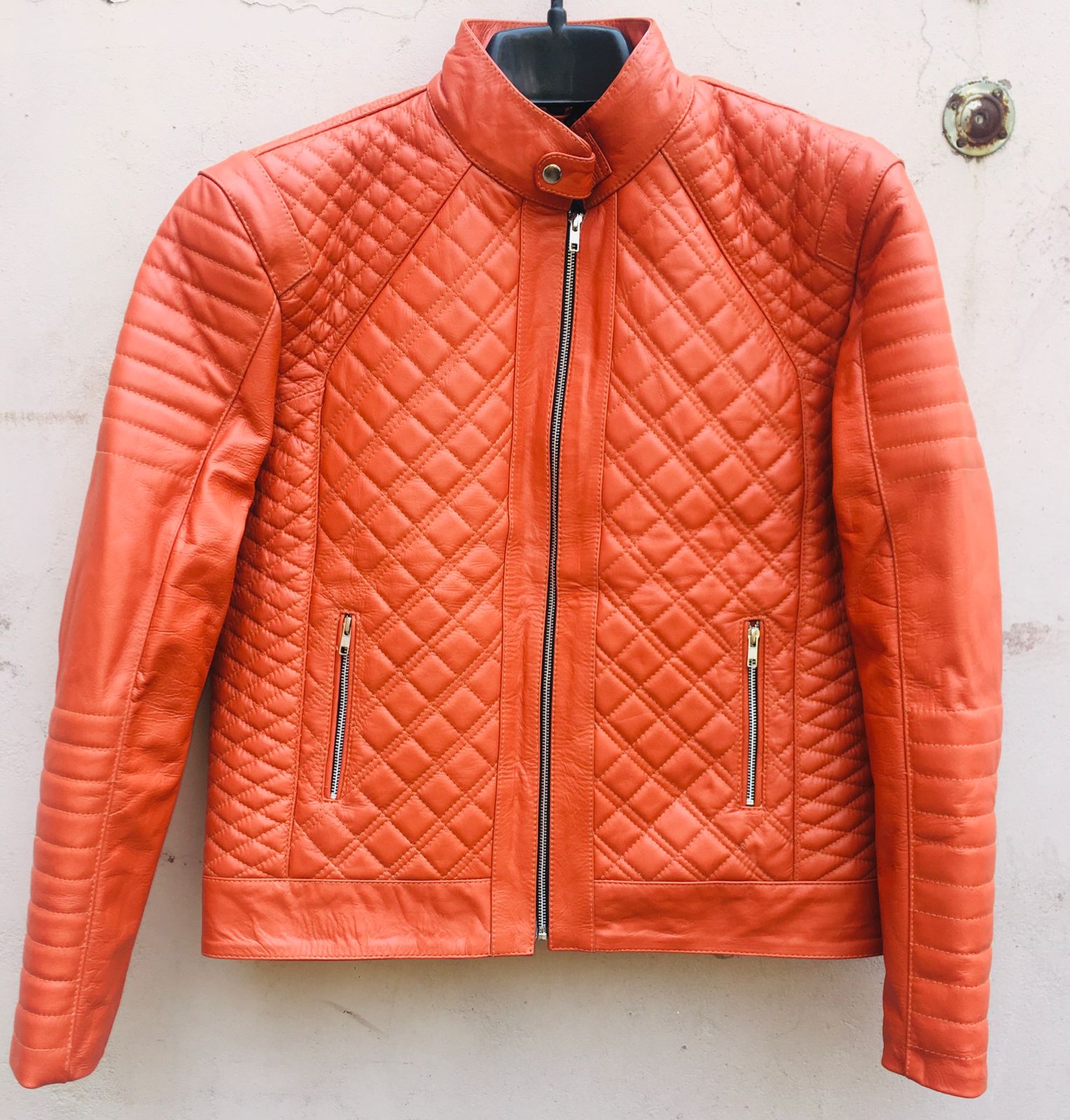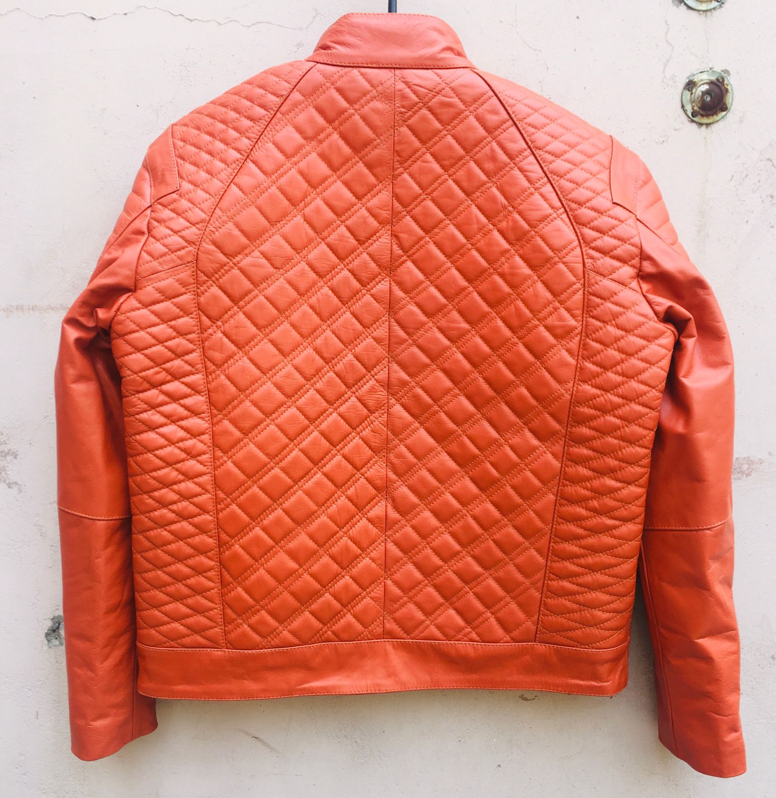 Crafted Leather Mens ORANGE QUILTED Slim Fit Motorcycle Fashion Outfit Diamond Stitch Pattern Leather Jacket