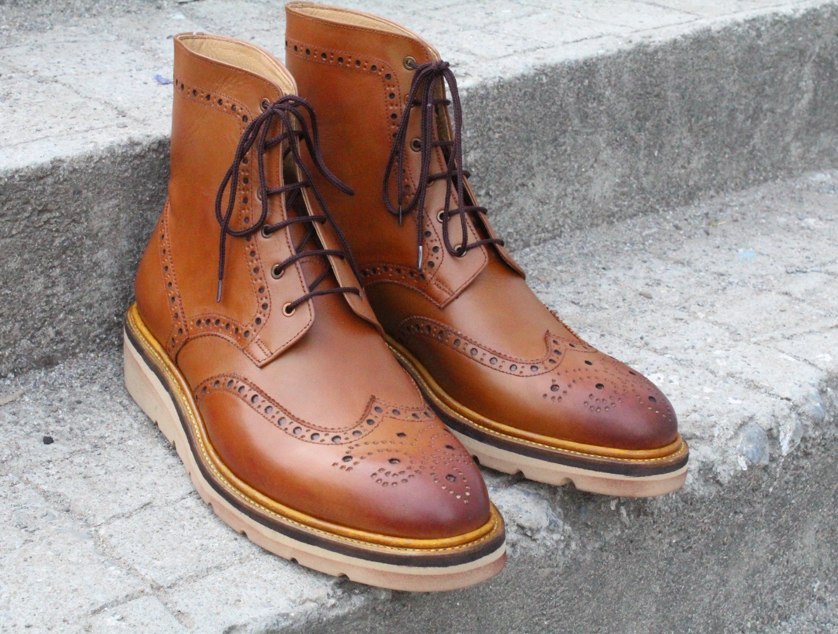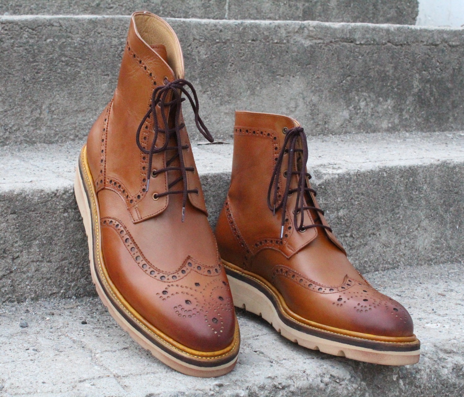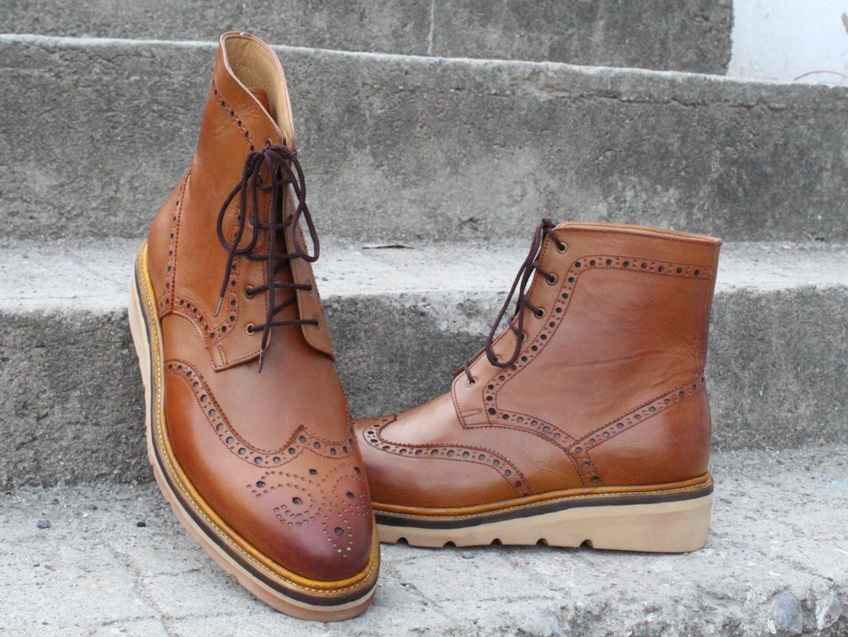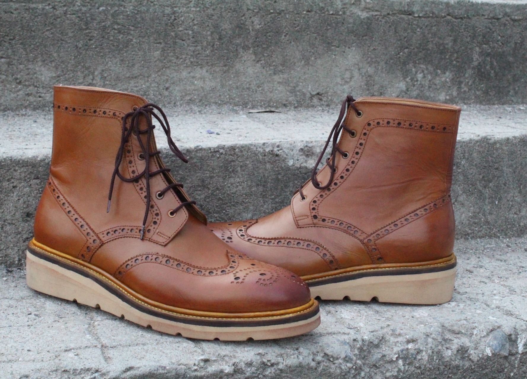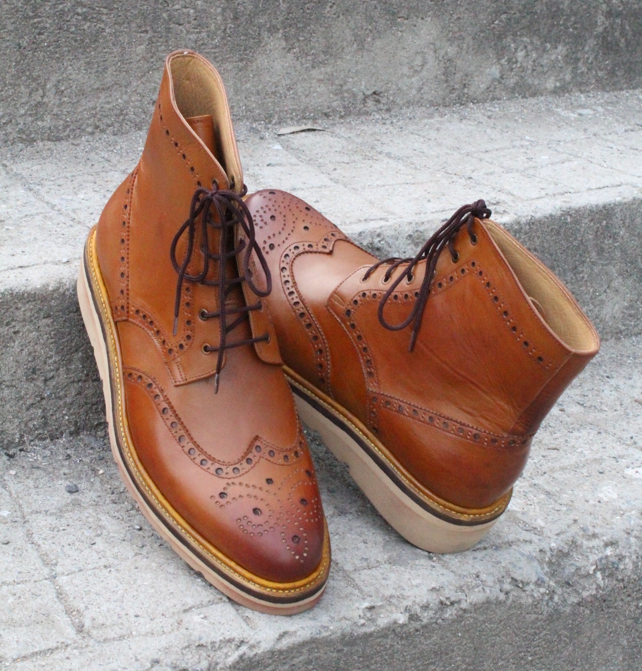 Crafted Leather Bespoke Men's Handmade Custom Shoes Tan Calf-Skin Leather Military Wingtip Brogue Dress Boots