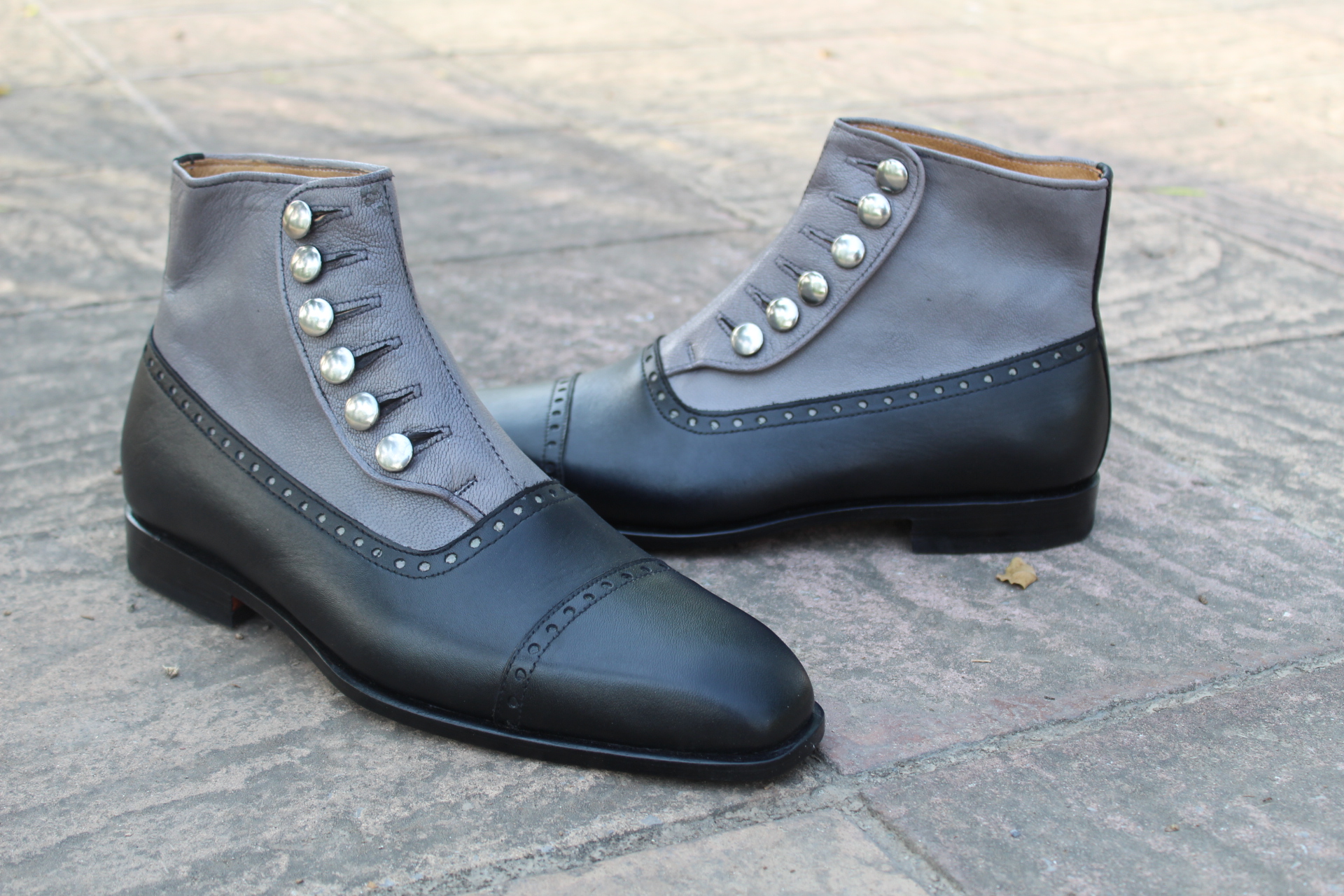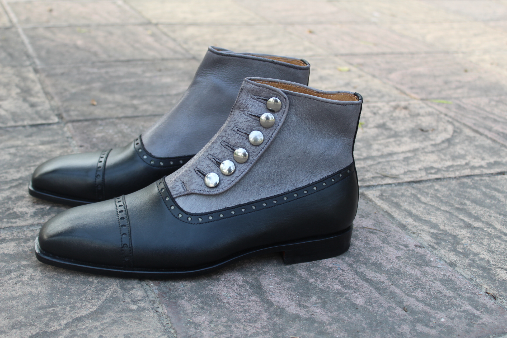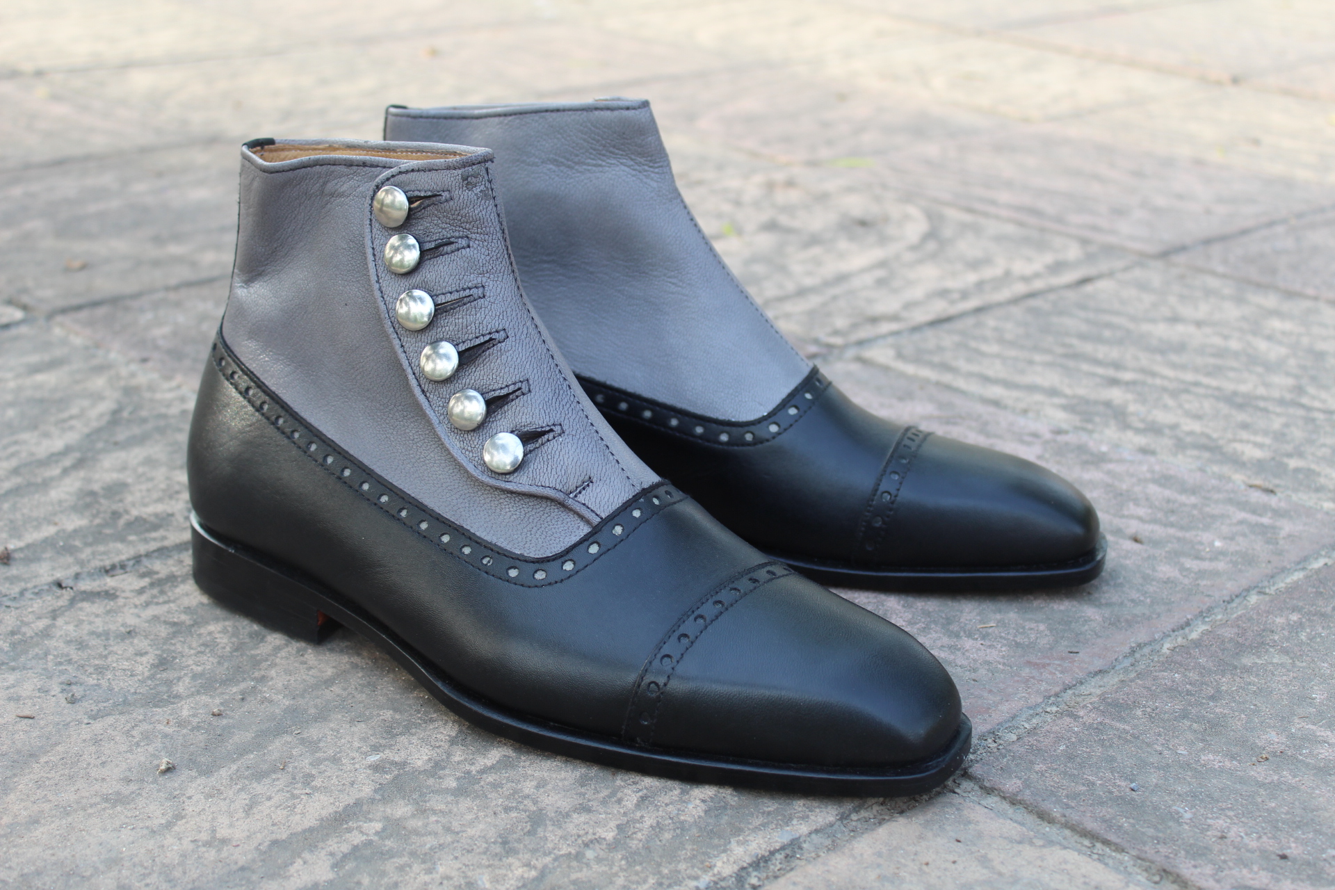 Crafted Leather Handmade Dress Shoes Black Gray Leather Button Ankle High Boot