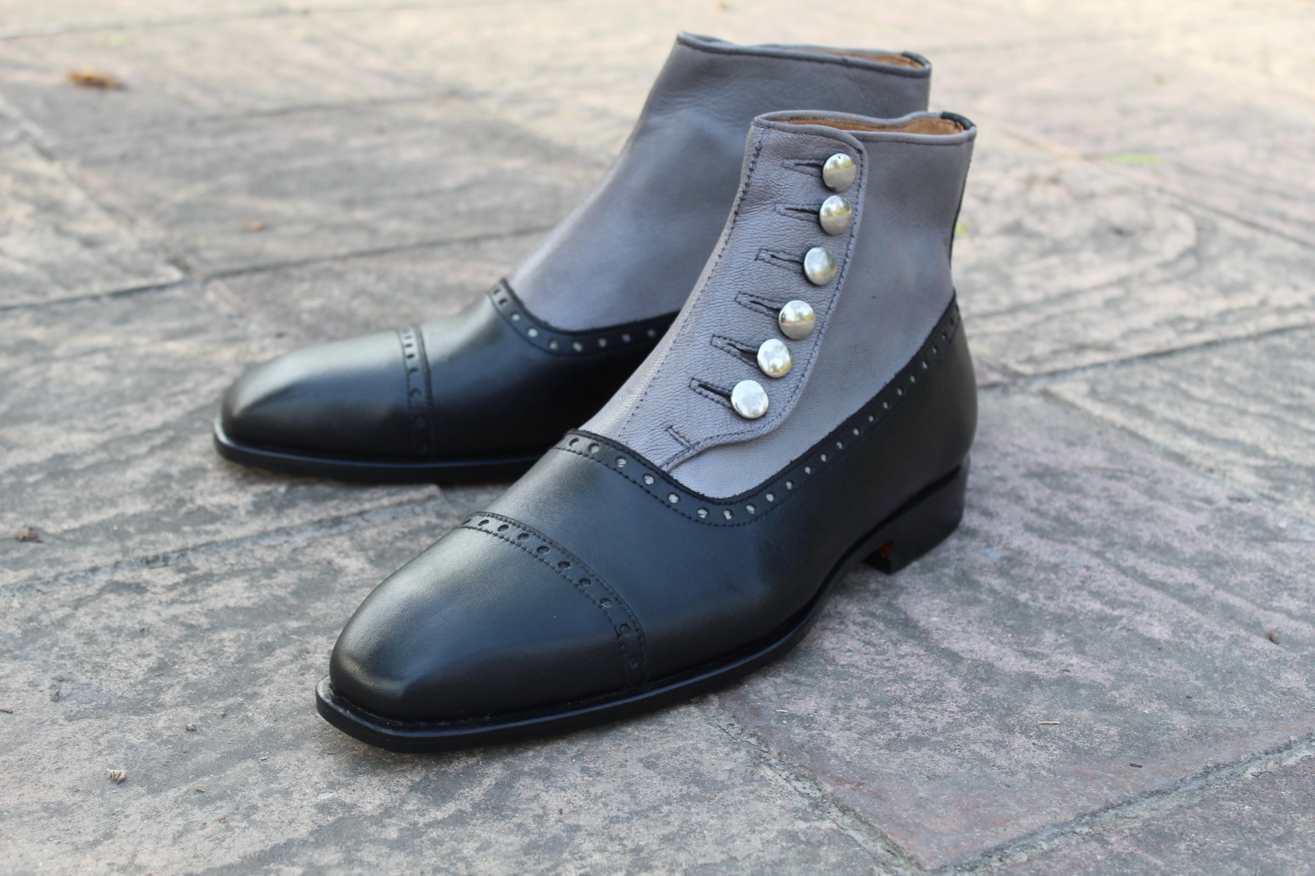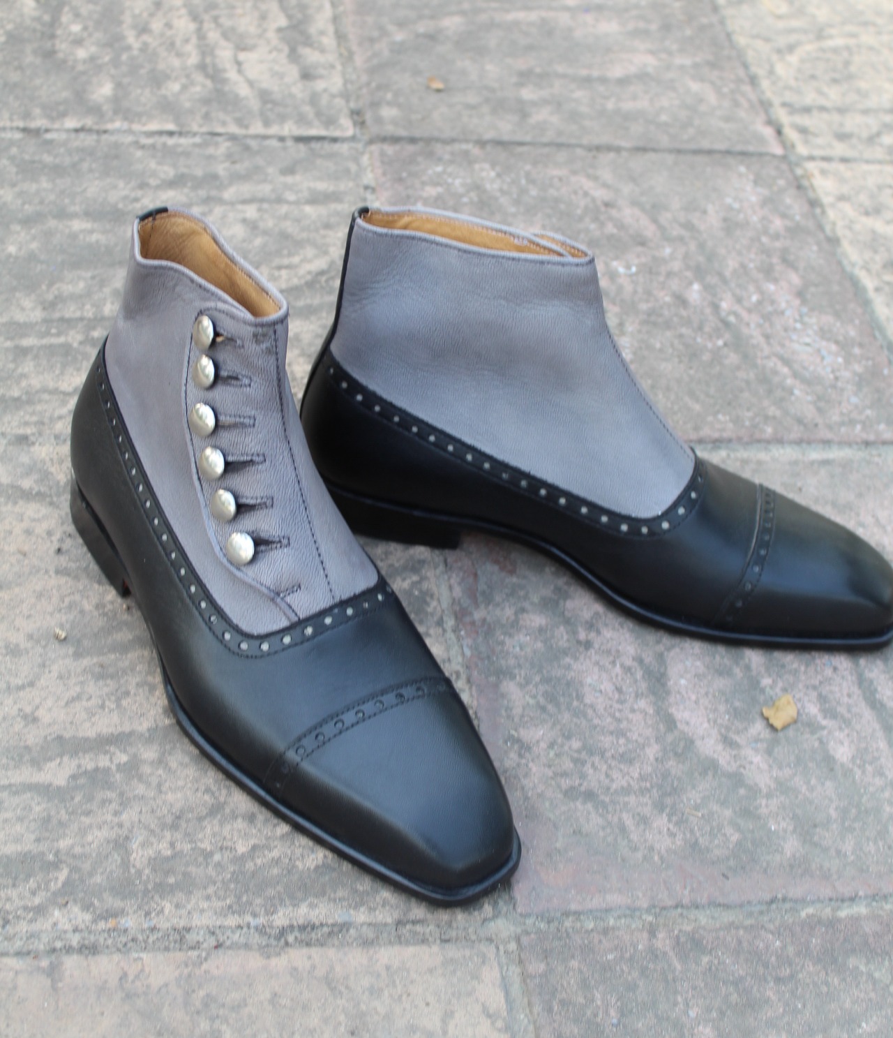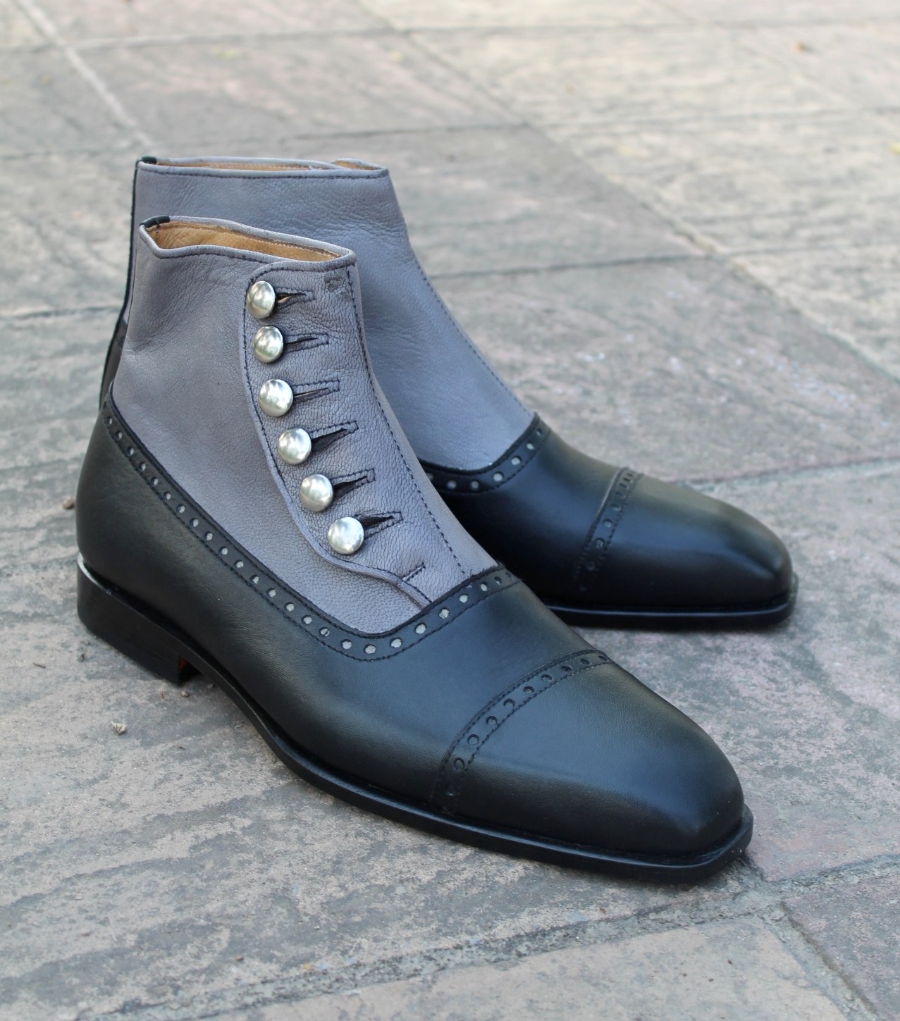 Crafted Leather Handmade Dress Shoes Black Gray Leather Button Ankle High Boot
