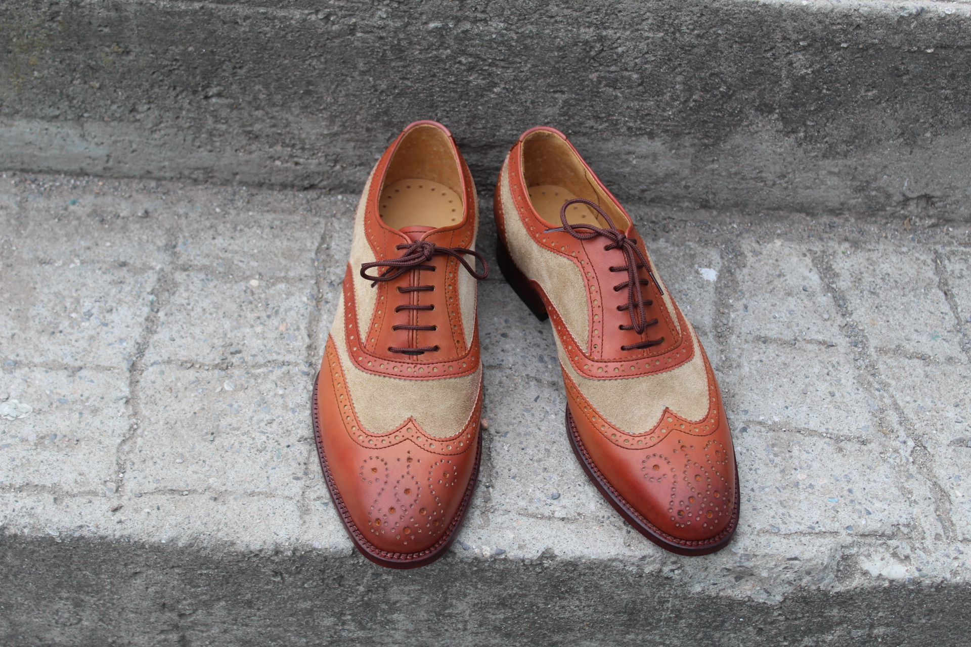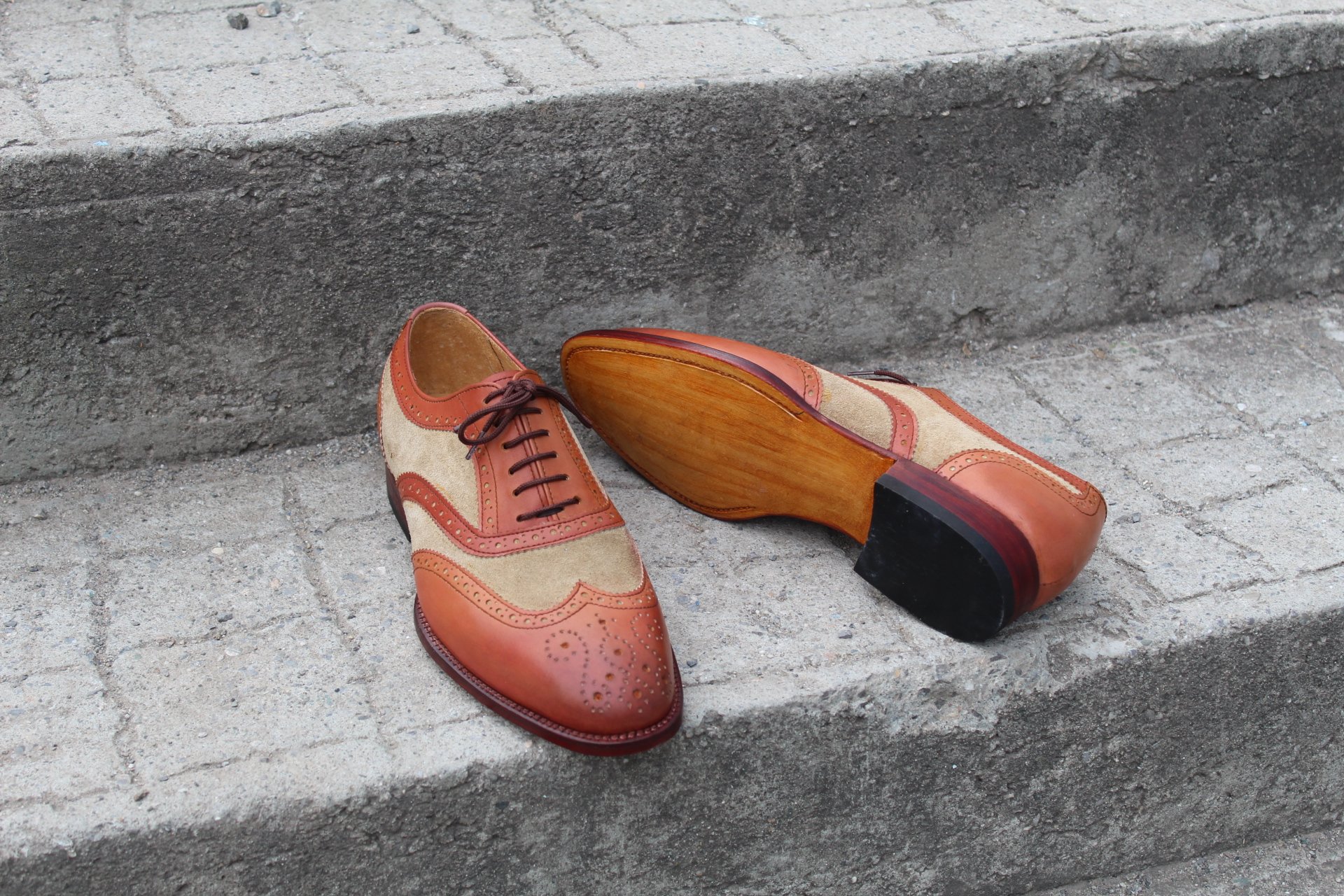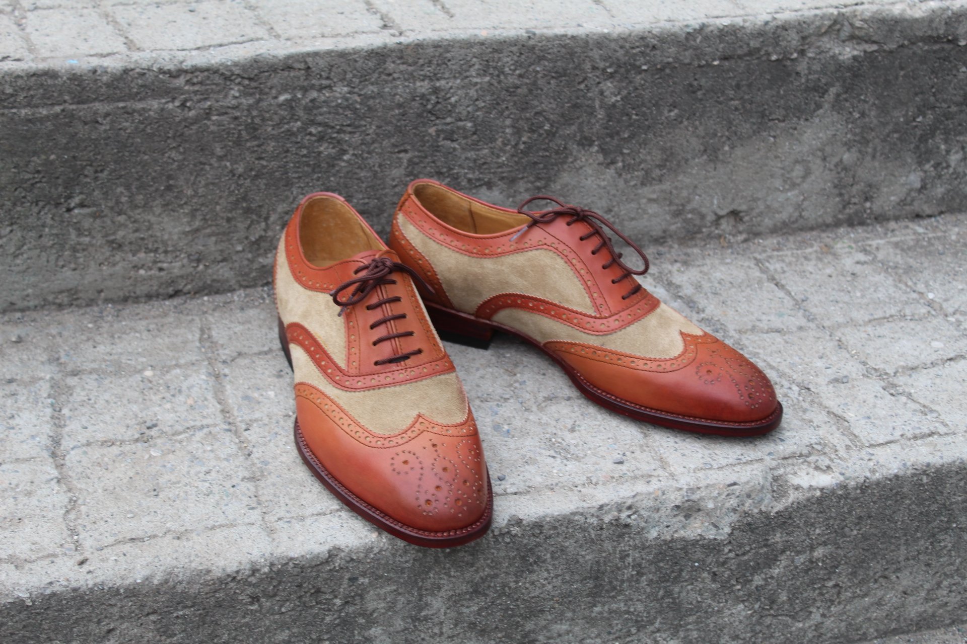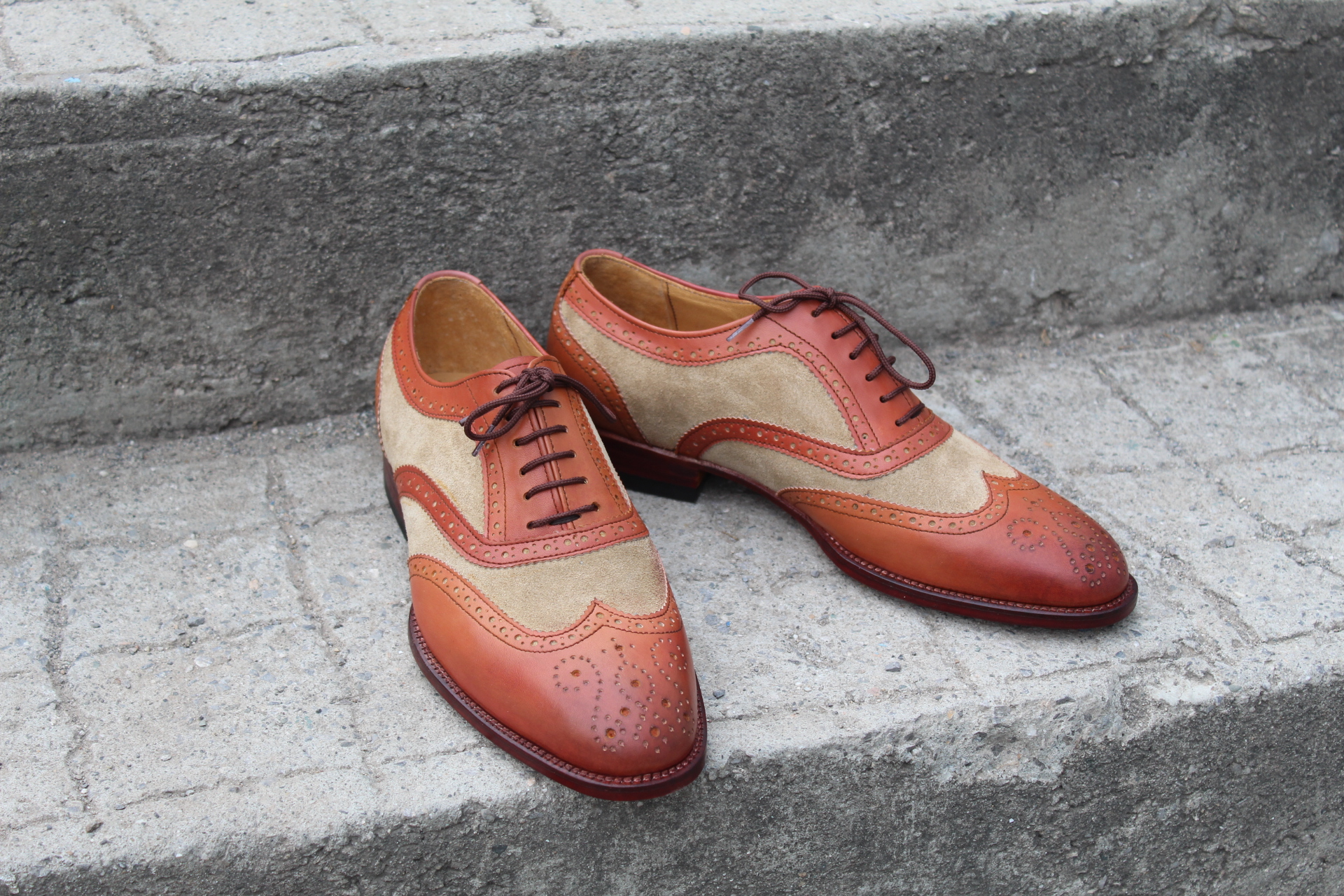 Crafted Leather Handmade Tan and Beige Suede Leather Wingtip Oxford Lce up Dress Oxford