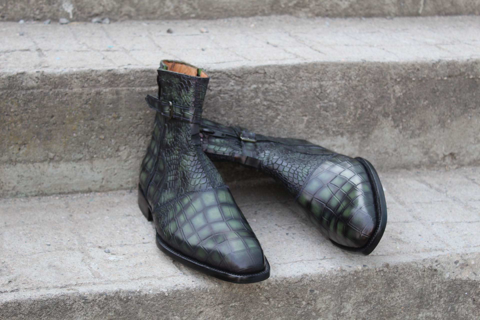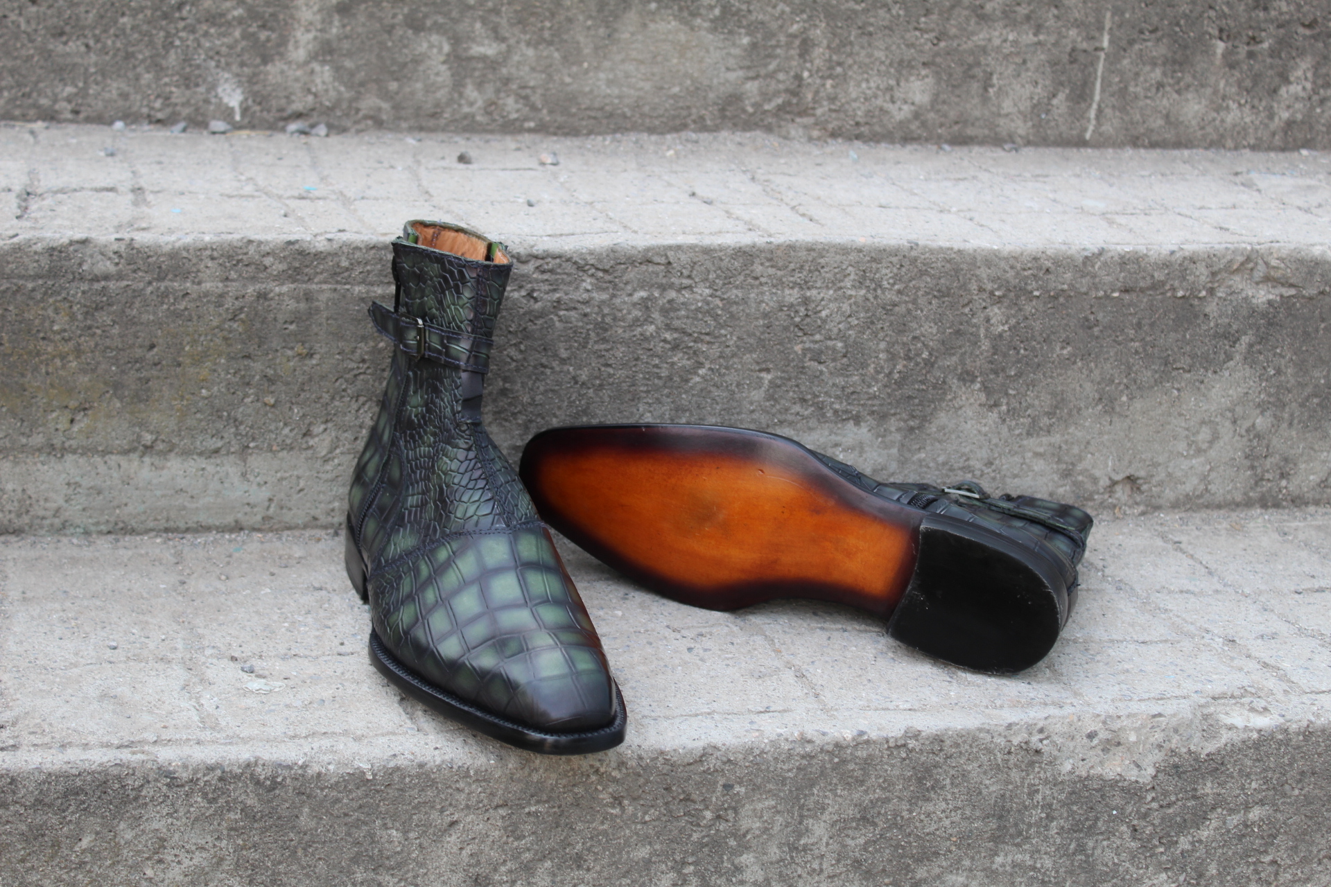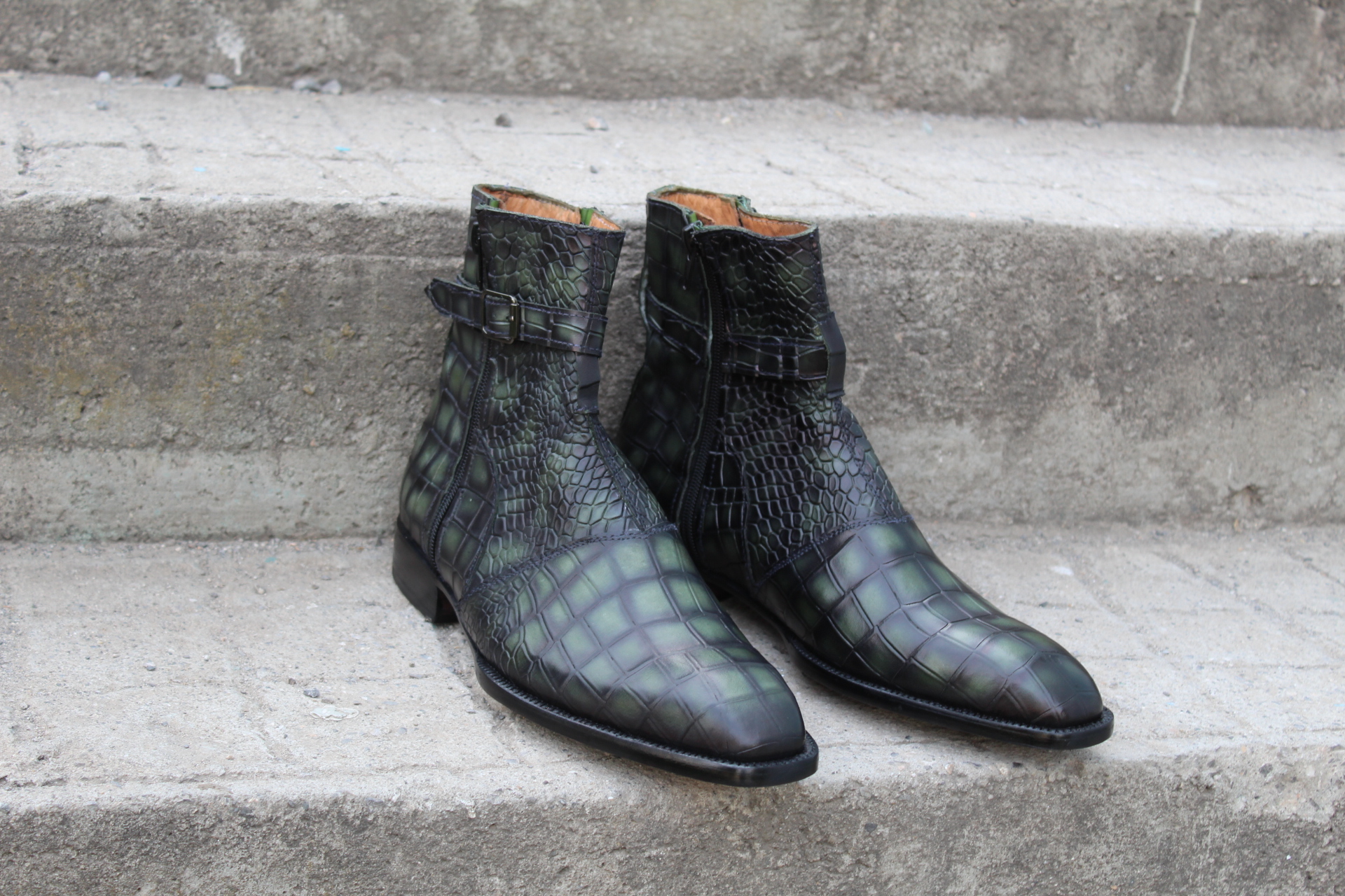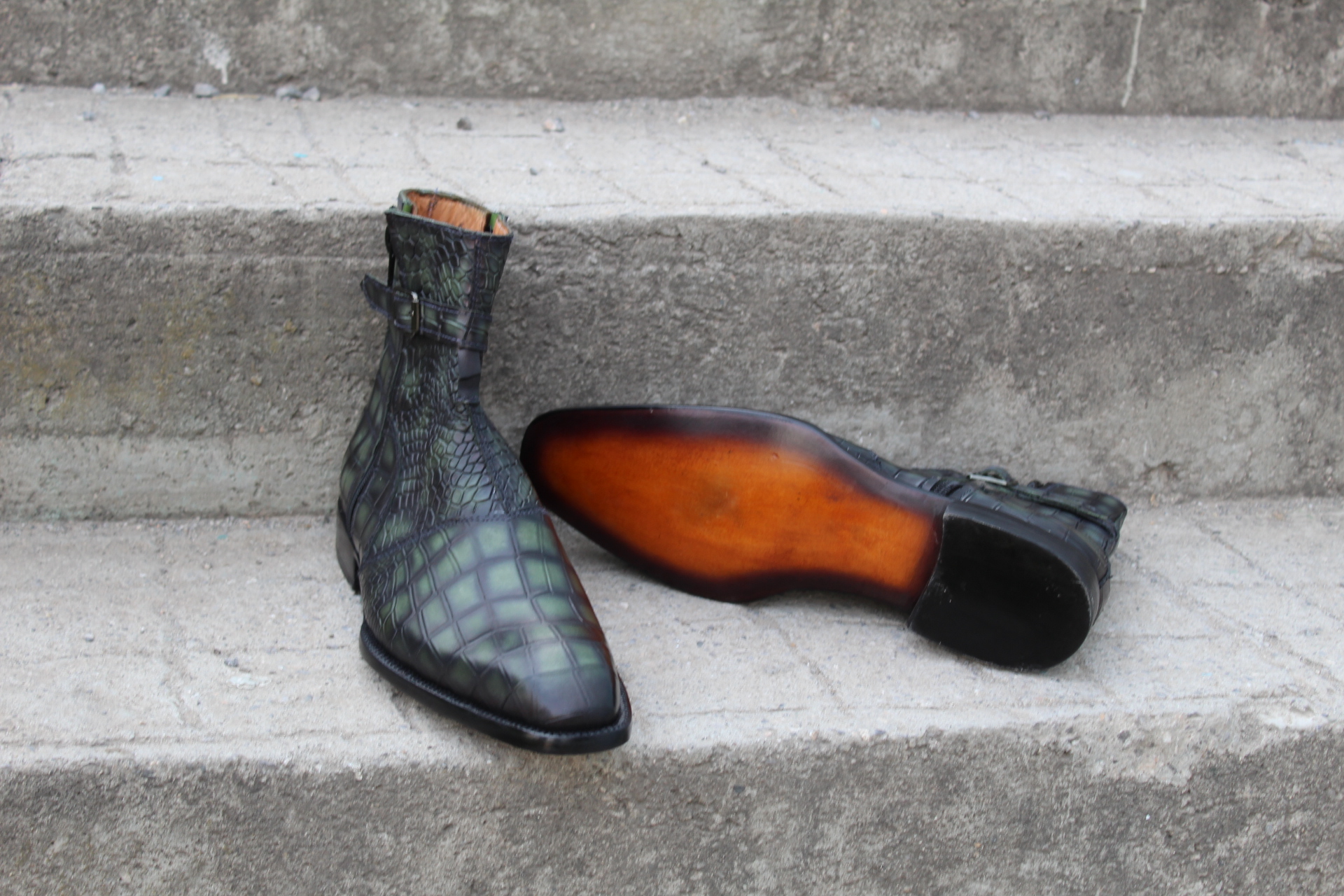Crafted Leather Bespoke Dress Shoes Green Classic Crocodile/Alligator Jodhpur Buckle Strap Boot