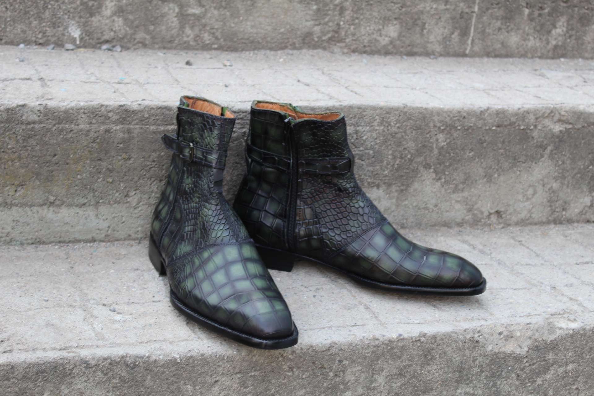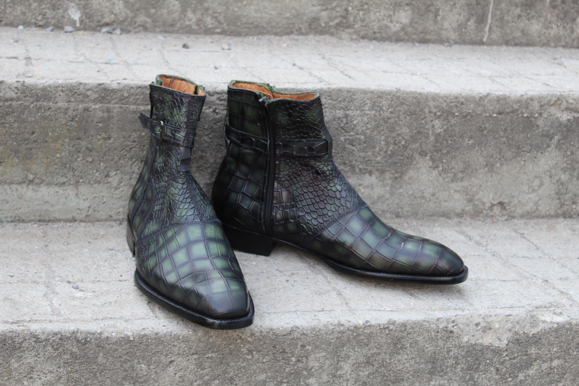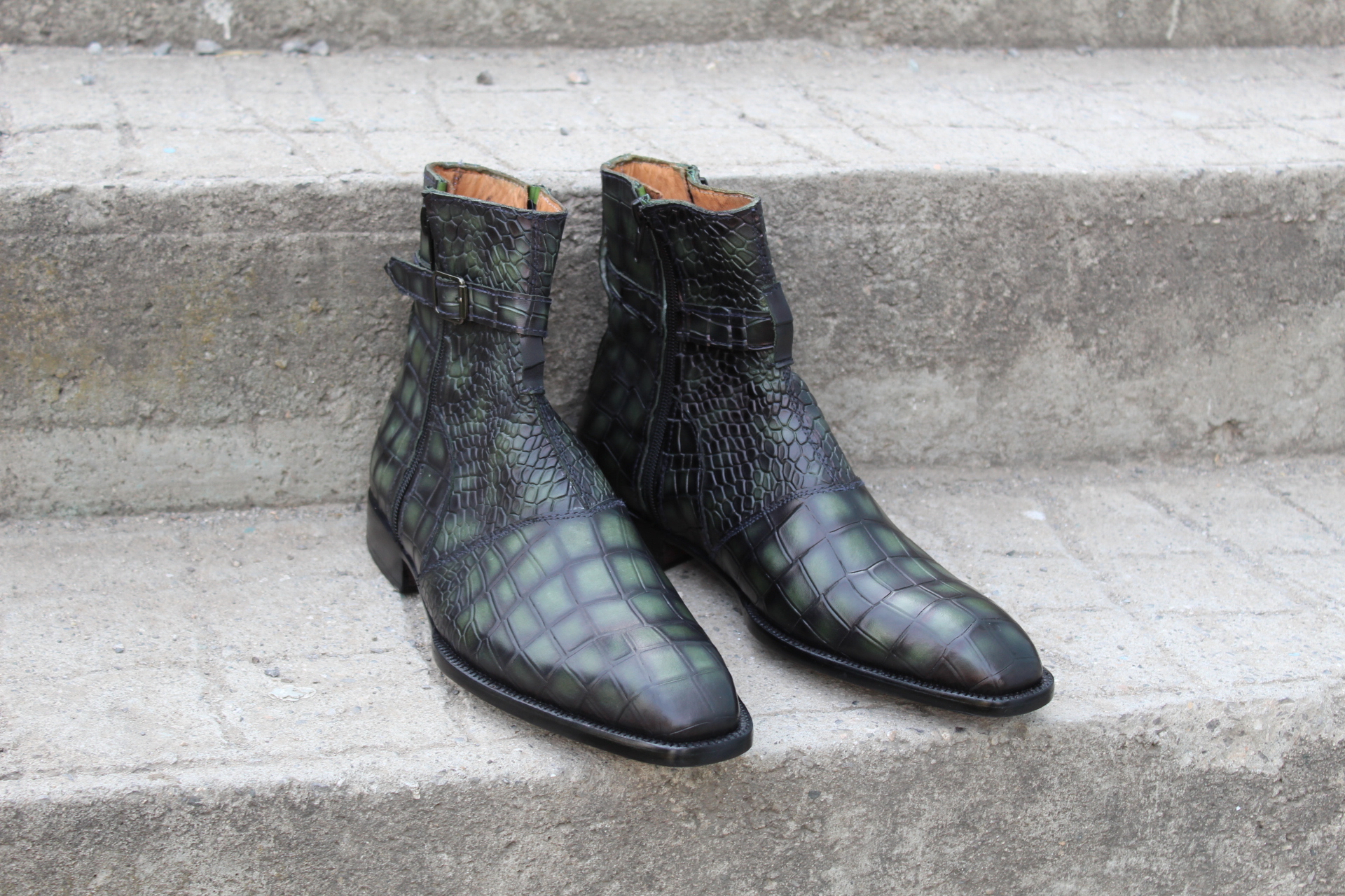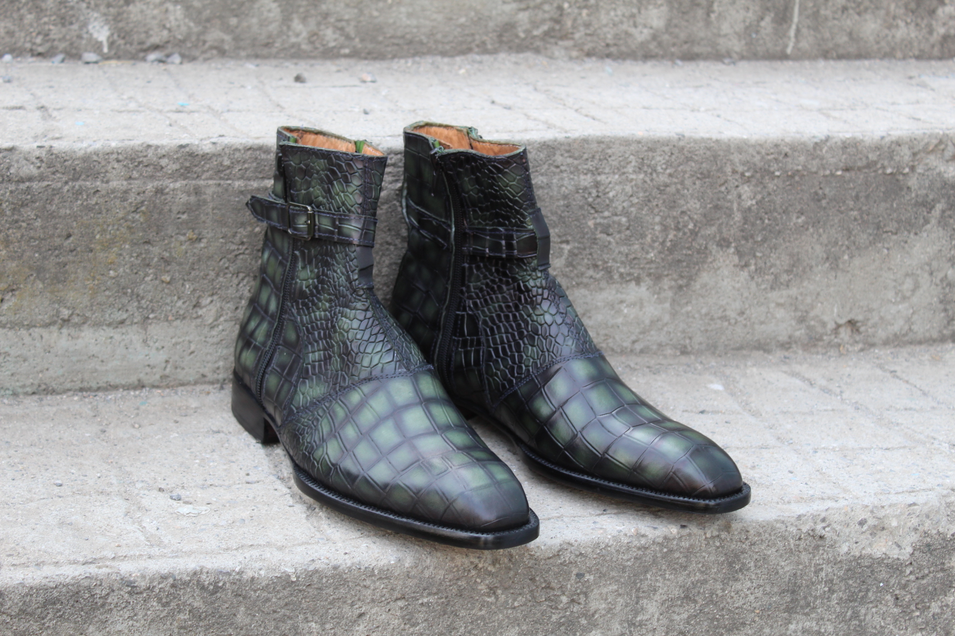 Crafted Leather Bespoke Dress Shoes Green Classic Crocodile/Alligator Jodhpur Buckle Strap Boot