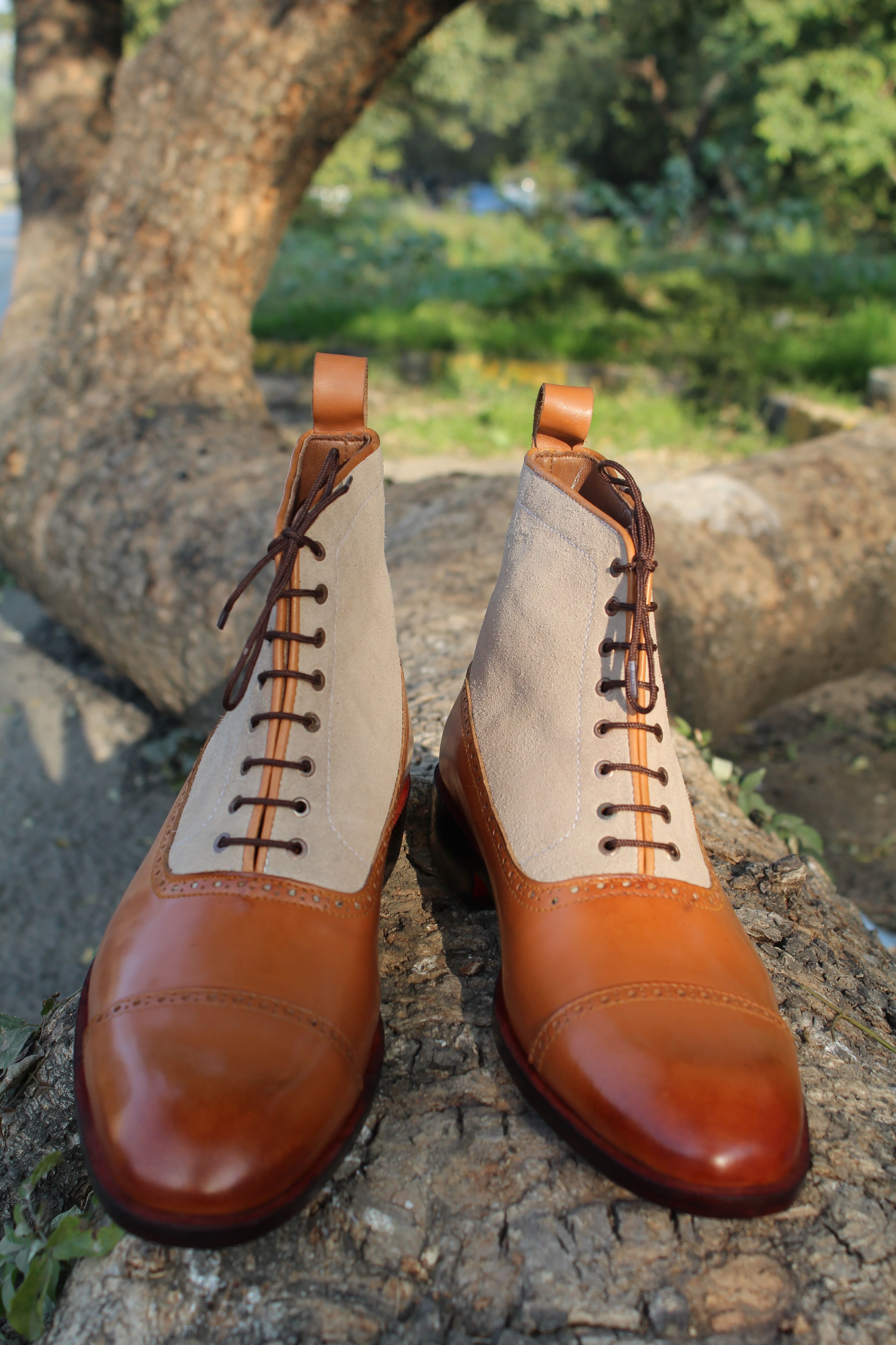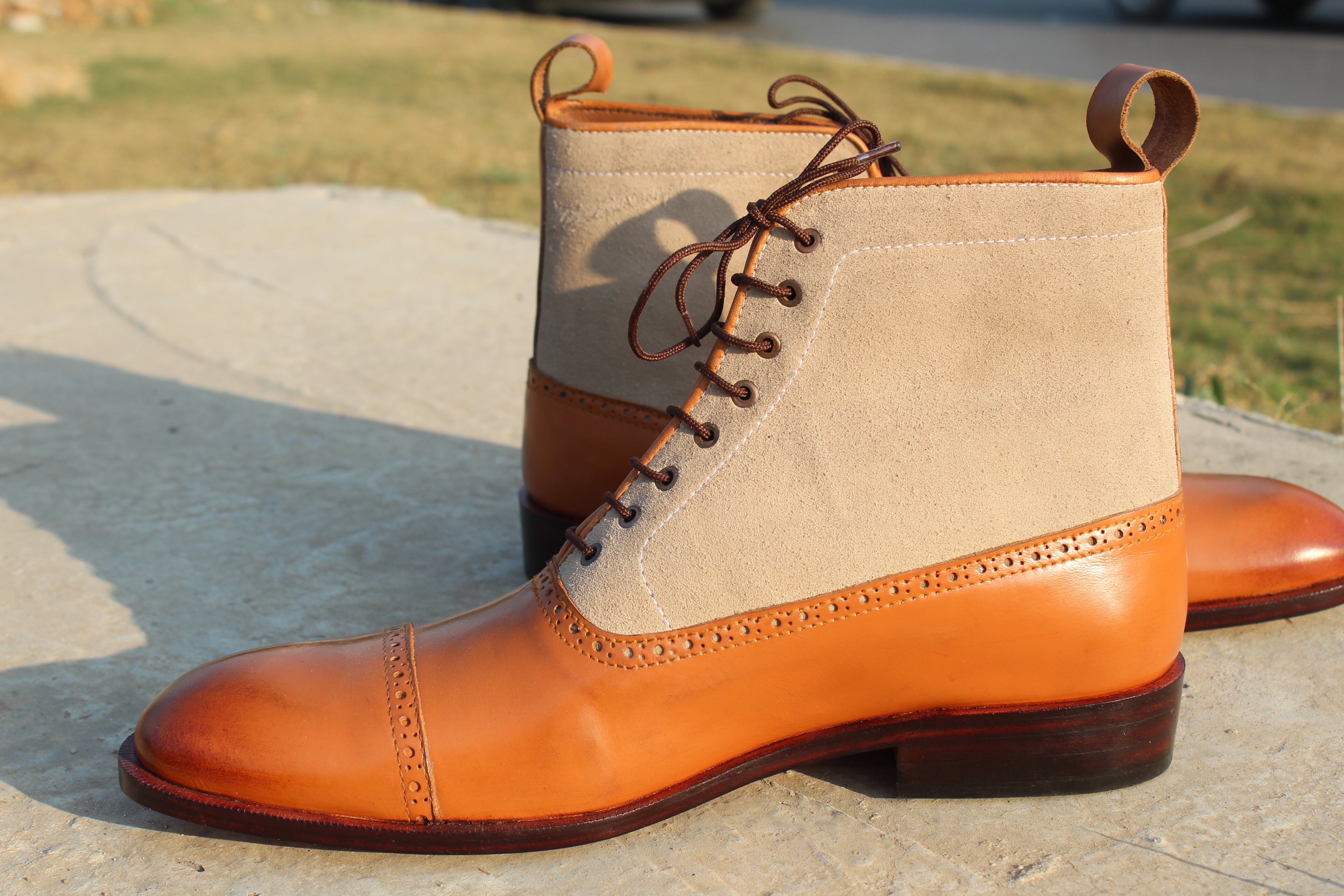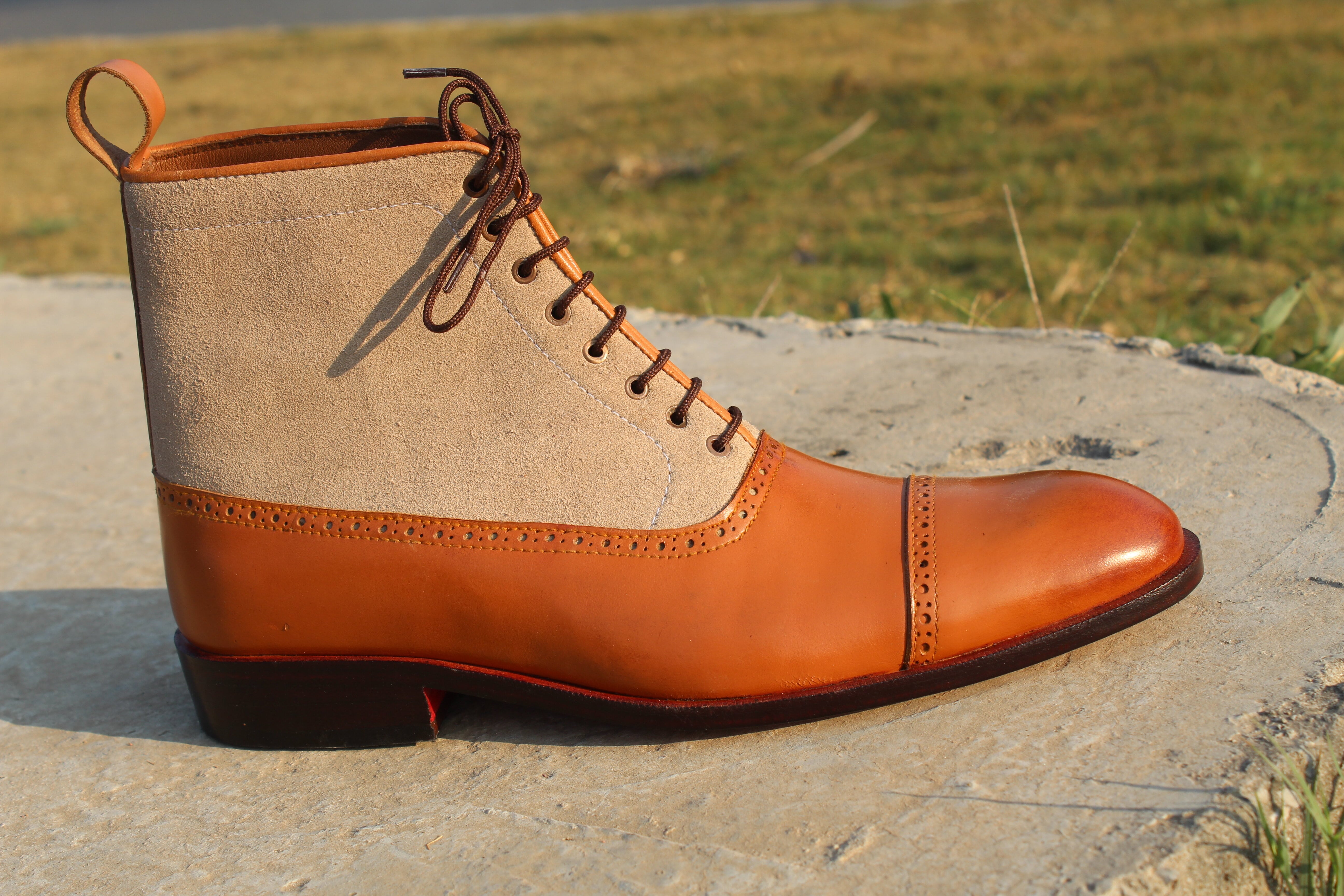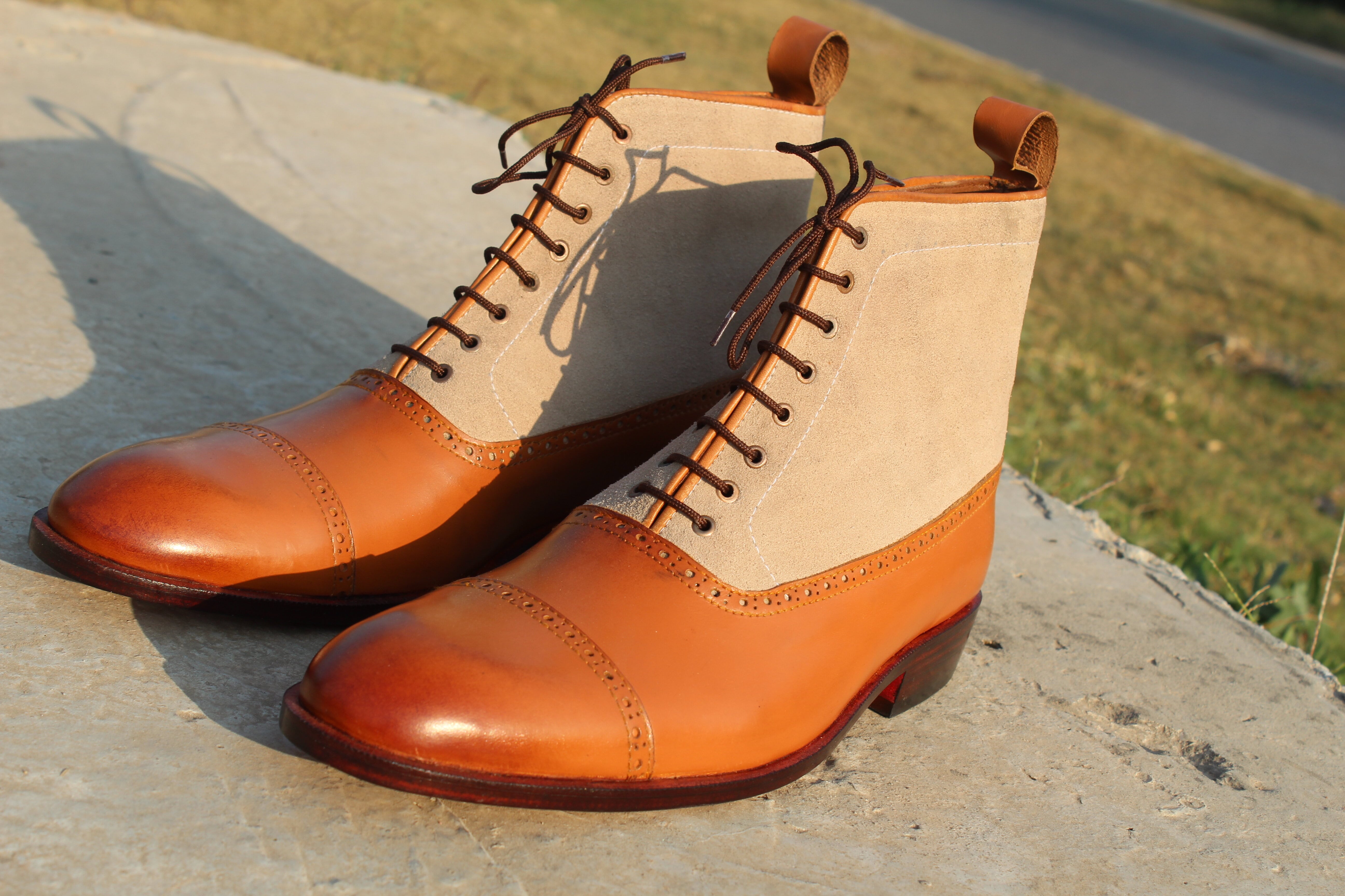 Crafted Leather Bespoke Dress Shoes Beige Brown Suede Leather Ankle High Lace up Boot