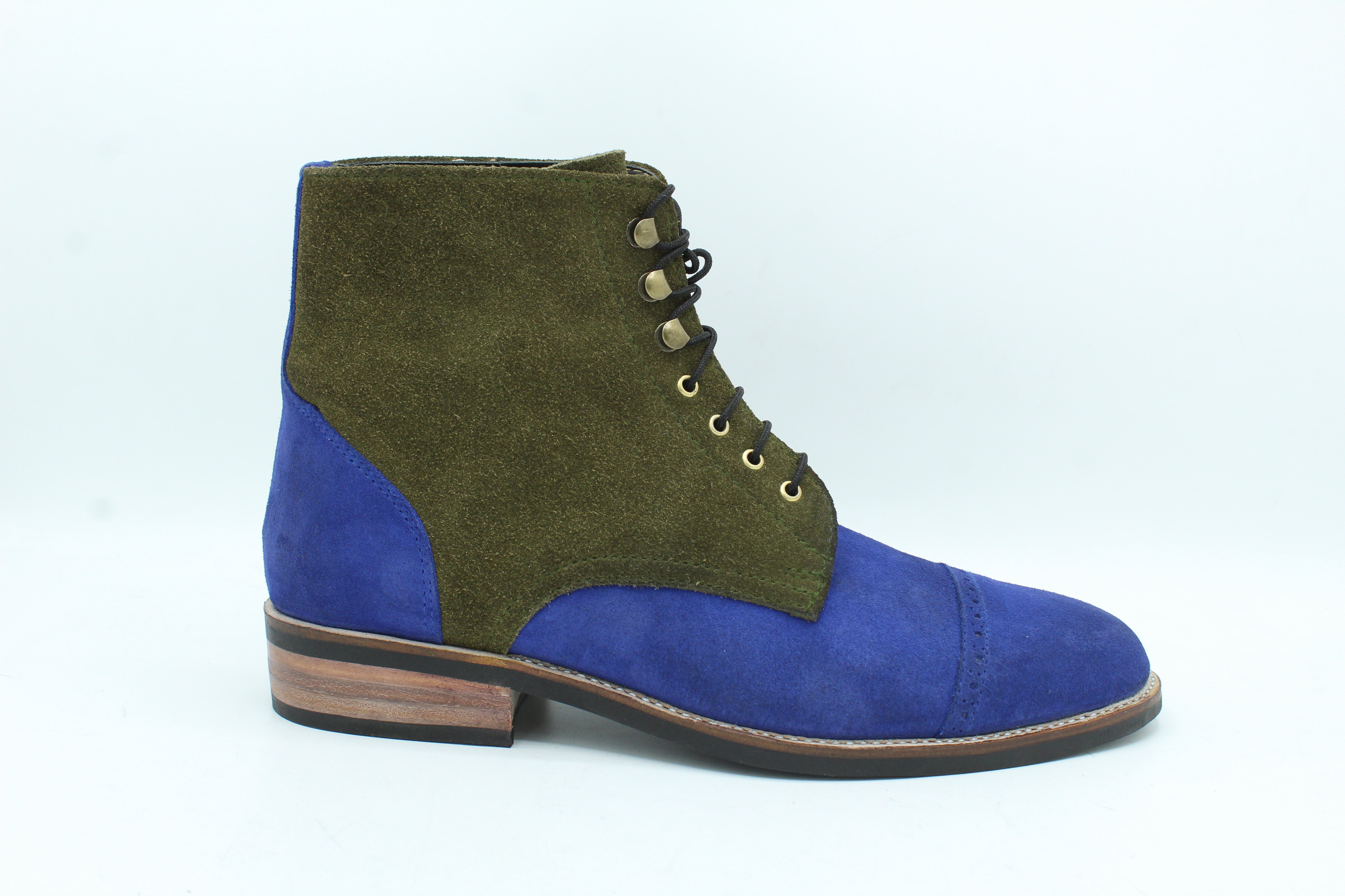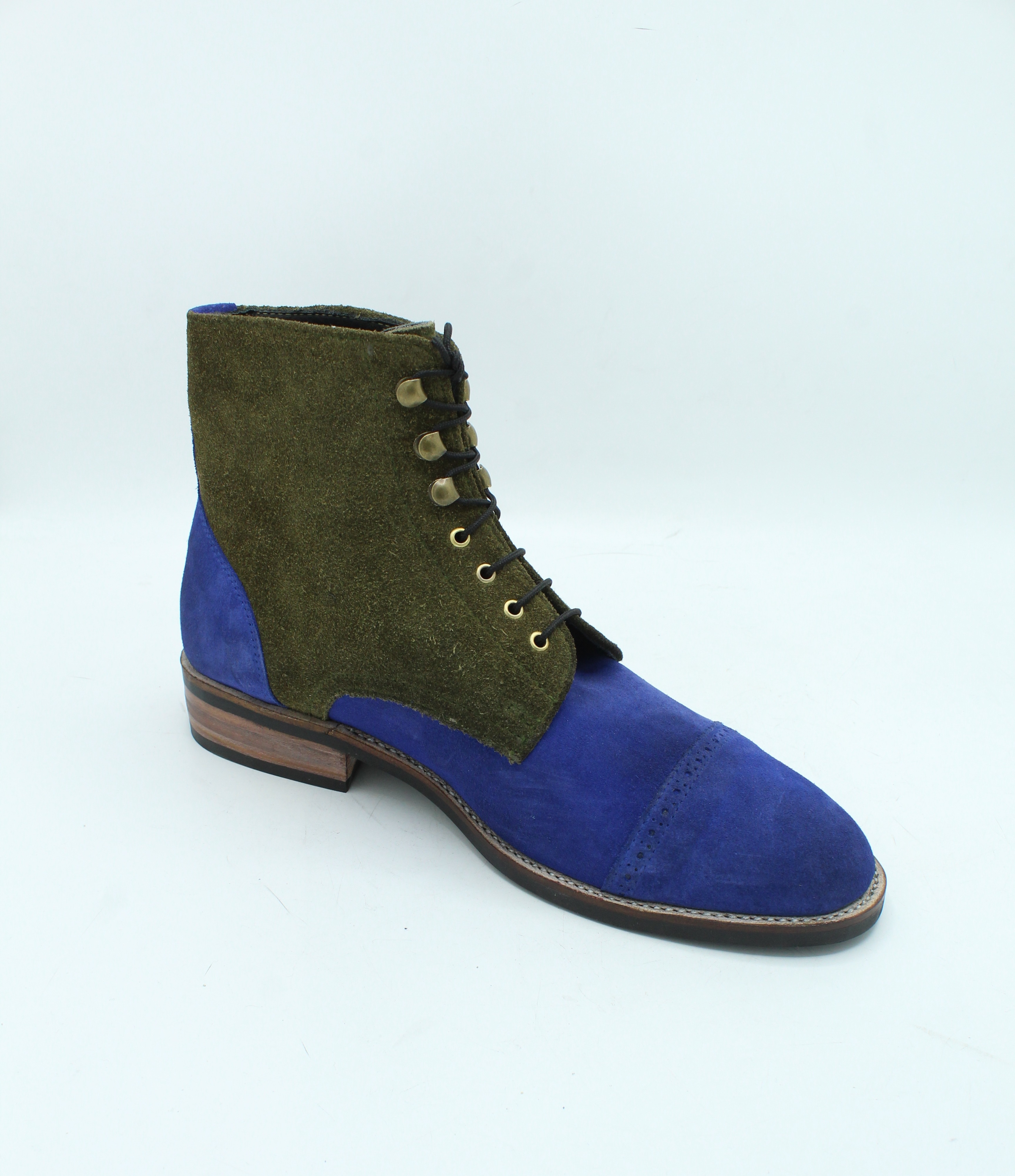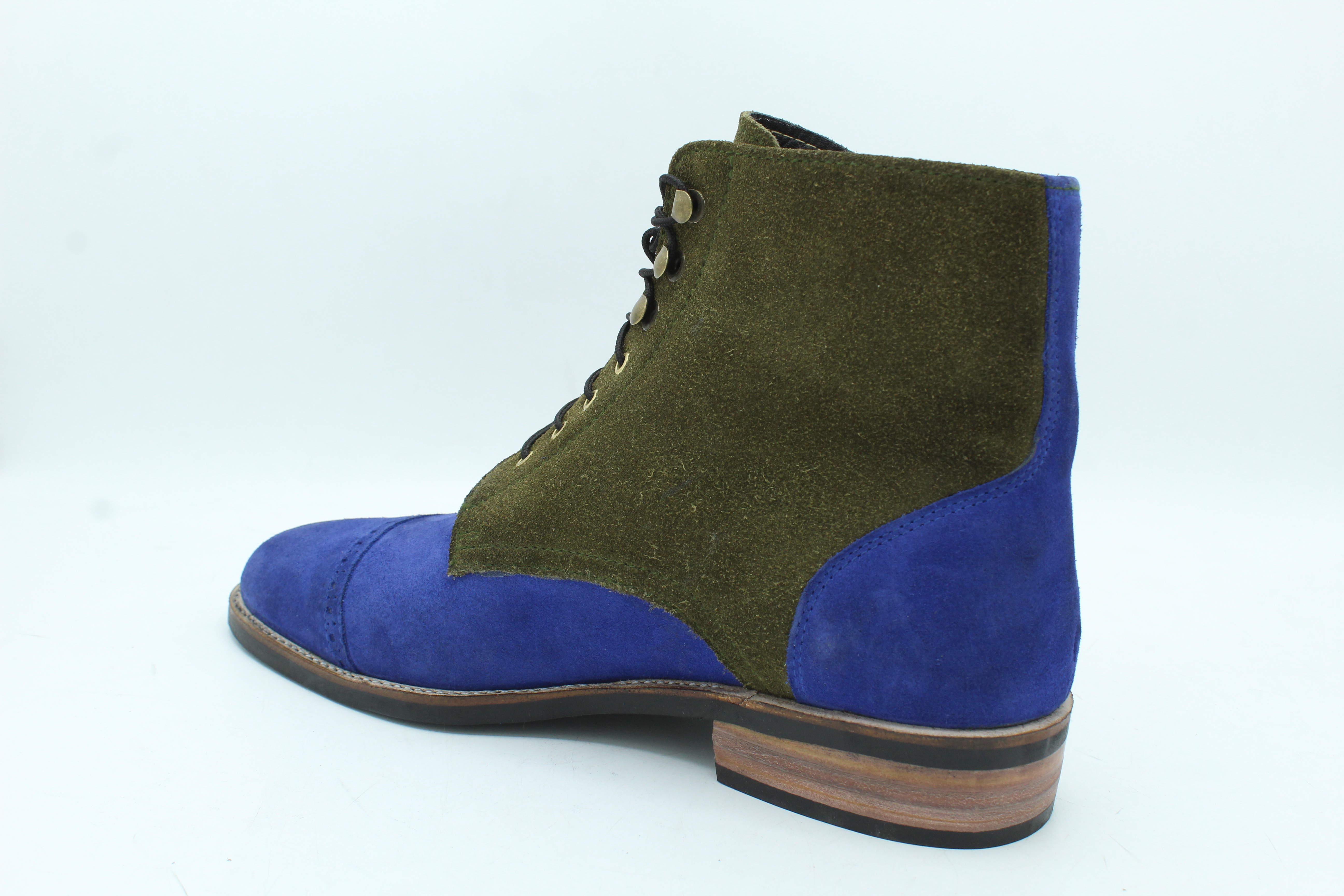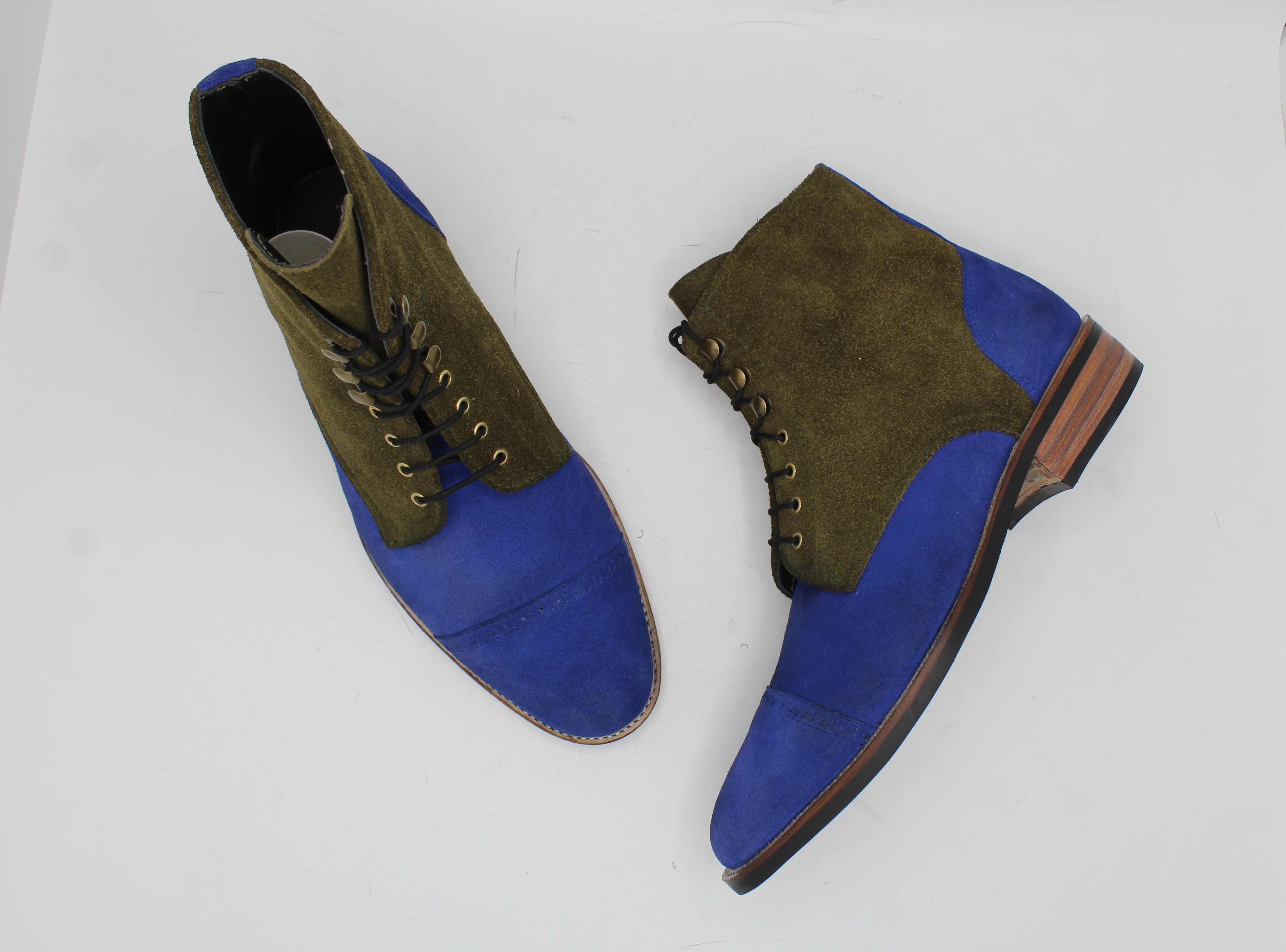 Crafted Leather Bespoke Dress Shoes Blue Green Suede Leather Ankle High Lace up Boot