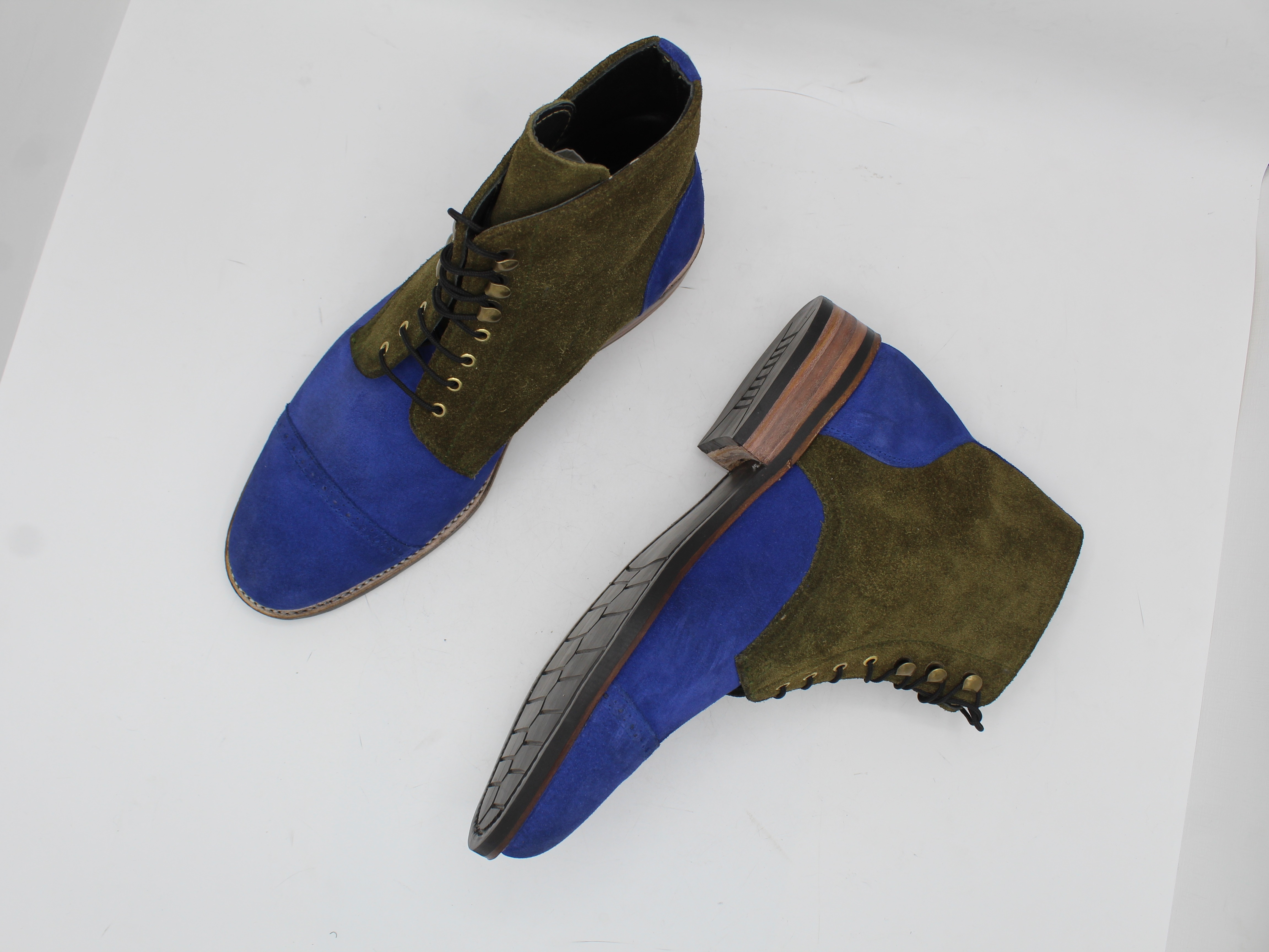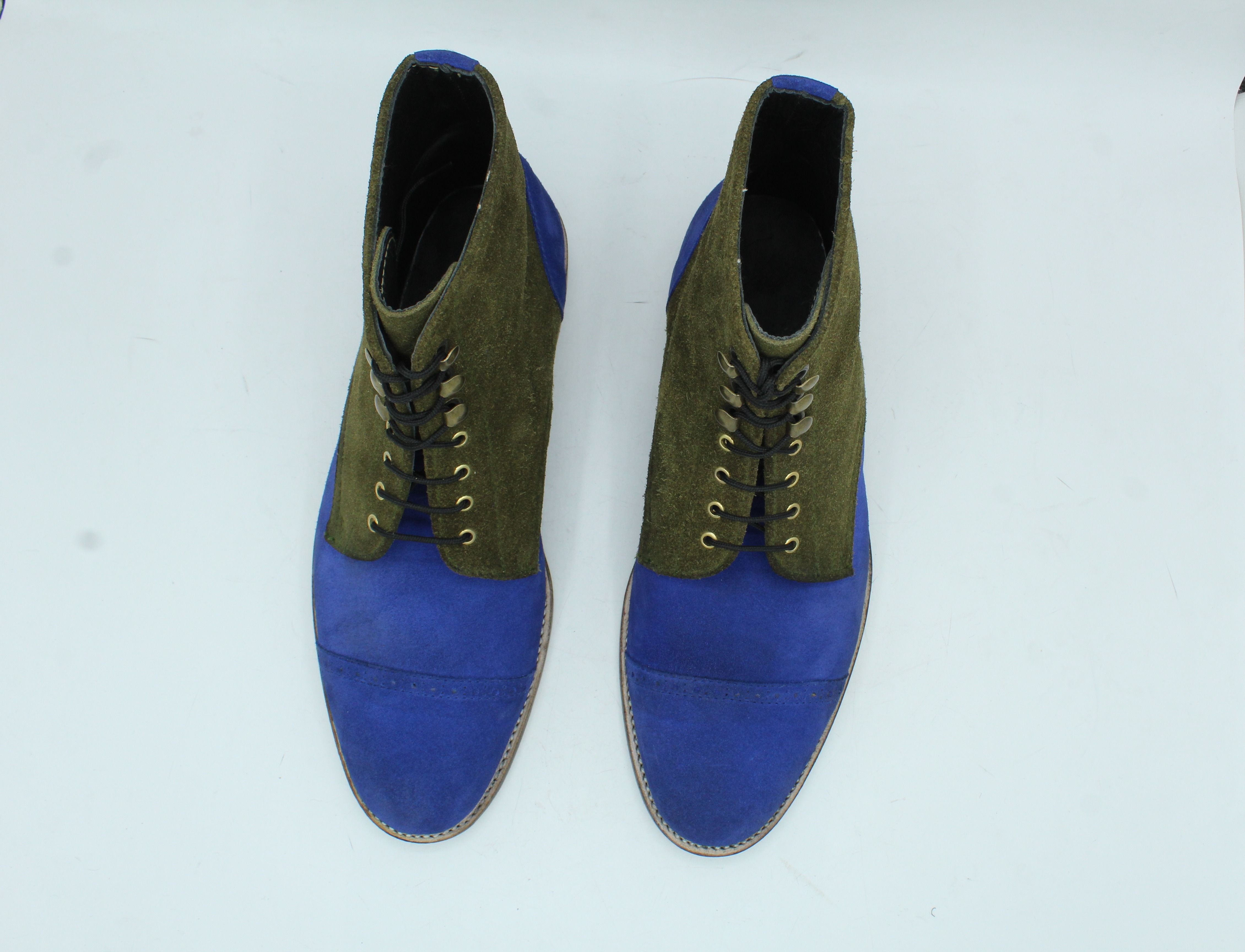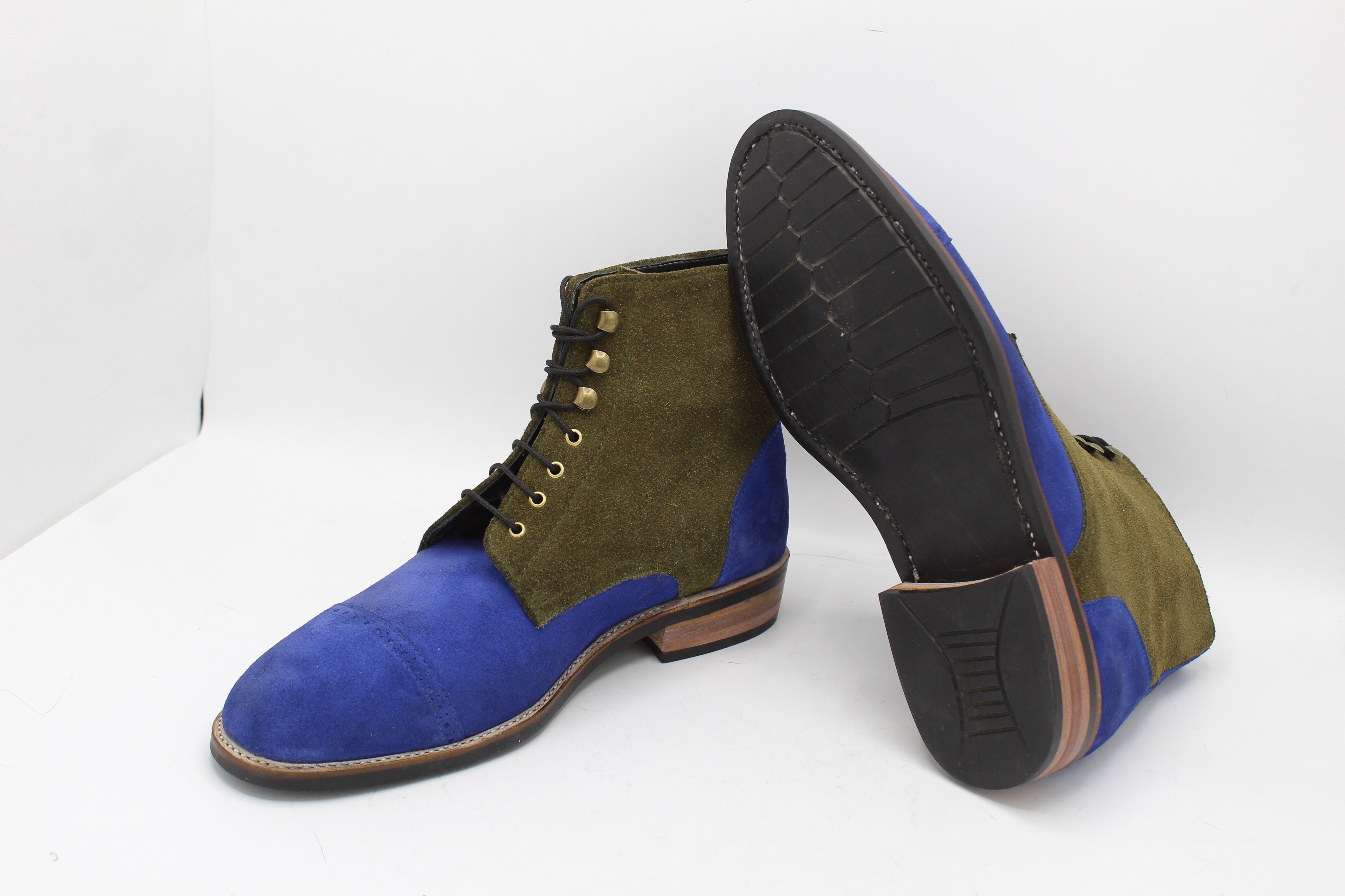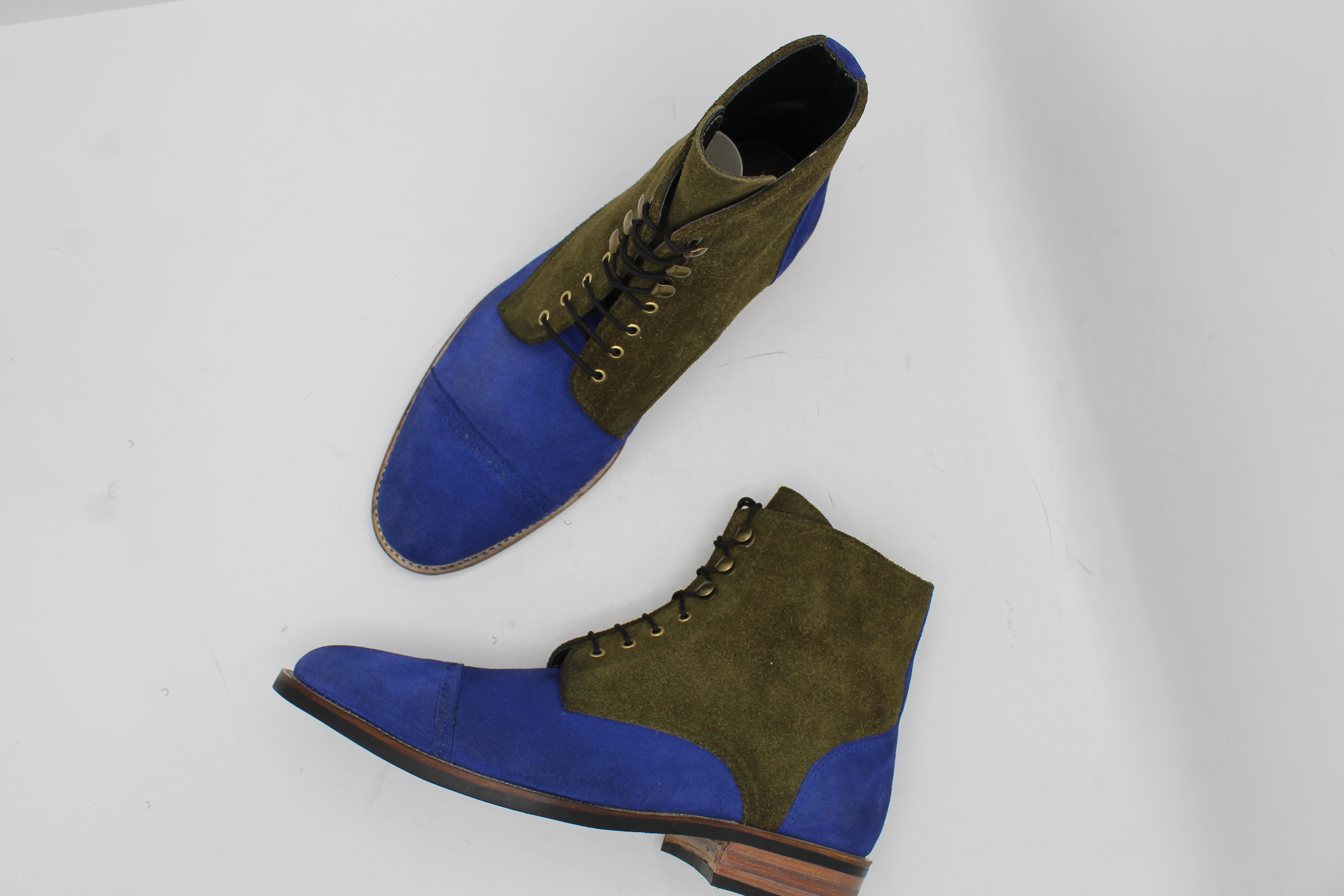 Crafted Leather Bespoke Dress Shoes Blue Green Suede Leather Ankle High Lace up Boot