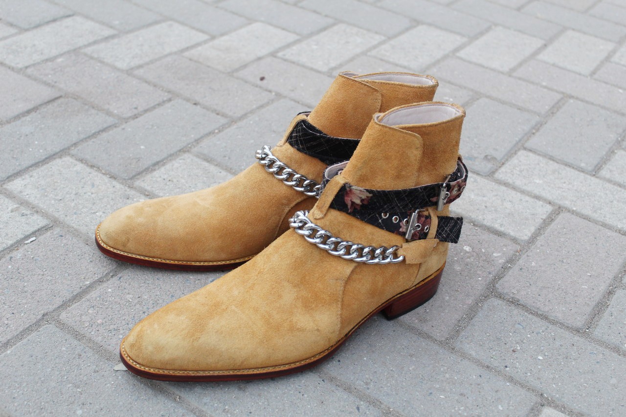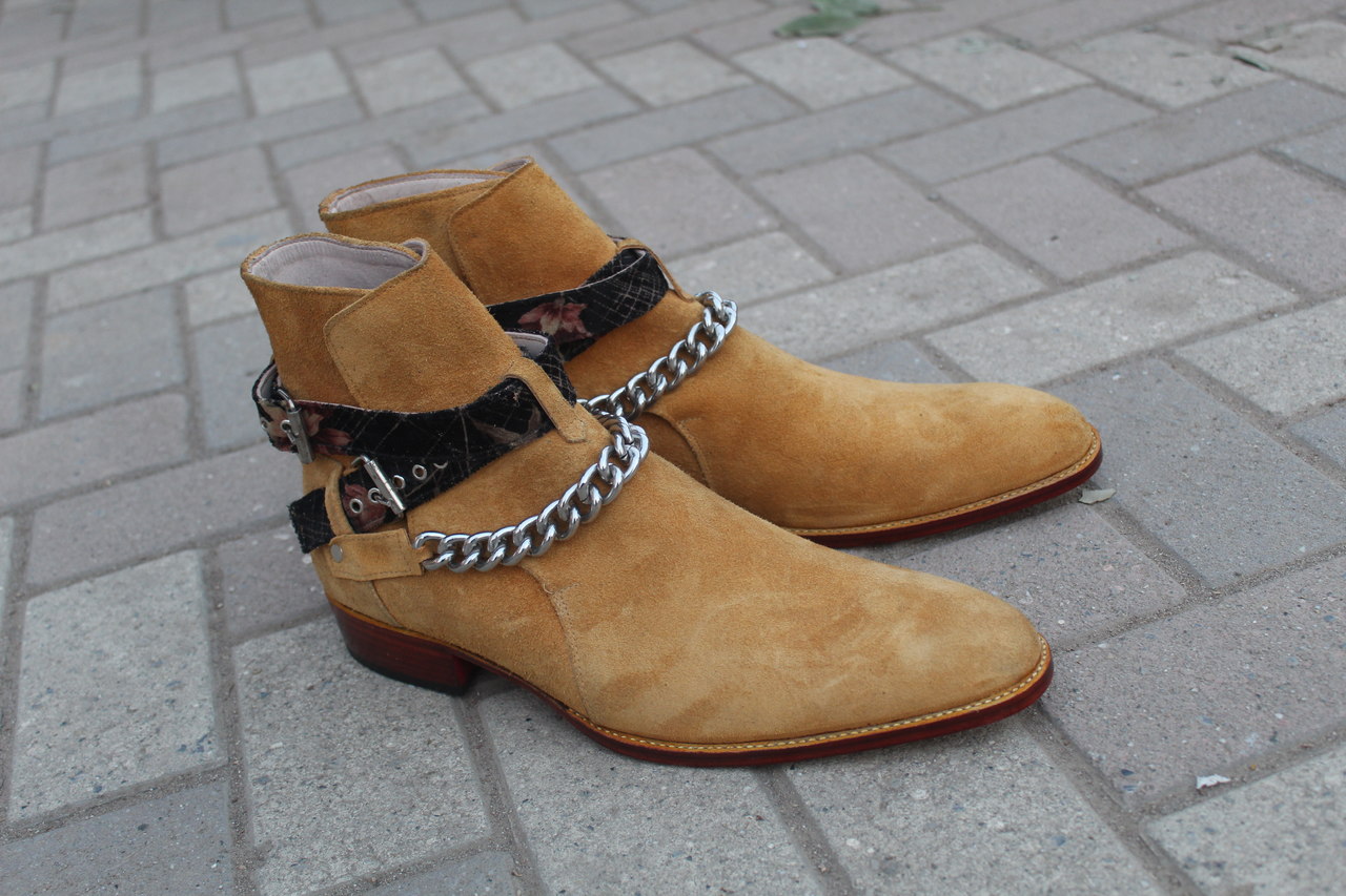 Crafted Leather New Handmade Pure Suede Leather Beige Stylish Chain Ankle High Strap Boot for Men