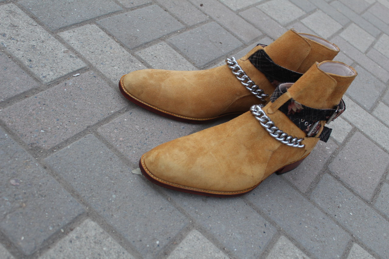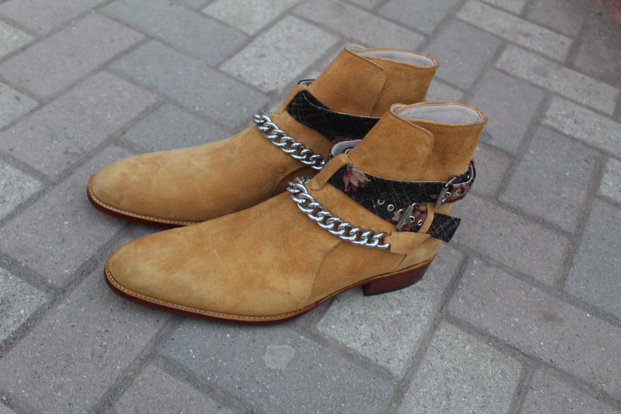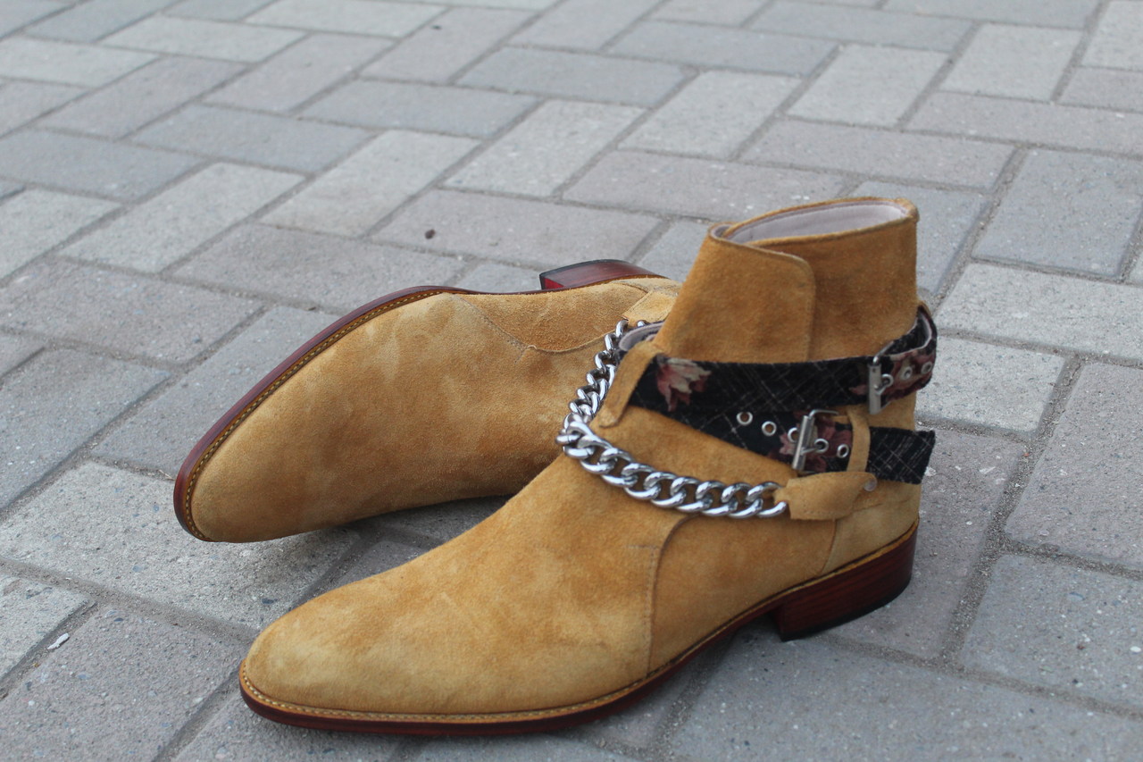 Inner: Soft Leather Sole: Leather ( Goodyear Welted ) Gender : Male Heel: Leather Color: Beige Style: Stylish Chain Ankle Strap Boot for Men Totally Hand stitched Manufacturing time 7-10 business days If you can’t find your Size/Colorjust send us message we will make for you.