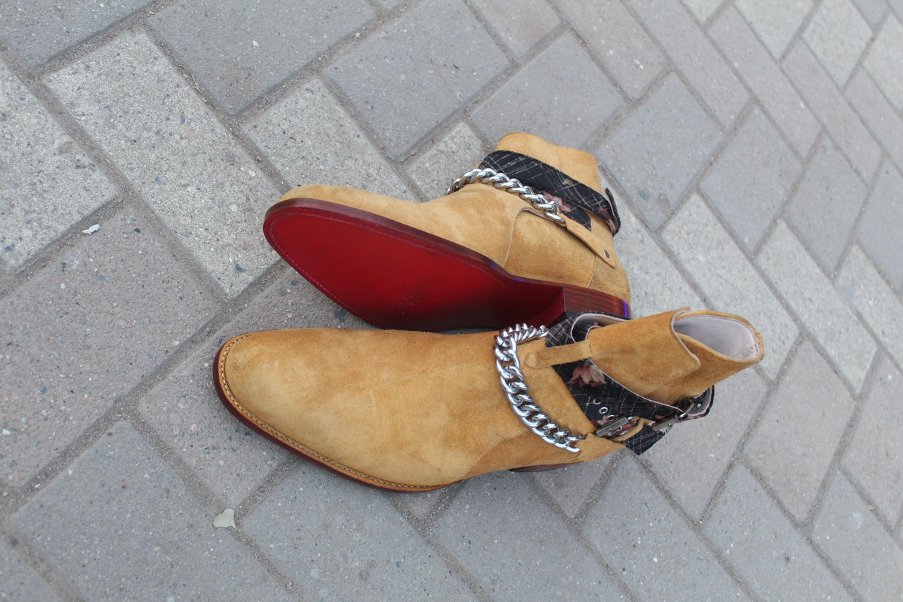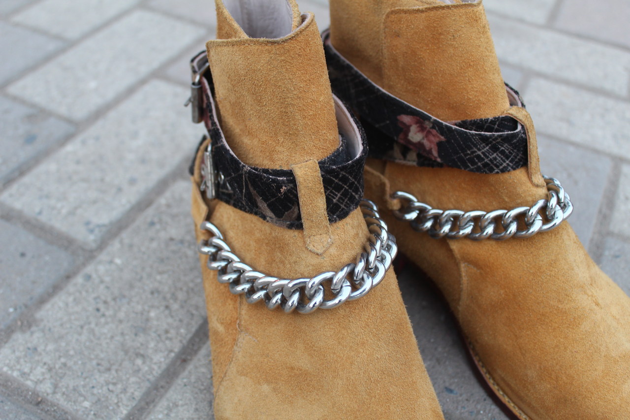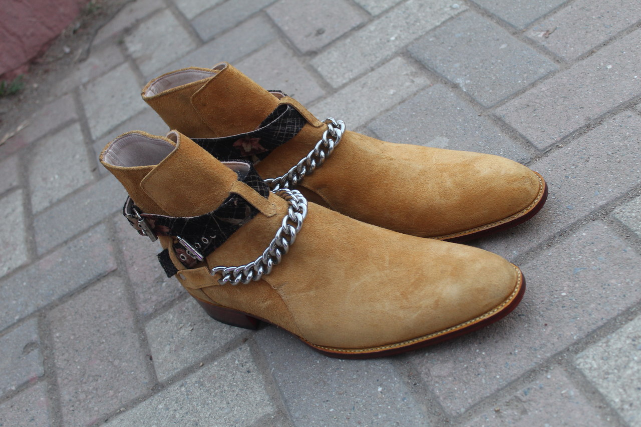 Inner: Soft Leather Sole: Leather ( Goodyear Welted ) Gender : Male Heel: Leather Color: Beige Style: Stylish Chain Ankle Strap Boot for Men Totally Hand stitched Manufacturing time 7-10 business days If you can’t find your Size/Colorjust send us message we will make for you.
