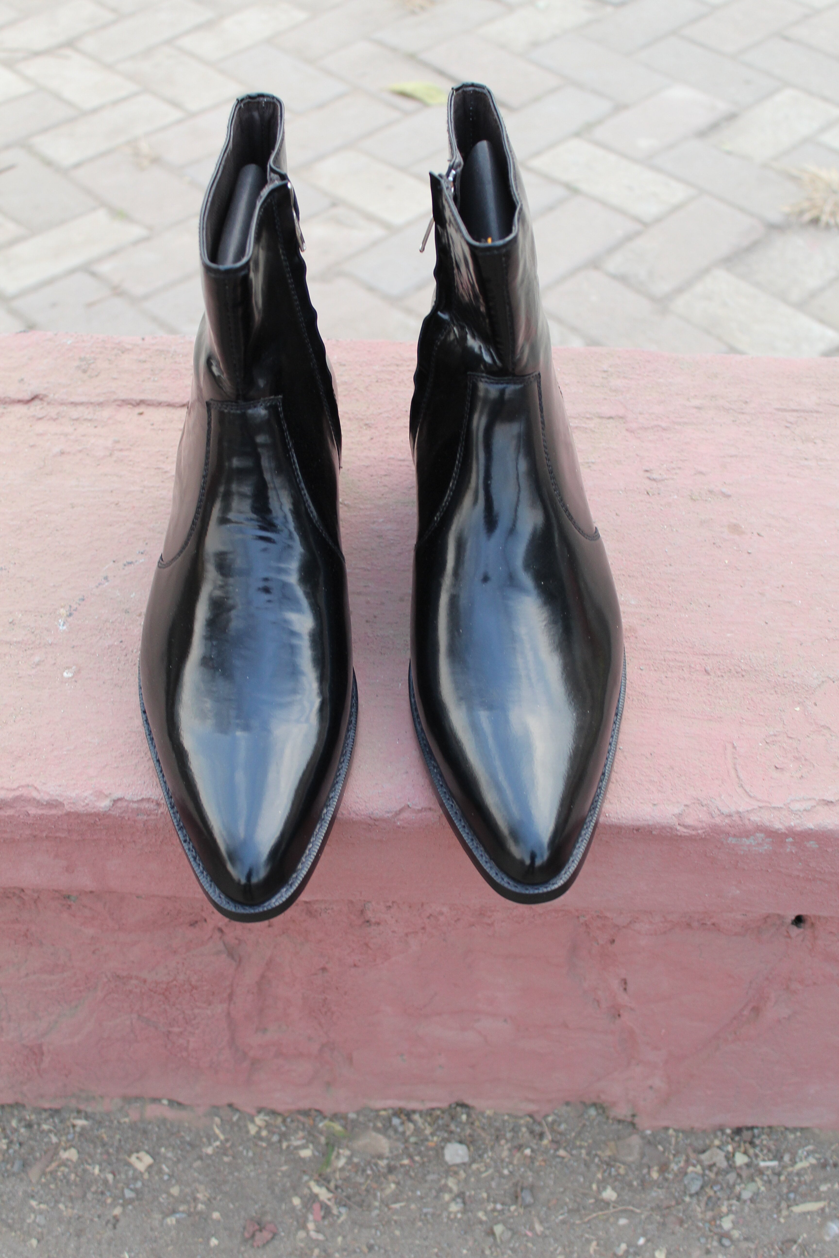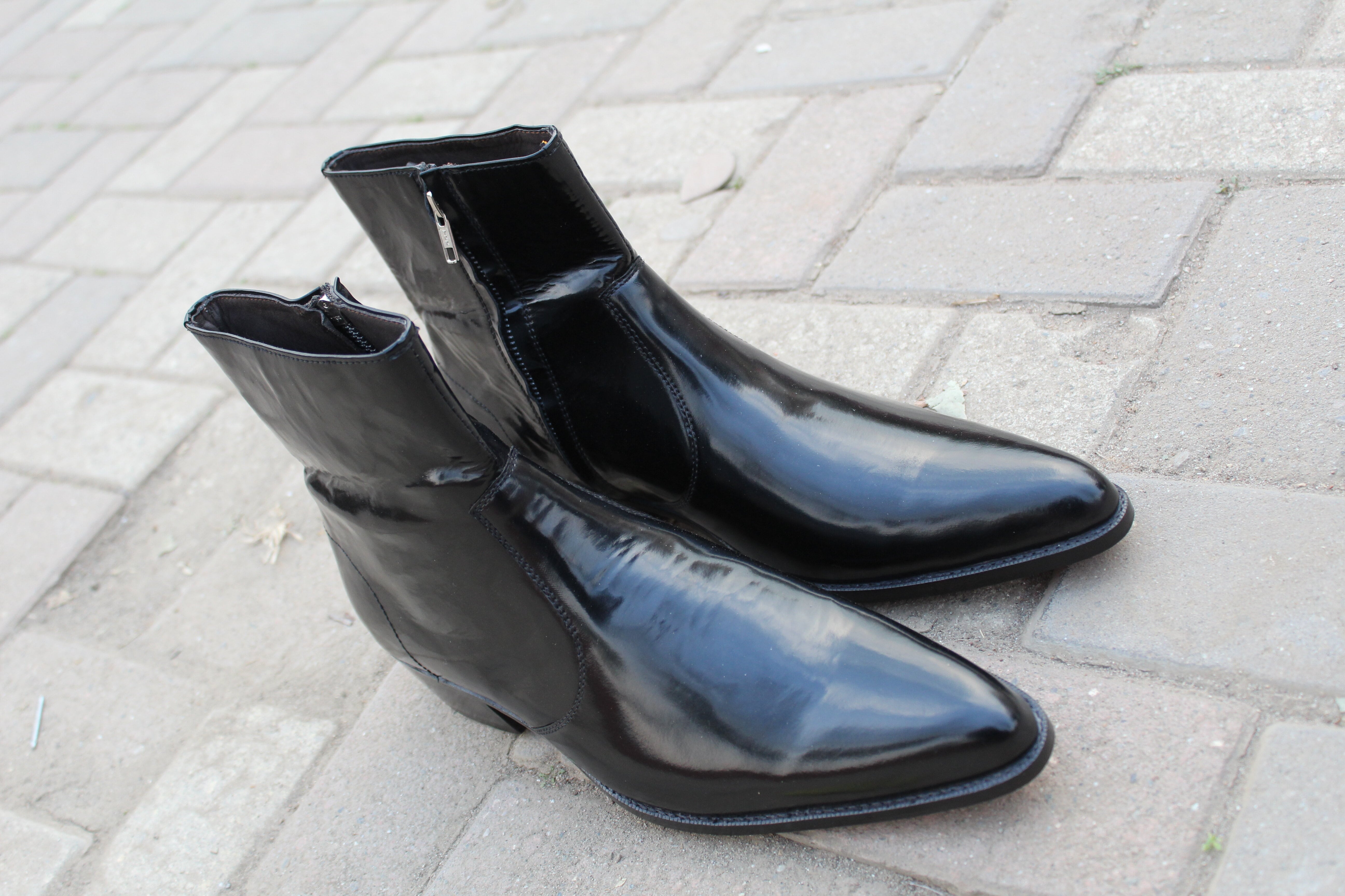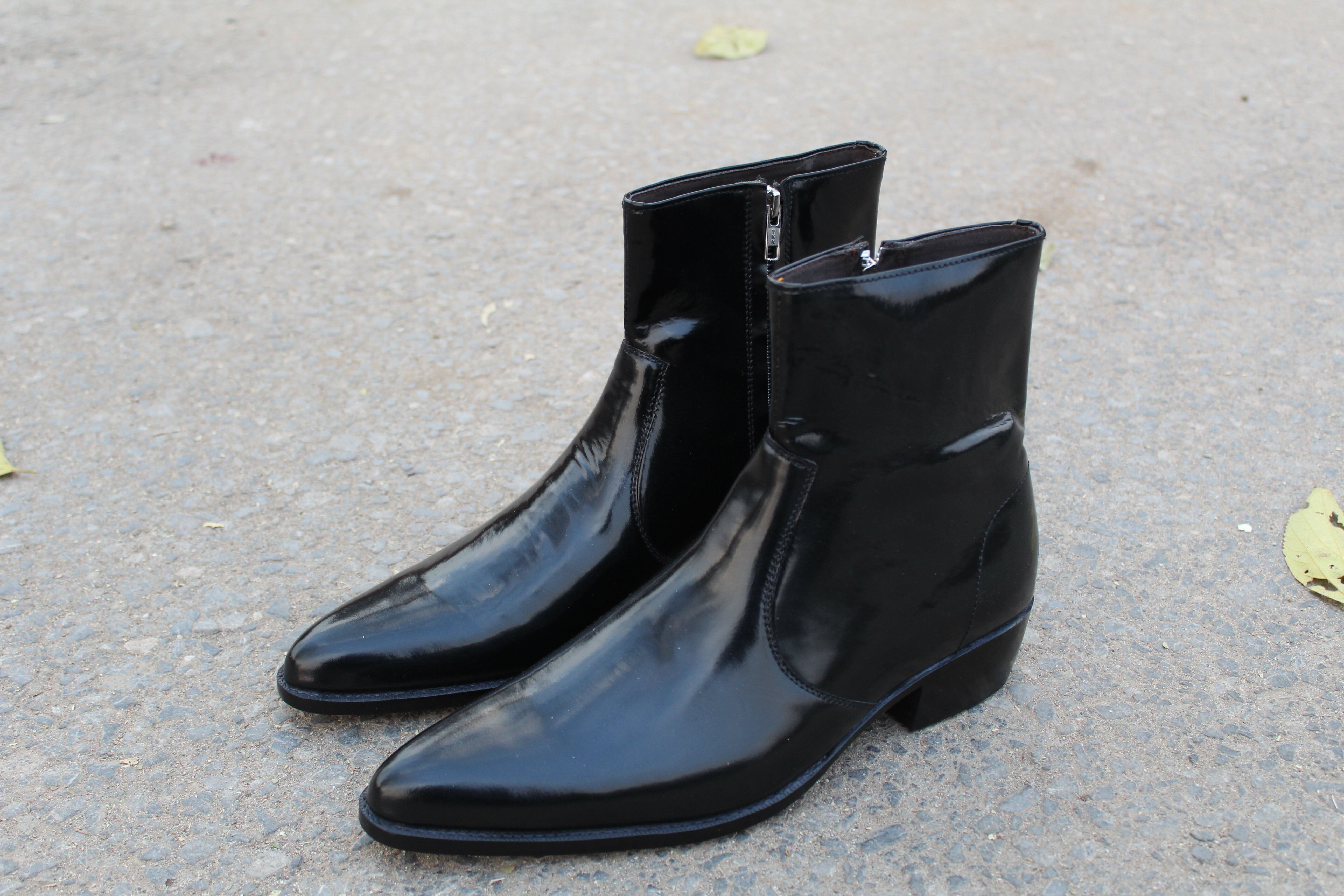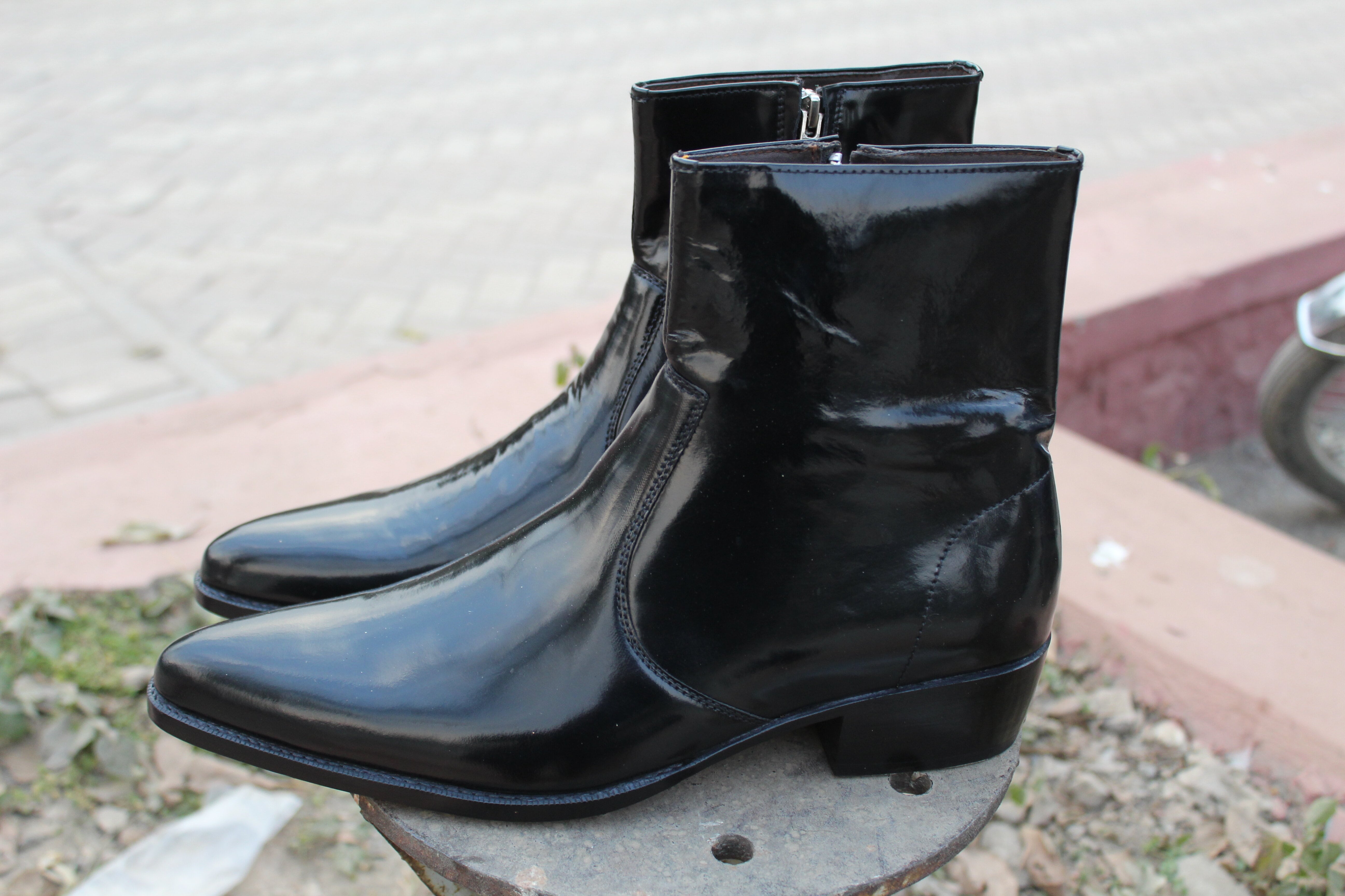 Crafted Leather Handmade Black Patent Leather Pointed Toe High Side Zipper Jodhpur Boot
