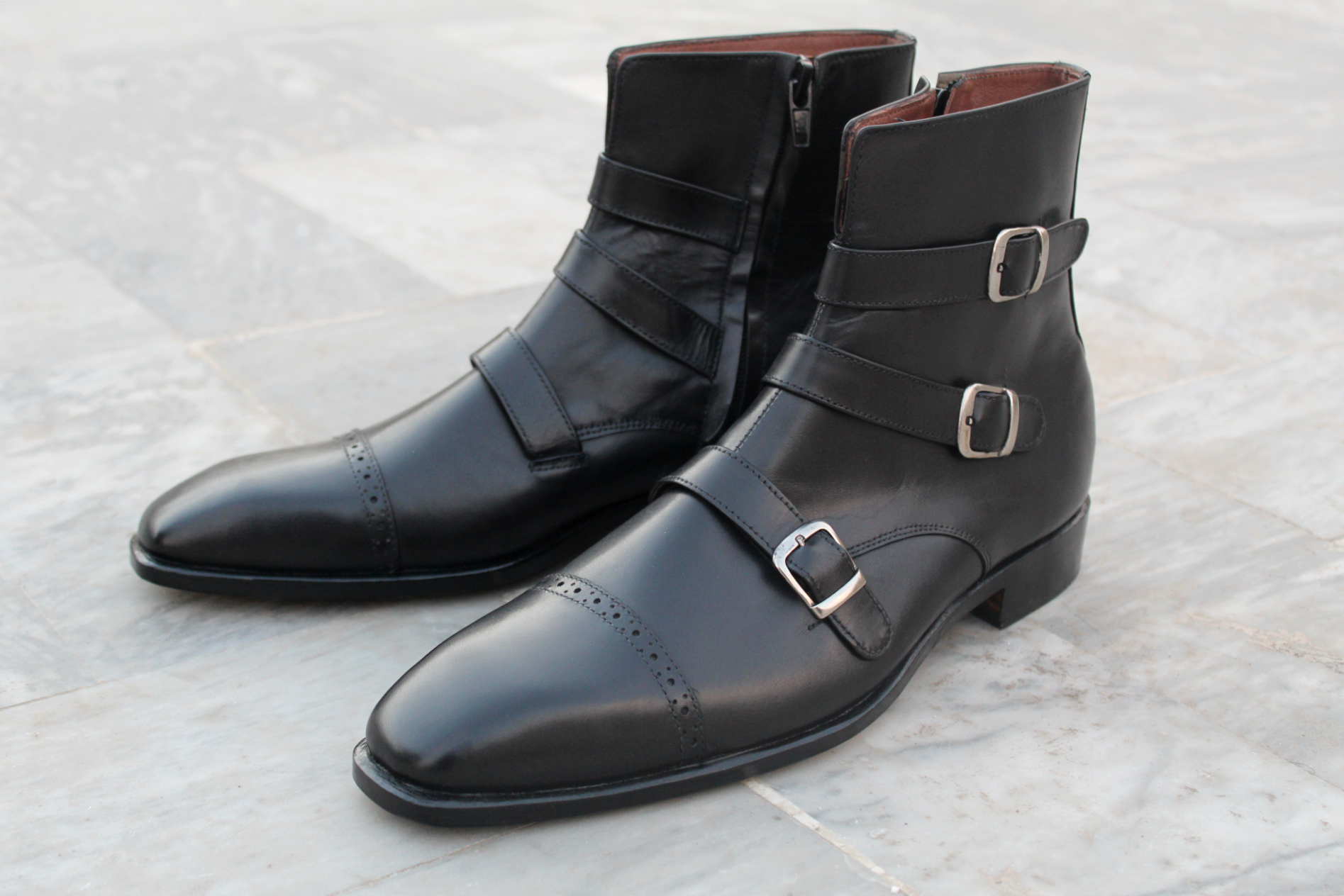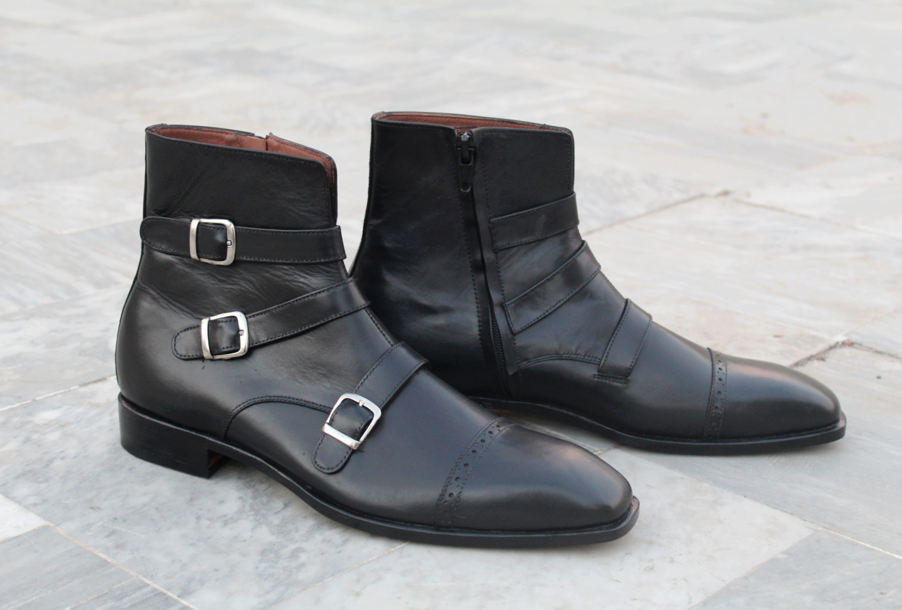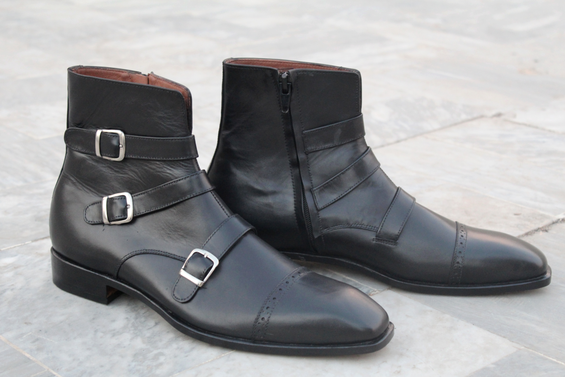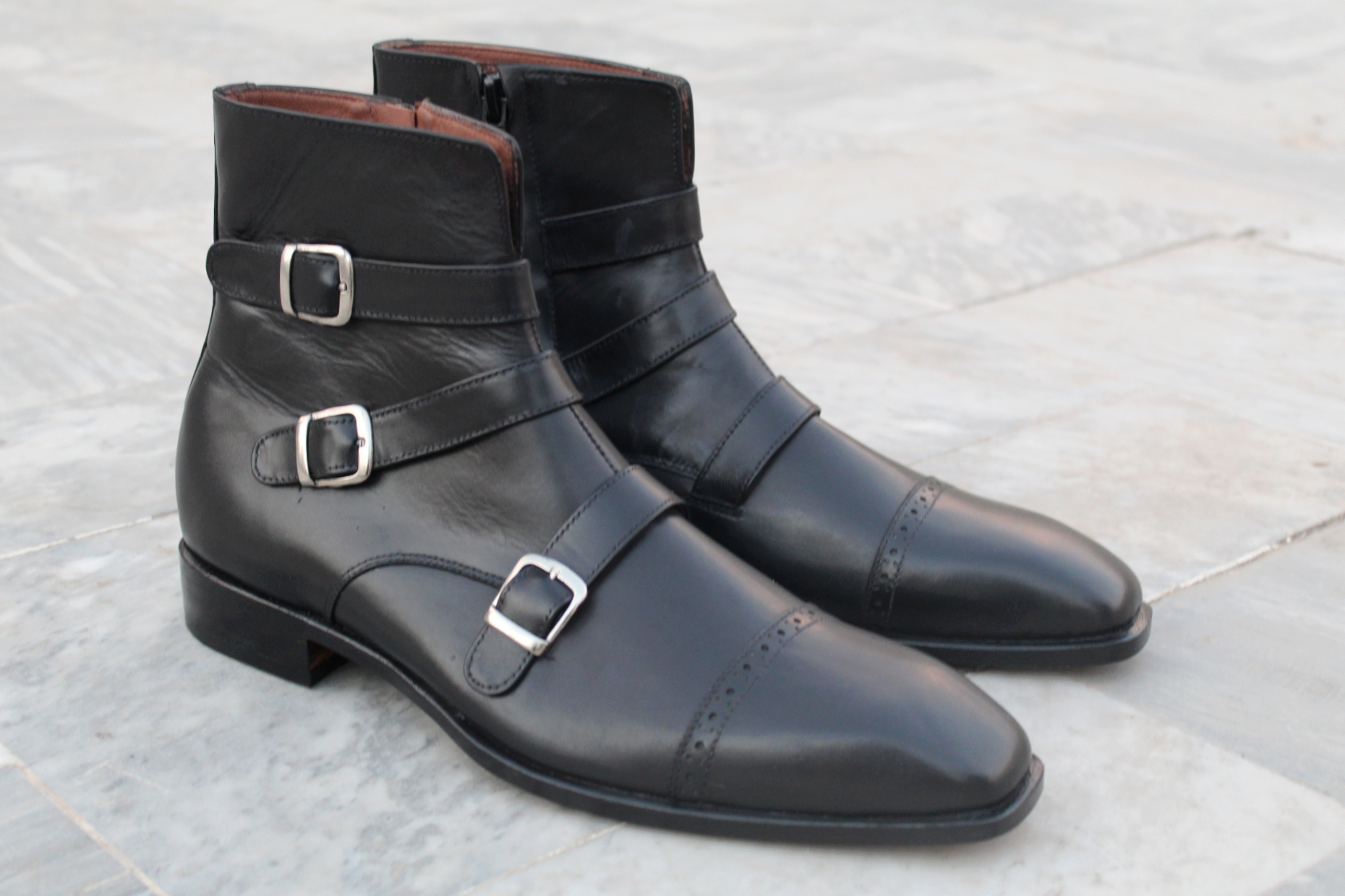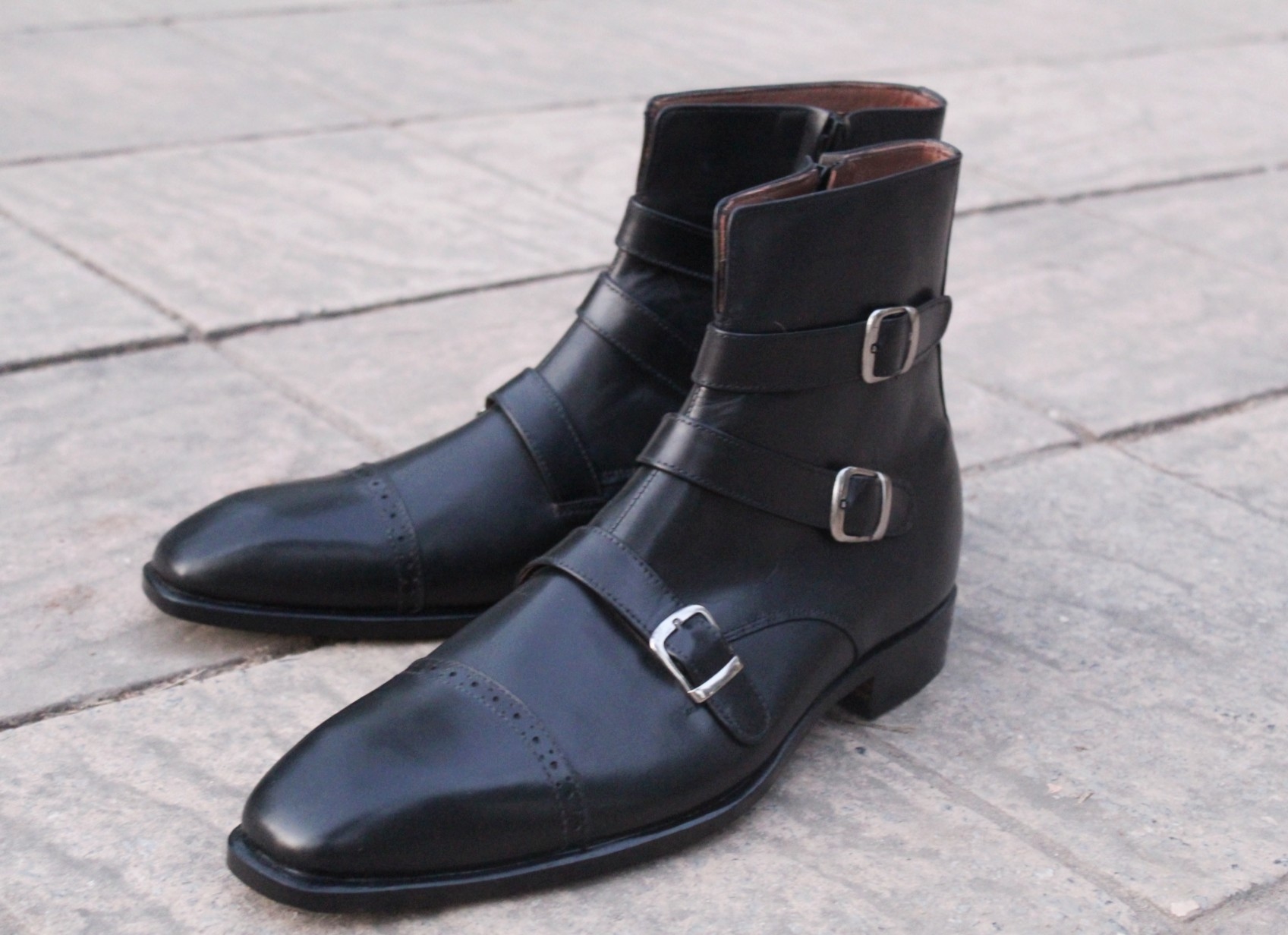 Crafted Leather Classic Black Leather Triple Buckle Strap Ankle High Jodhpur Boot