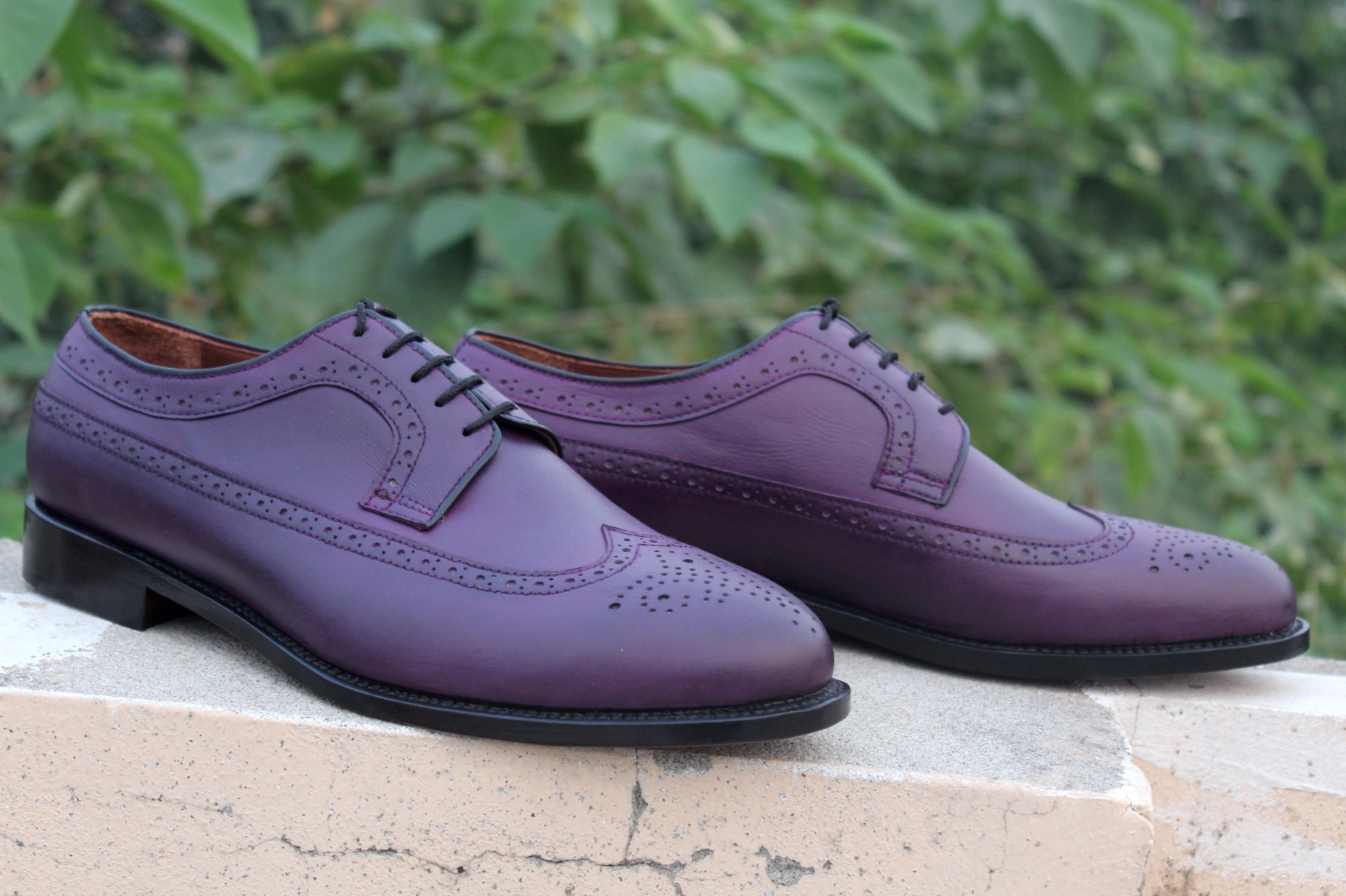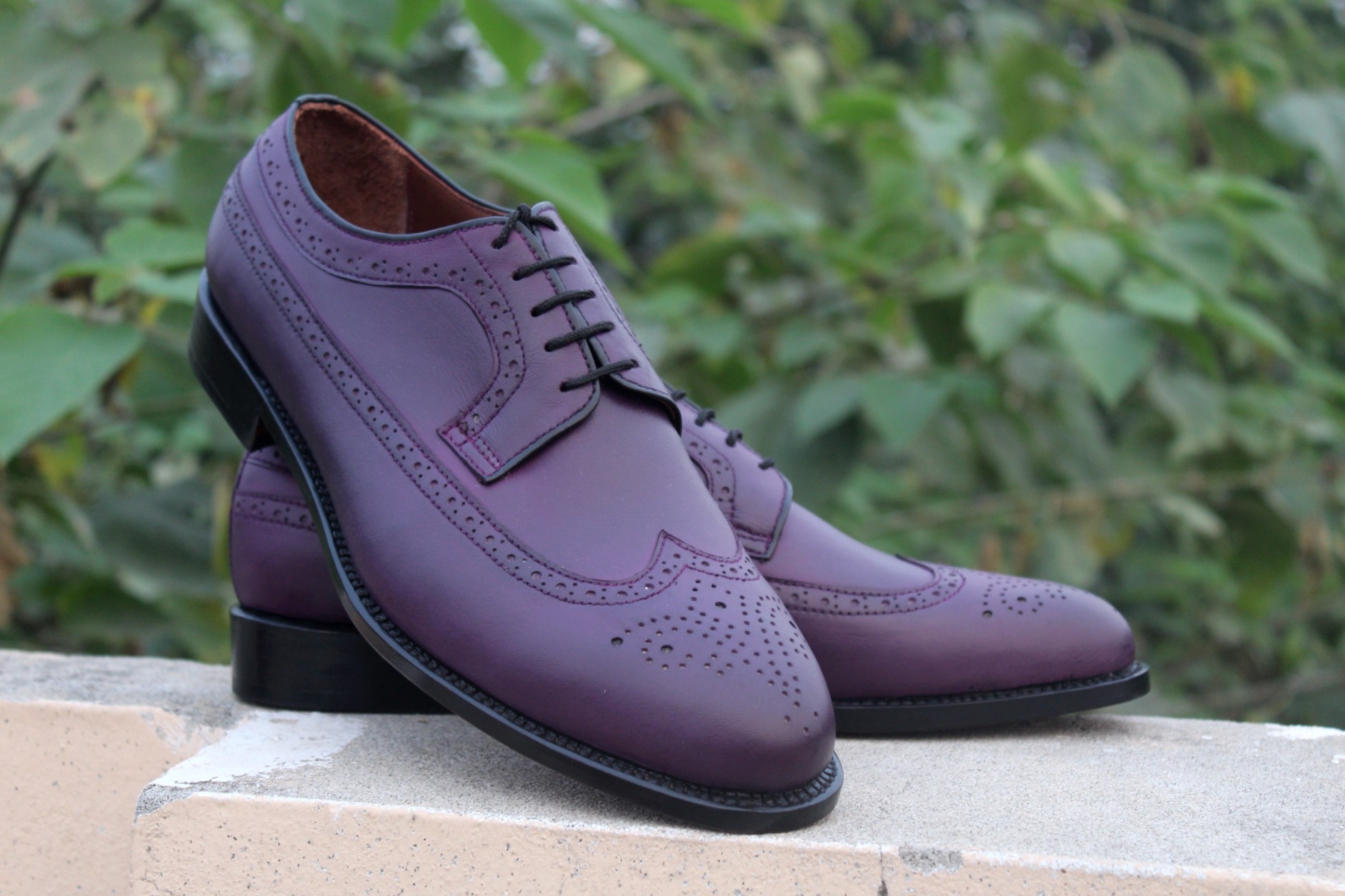 Inner: Soft Leather Sole: Leather Gender : Male Heel: Leather Color: Purple Style: Wingtip Dress Shoes Lining Soft Calf Leather Lining Totally Hand stitched Manufacturing time 7-10 business days If you can’t find your Size/Colorjust send us message we will make for you.