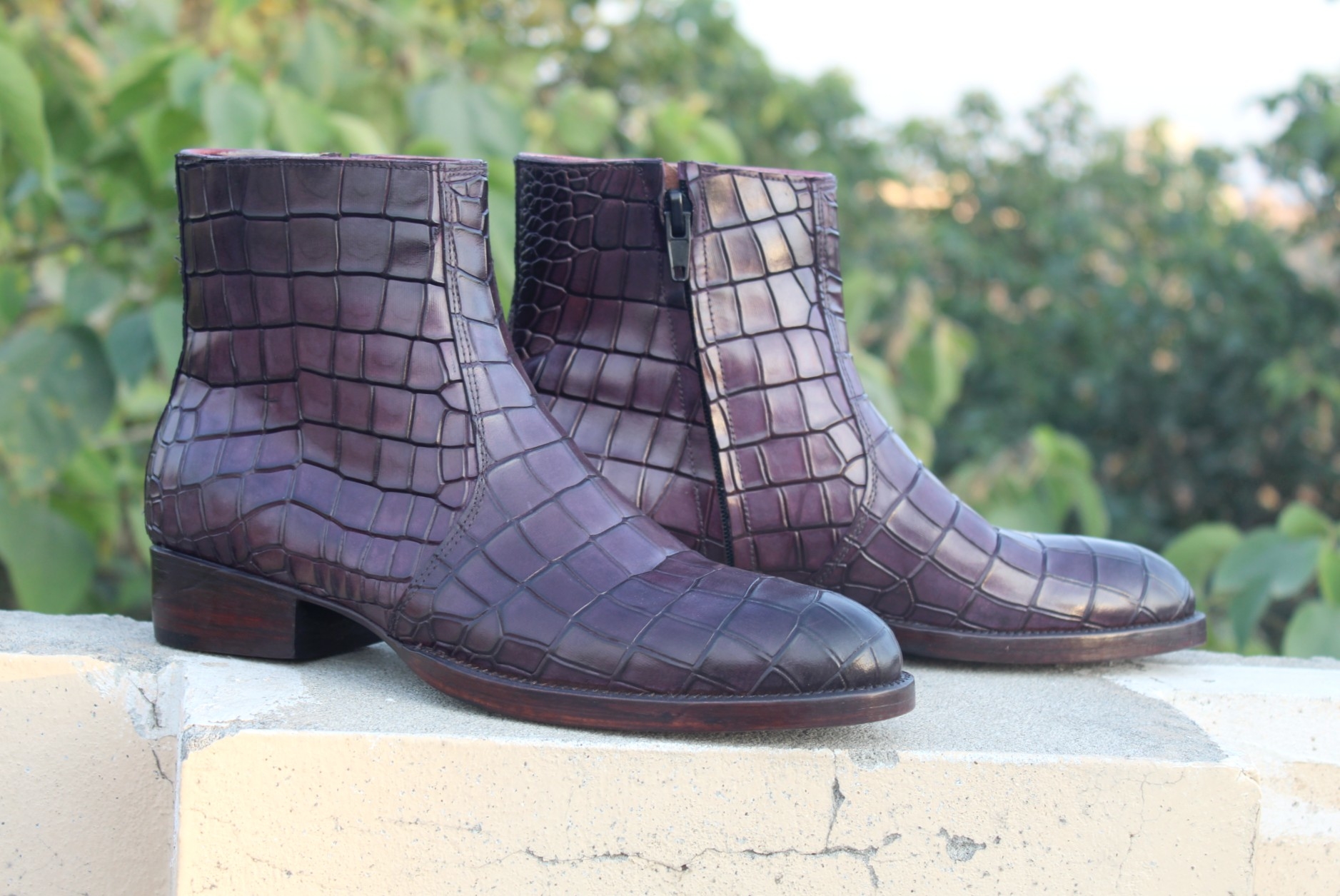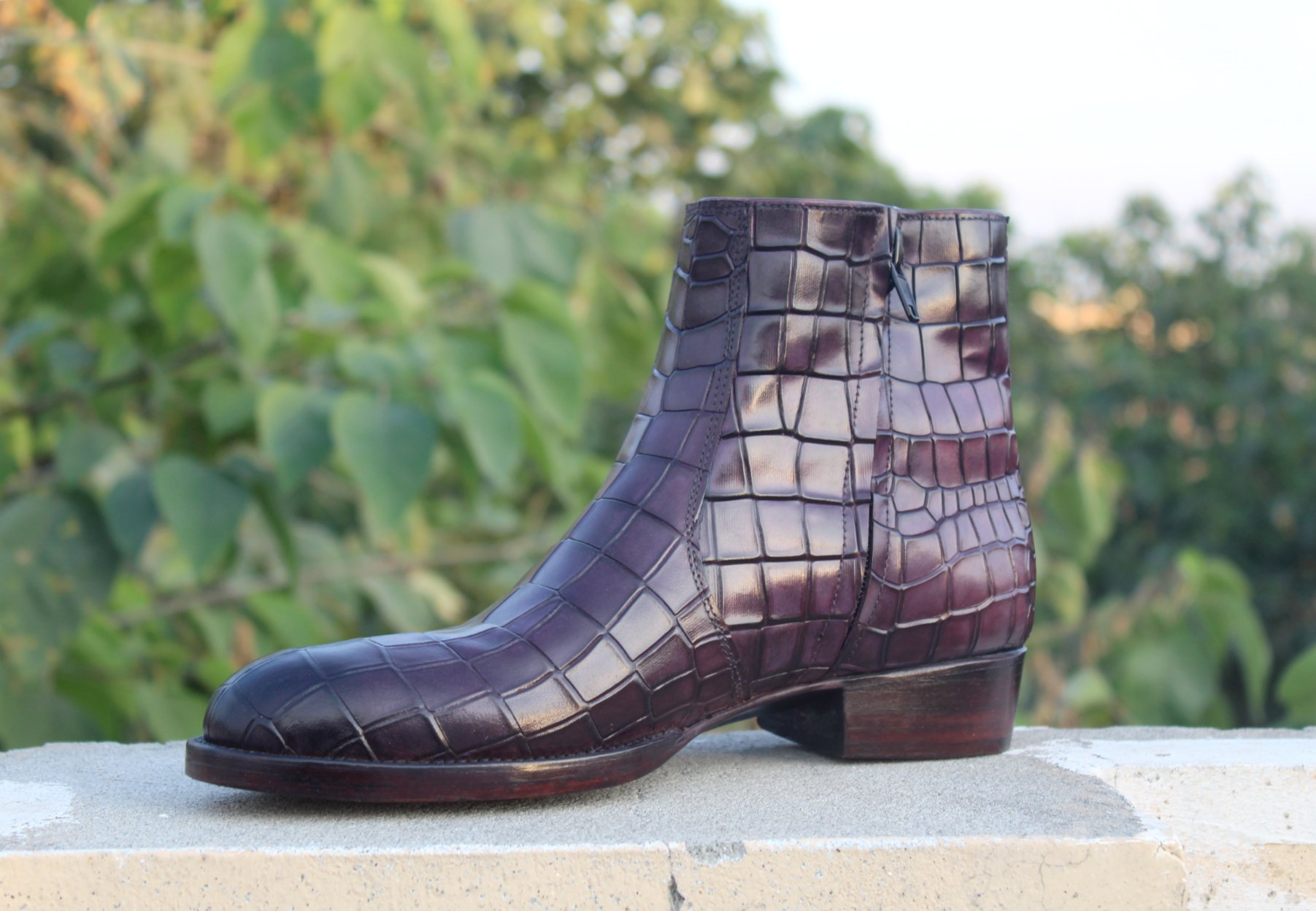 Crafted Leather Classic Dress Shoes Purple Patina Leather Ankle High Side Zipper Boot
